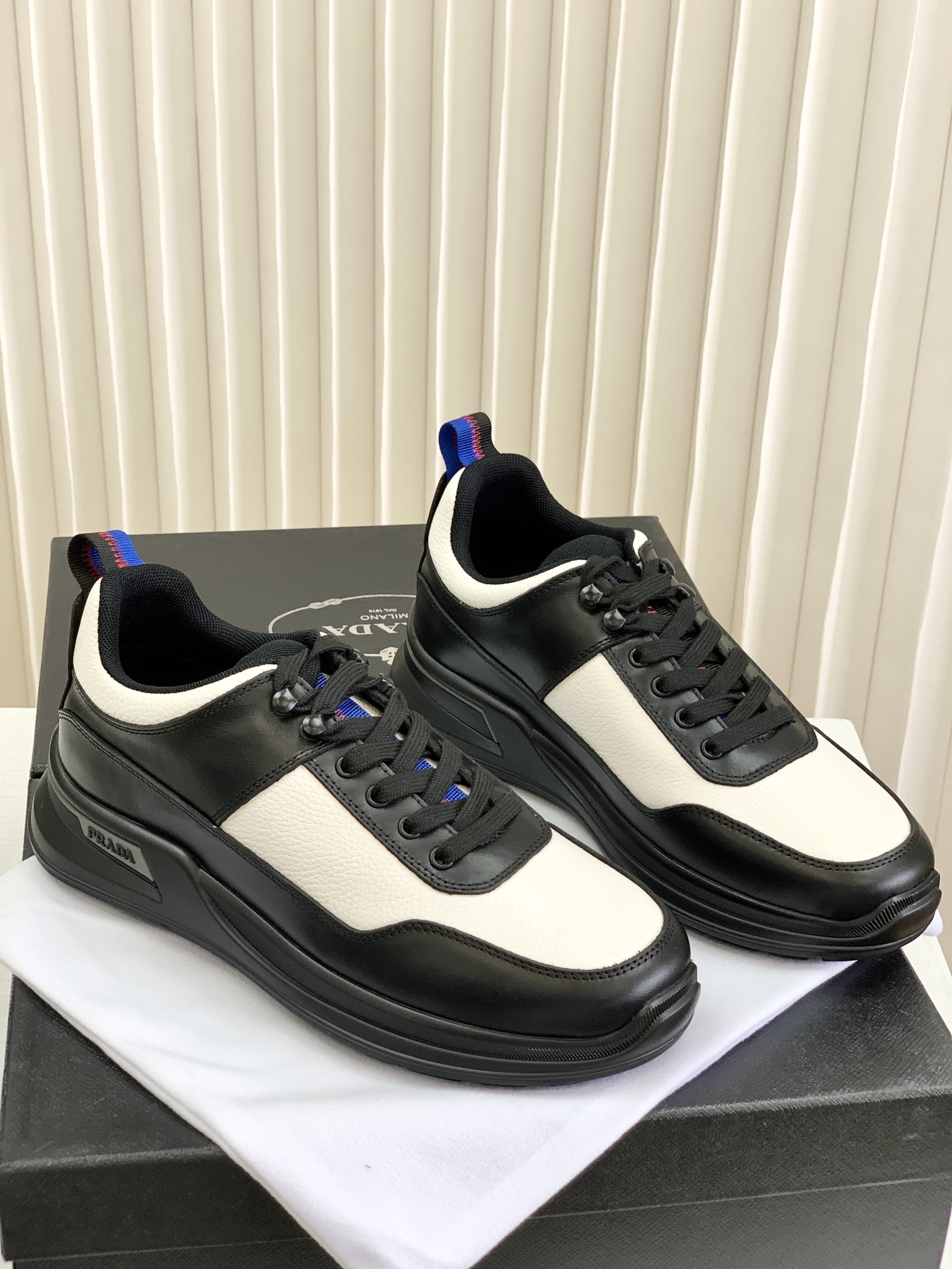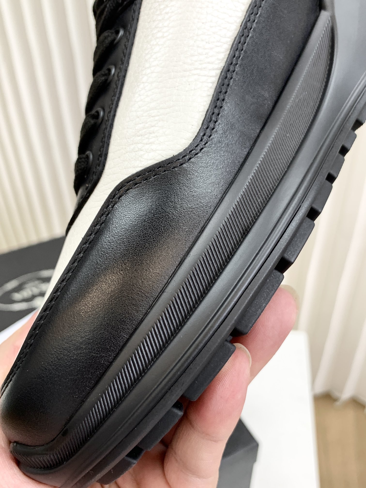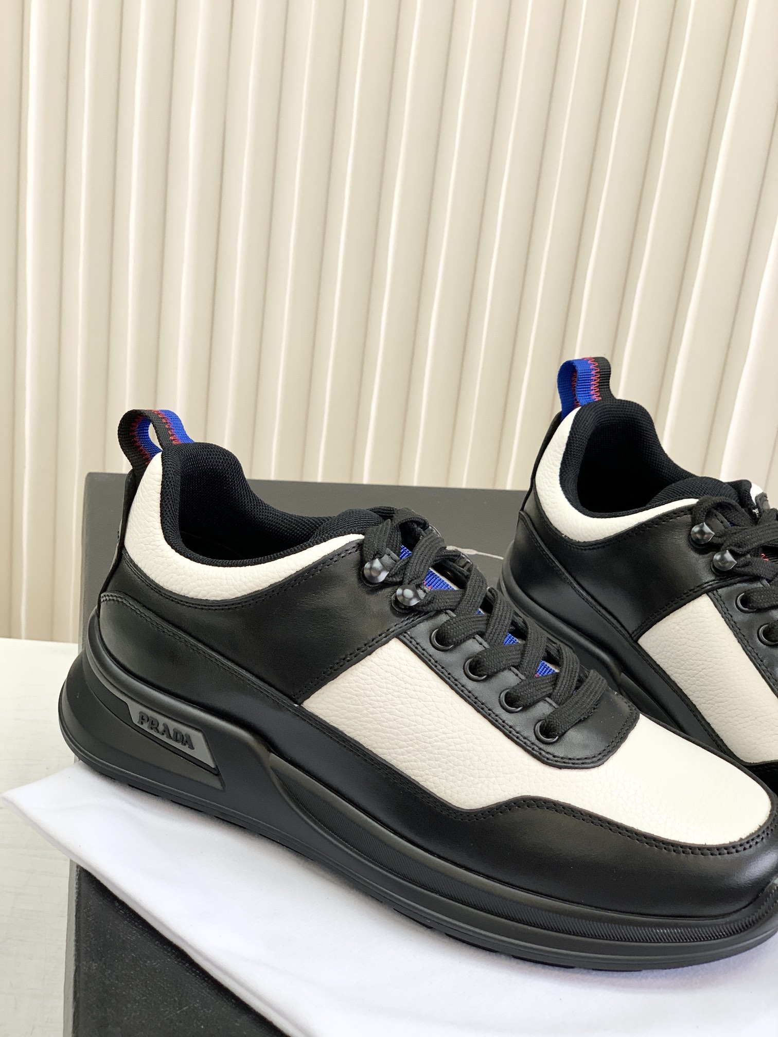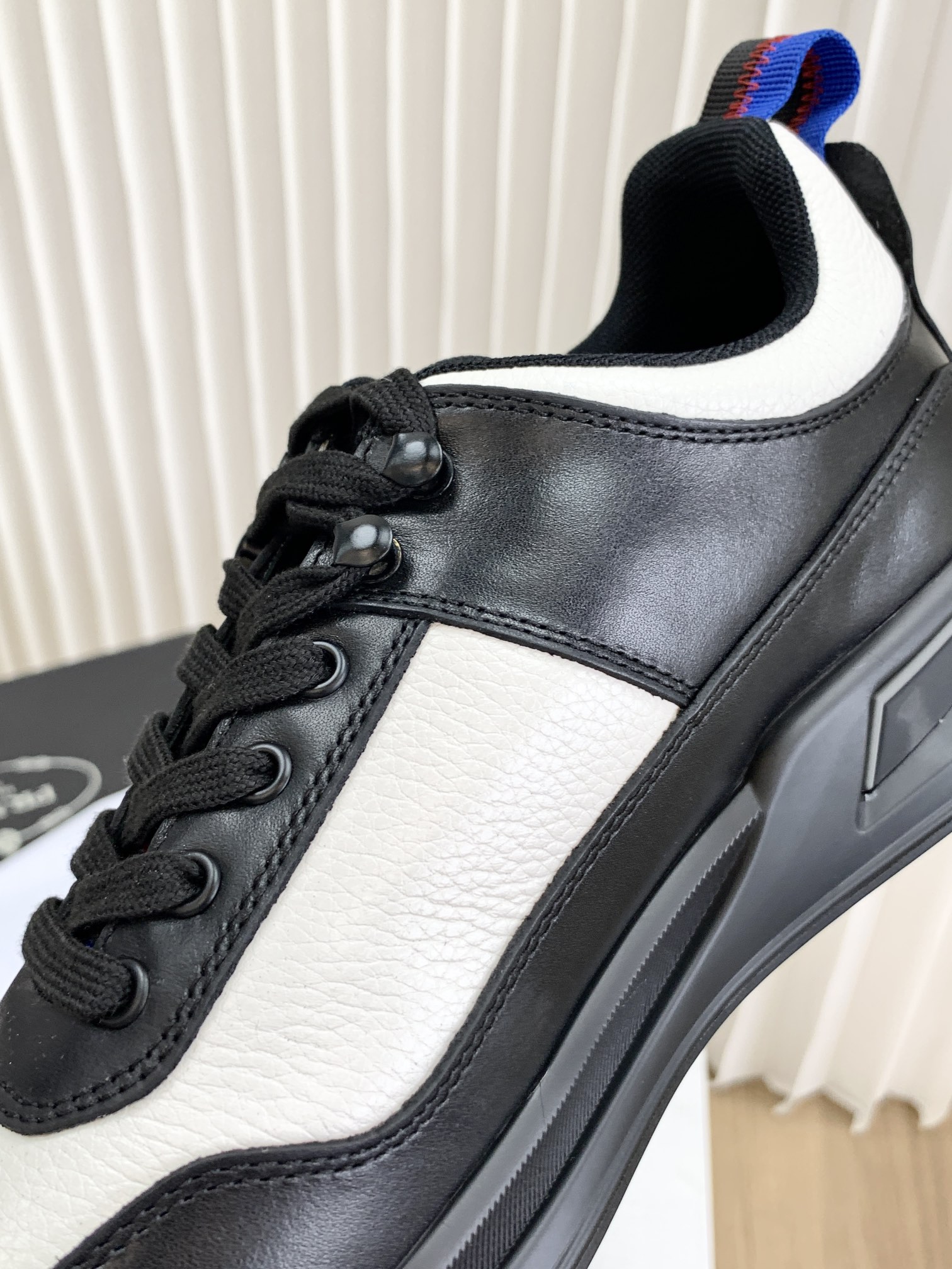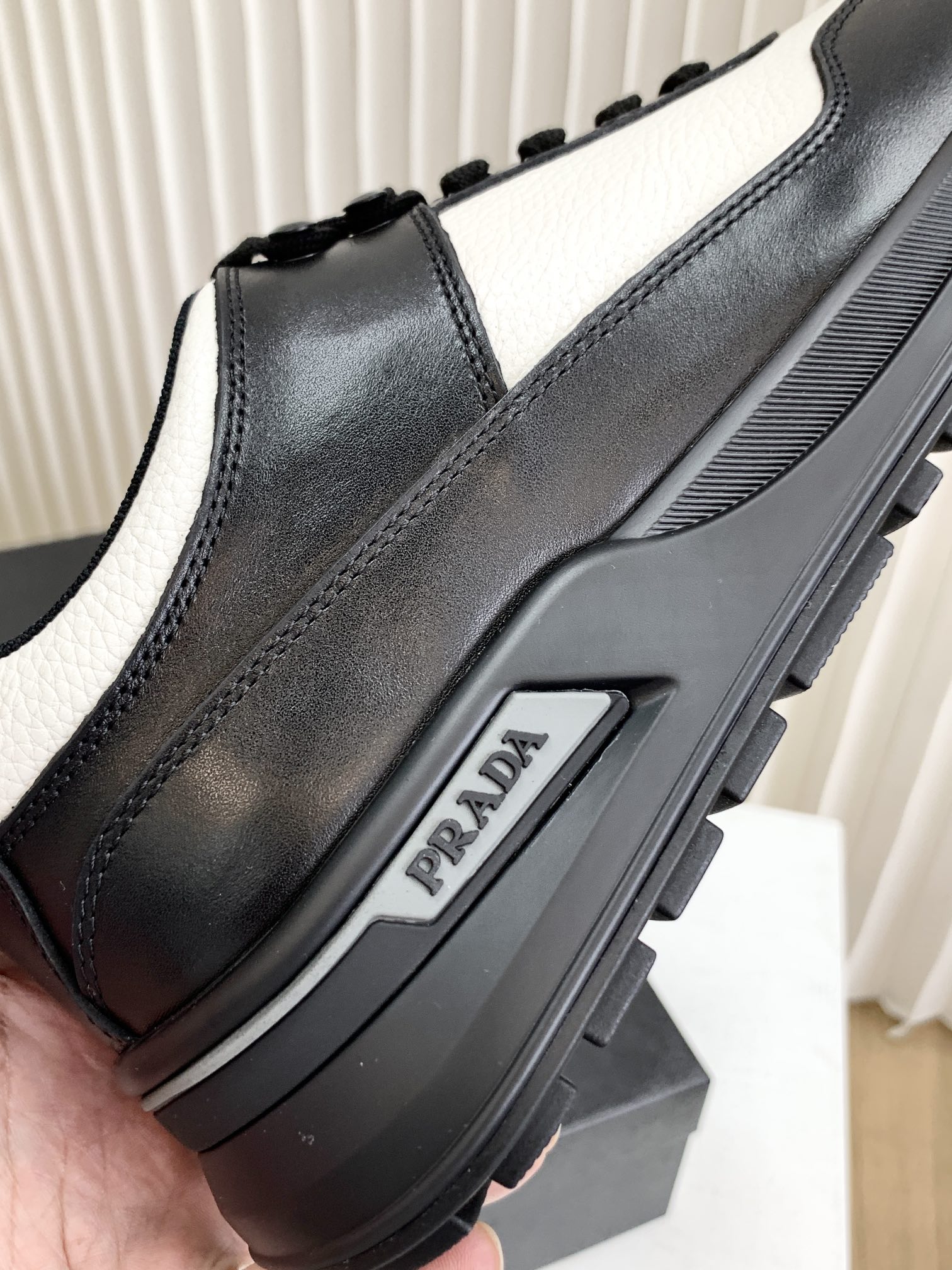P**rada,正单,顶级,官网同步,2025最新款,男士商务休闲运动鞋‼️ 这款运动鞋采用光滑小牛皮拼接荔枝纹牛皮,现代简约风格,舒适透气,实用百搭,配以全金属珐琅鞋眼棉鞋带,鞋舌饰以撞色织带,与后跟鞋提拉袢相呼应,搭配4cm轻便的凸纹橡胶鞋底,外侧饰有Prada徽标细节,织物透气内里,品牌徽标牛皮垫脚,缔造舒适的穿着体验!