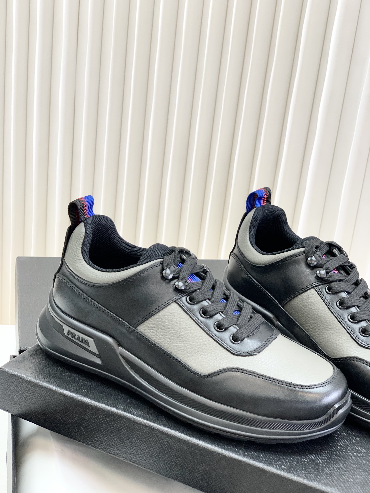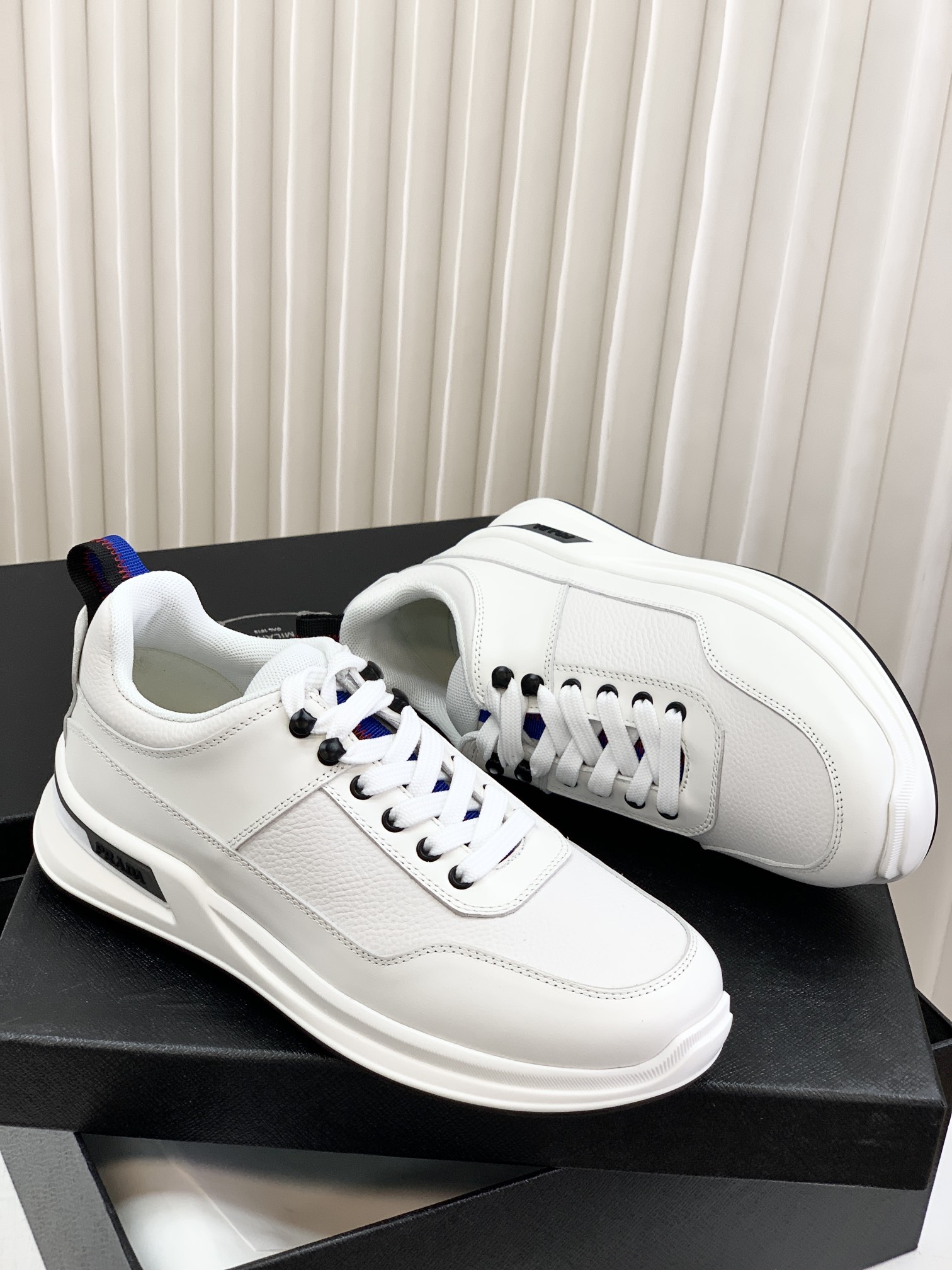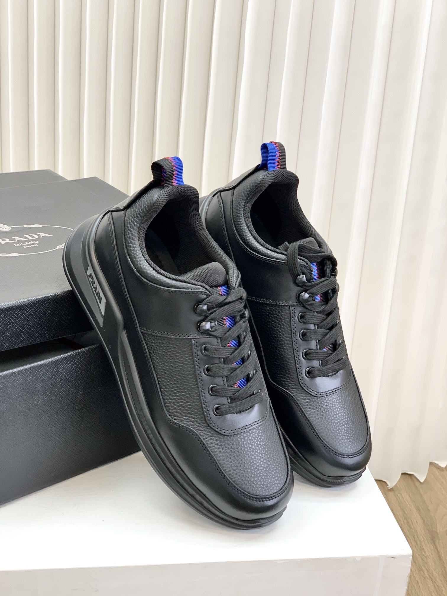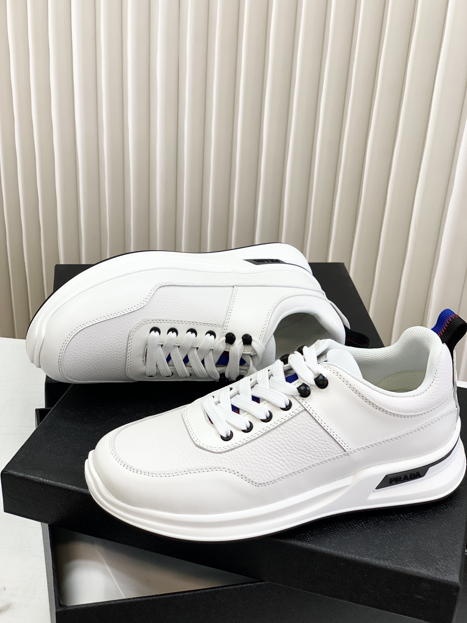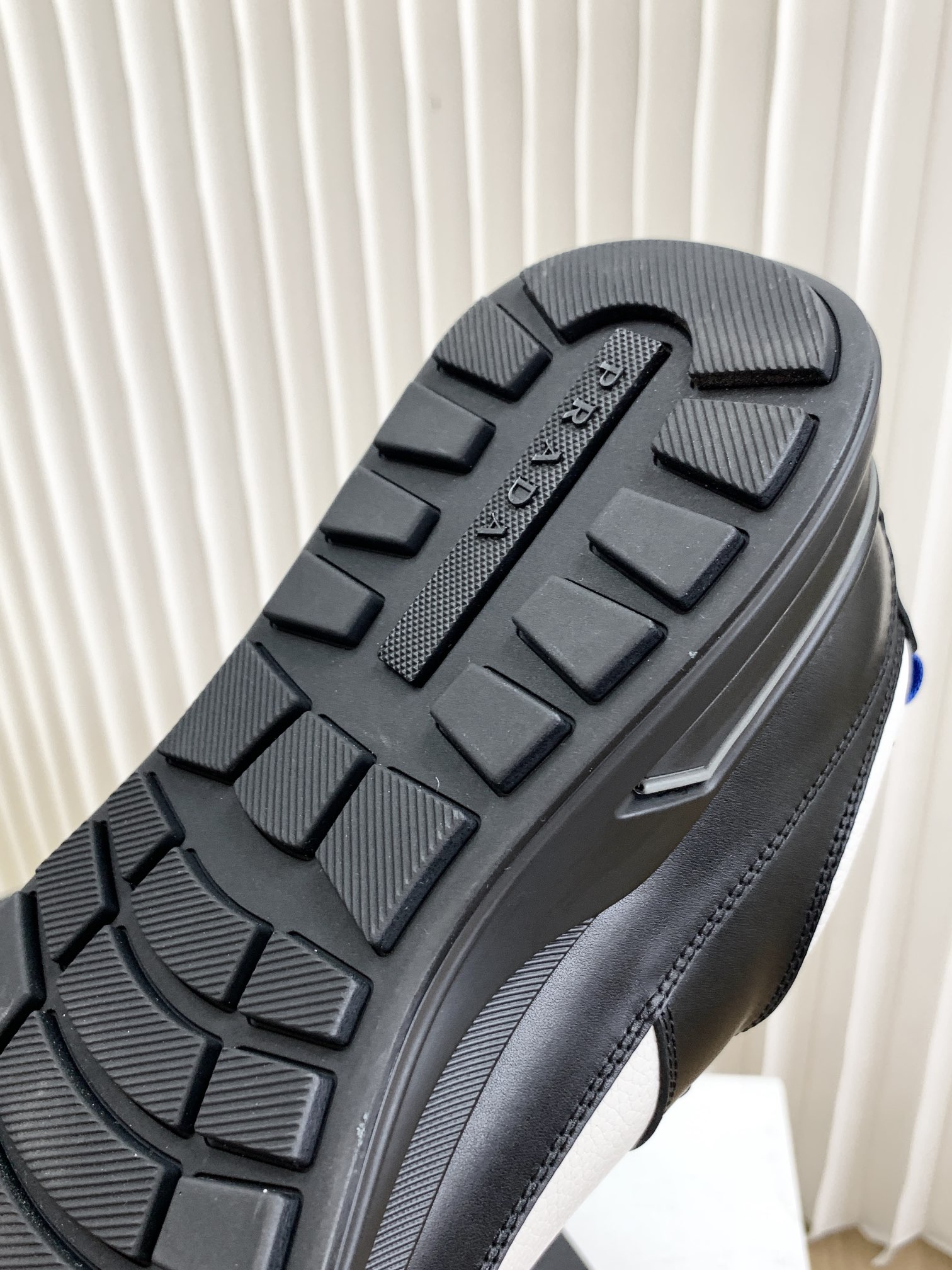 P**rada,正单,顶级,官网同步,2025最新款,男士商务休闲运动鞋‼️ 这款运动鞋采用光滑小牛皮拼接荔枝纹牛皮,现代简约风格,舒适透气,实用百搭,配以全金属珐琅鞋眼棉鞋带,鞋舌饰以撞色织带,与后跟鞋提拉袢相呼应,搭配4cm轻便的凸纹橡胶鞋底,外侧饰有Prada徽标细节,织物透气内里,品牌徽标牛皮垫脚,缔造舒适的穿着体验!