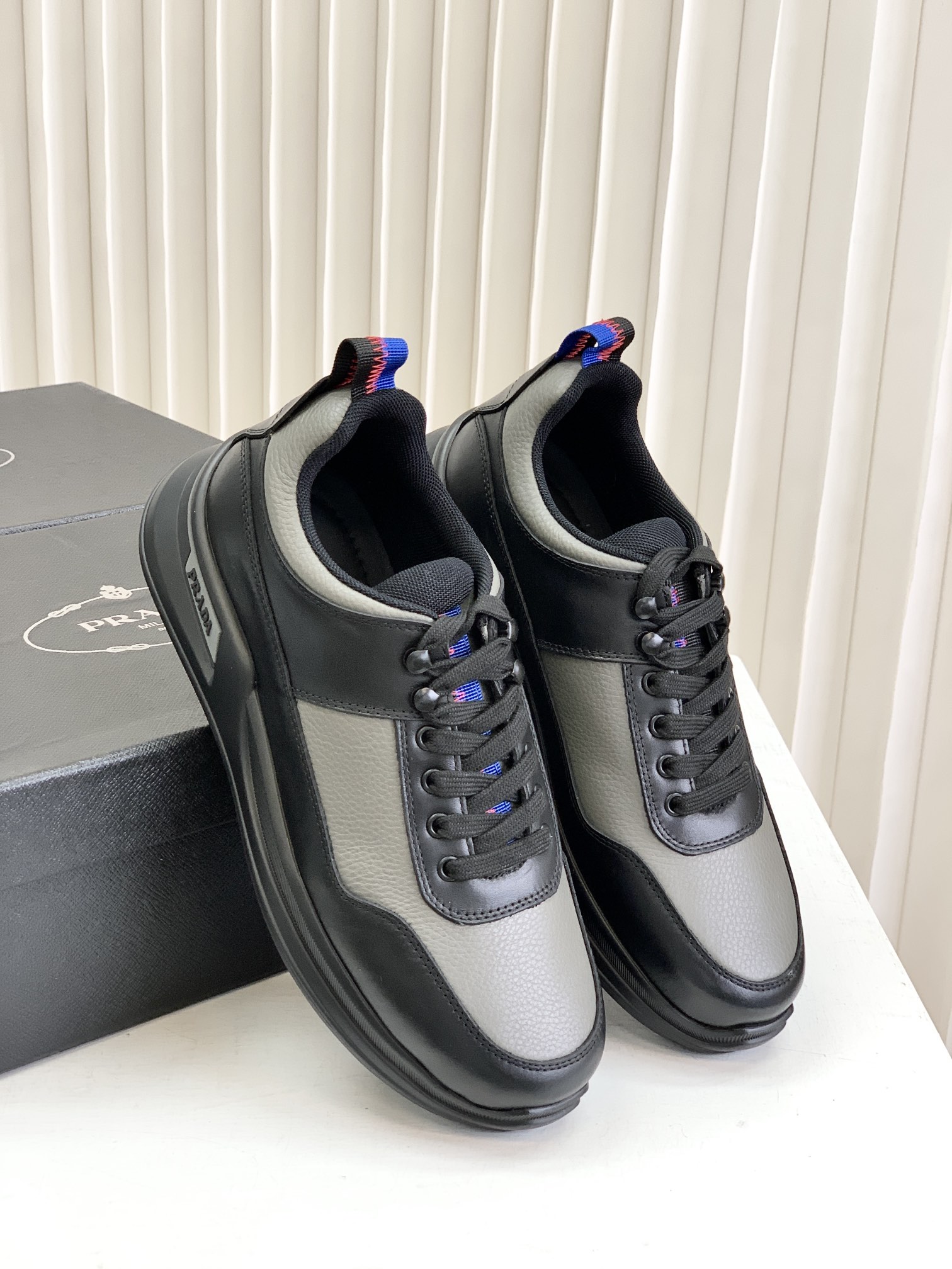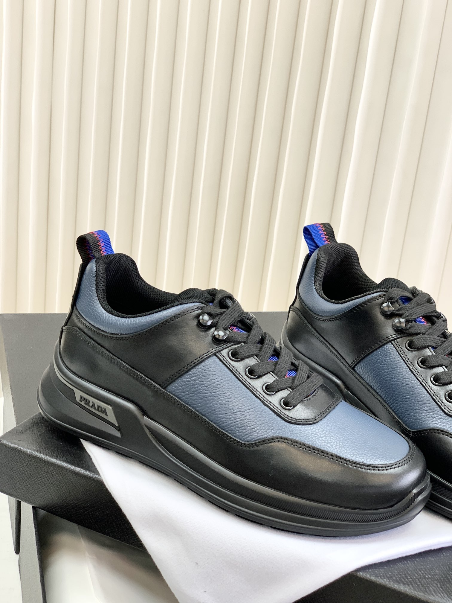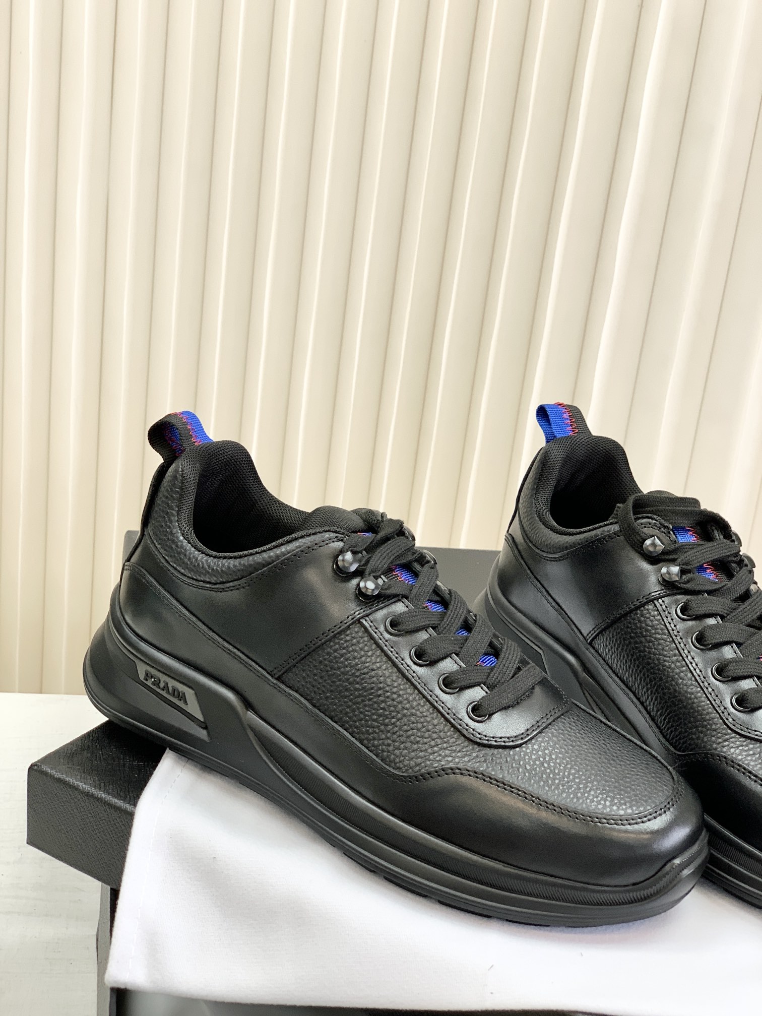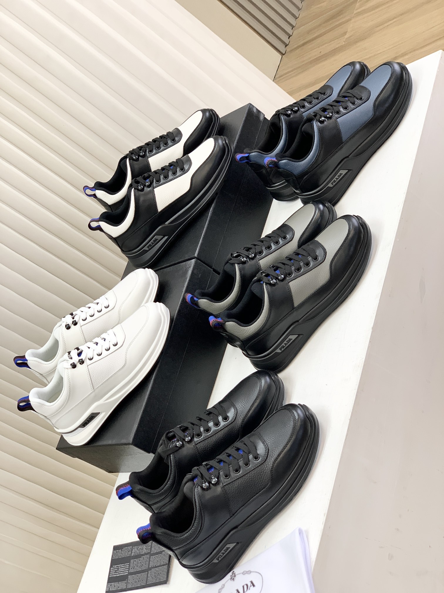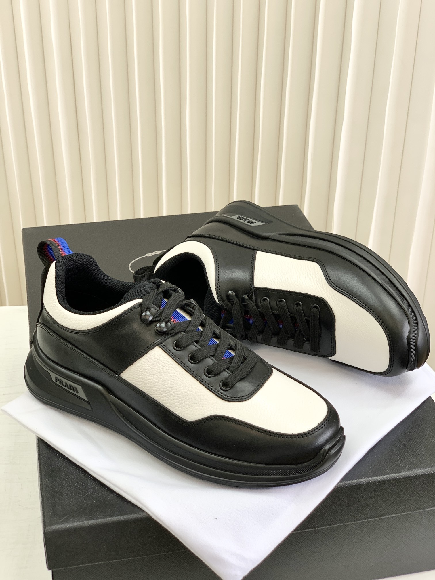 P**rada,正单,顶级,官网同步,2025最新款,男士商务休闲运动鞋‼️ 这款运动鞋采用光滑小牛皮拼接荔枝纹牛皮,现代简约风格,舒适透气,实用百搭,配以全金属珐琅鞋眼棉鞋带,鞋舌饰以撞色织带,与后跟鞋提拉袢相呼应,搭配4cm轻便的凸纹橡胶鞋底,外侧饰有Prada徽标细节,织物透气内里,品牌徽标牛皮垫脚,缔造舒适的穿着体验!