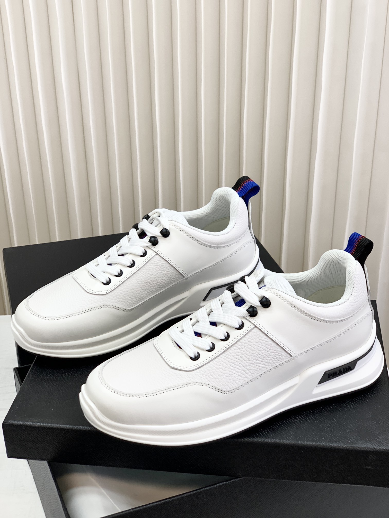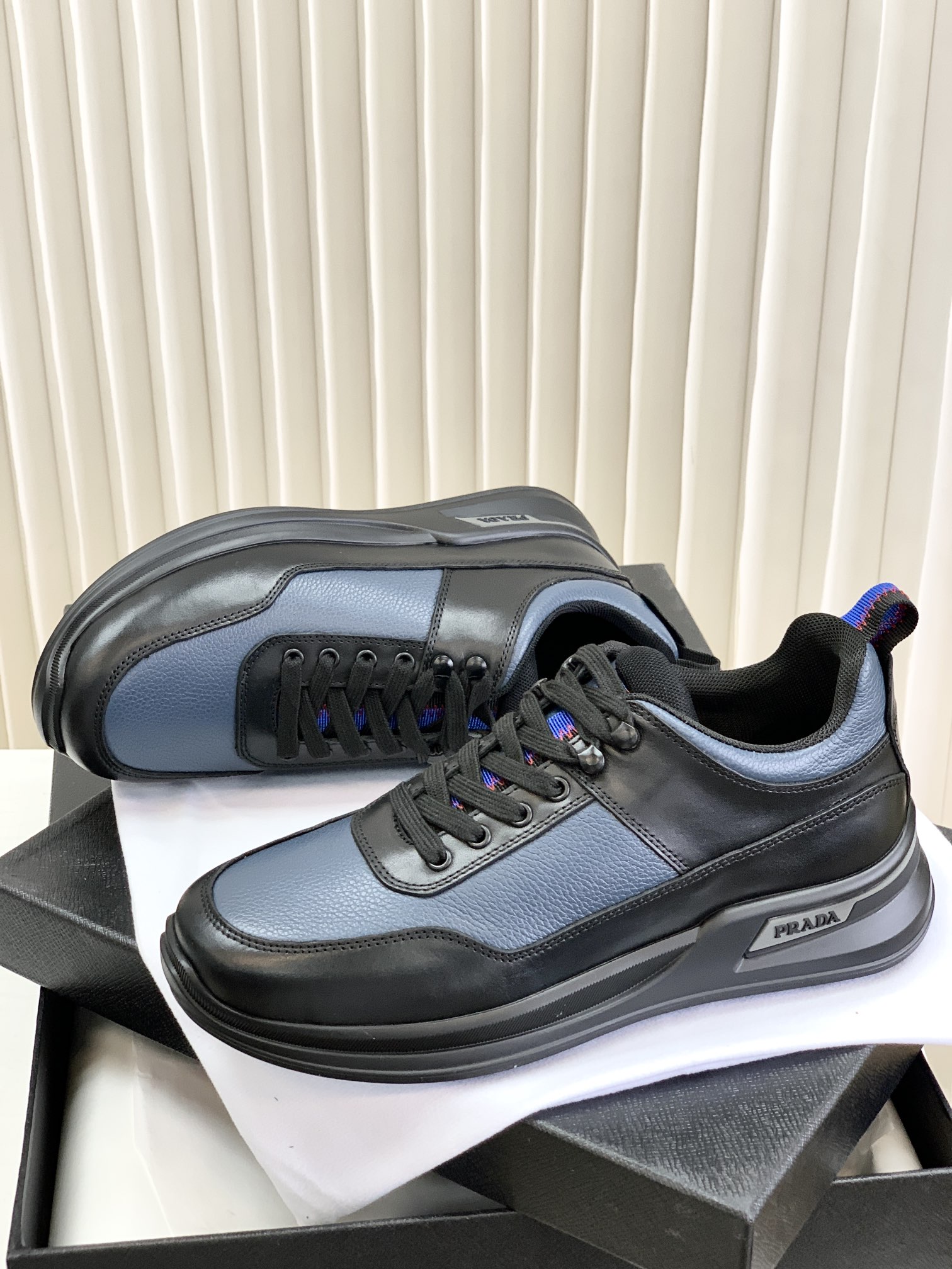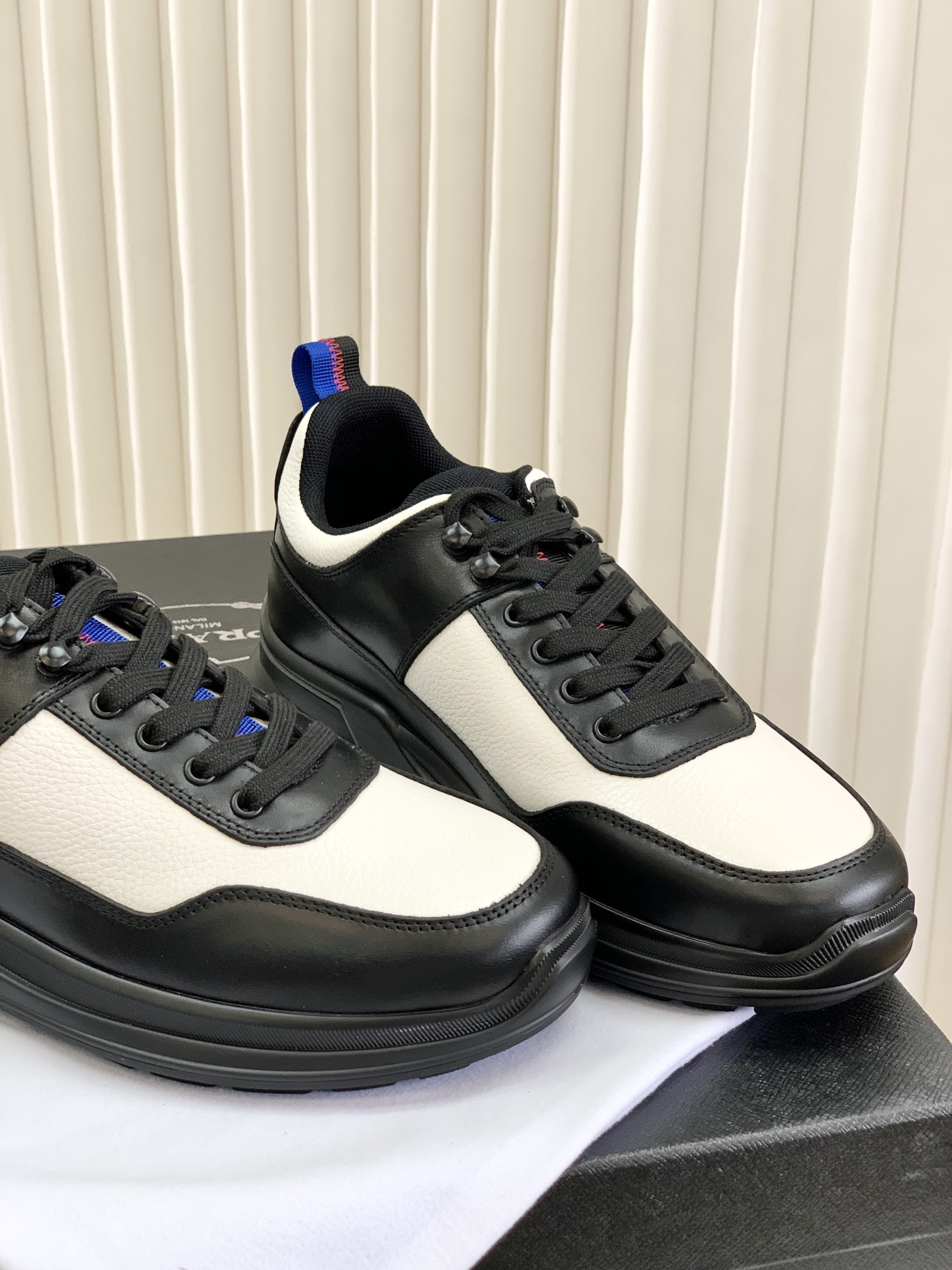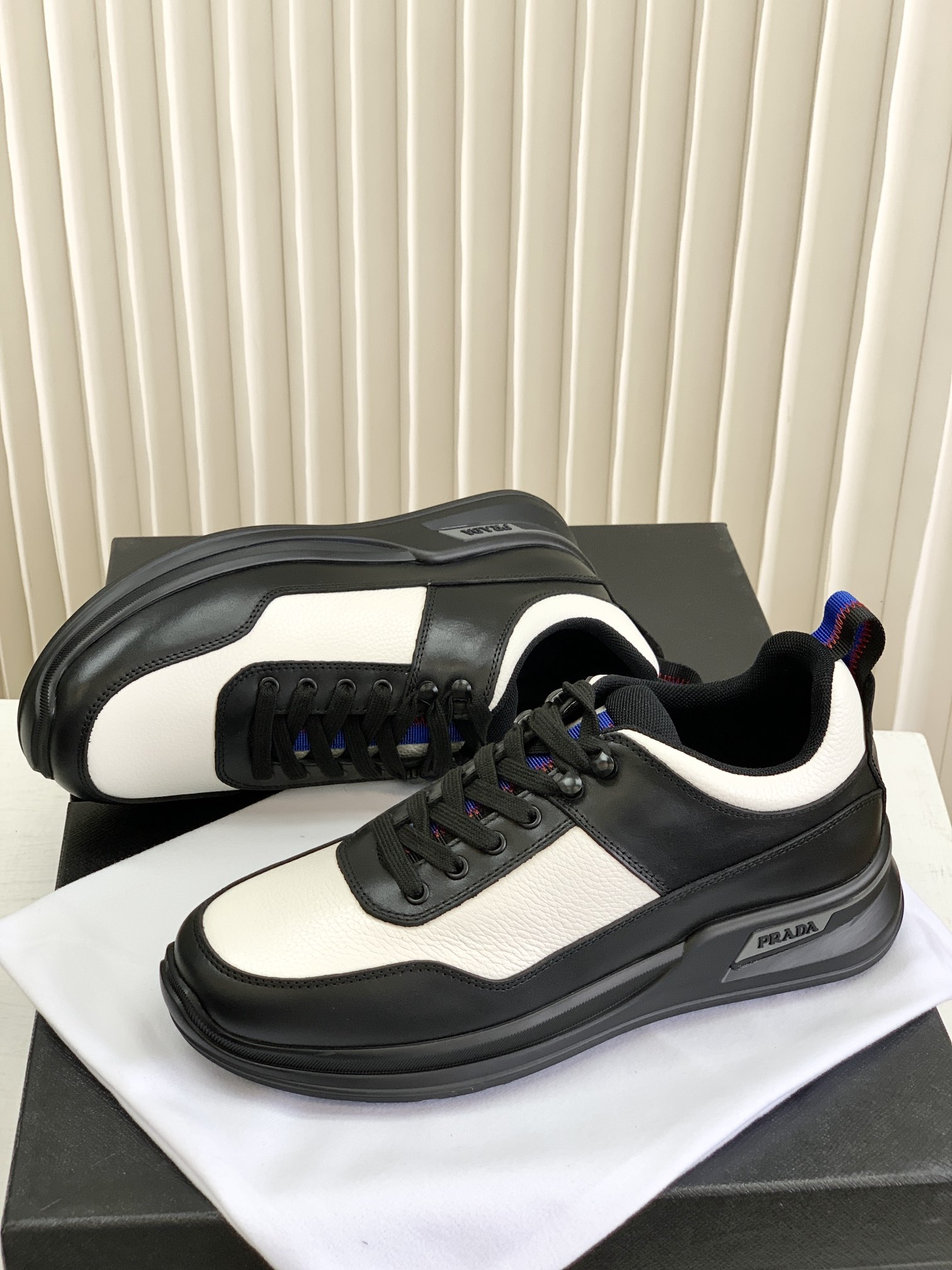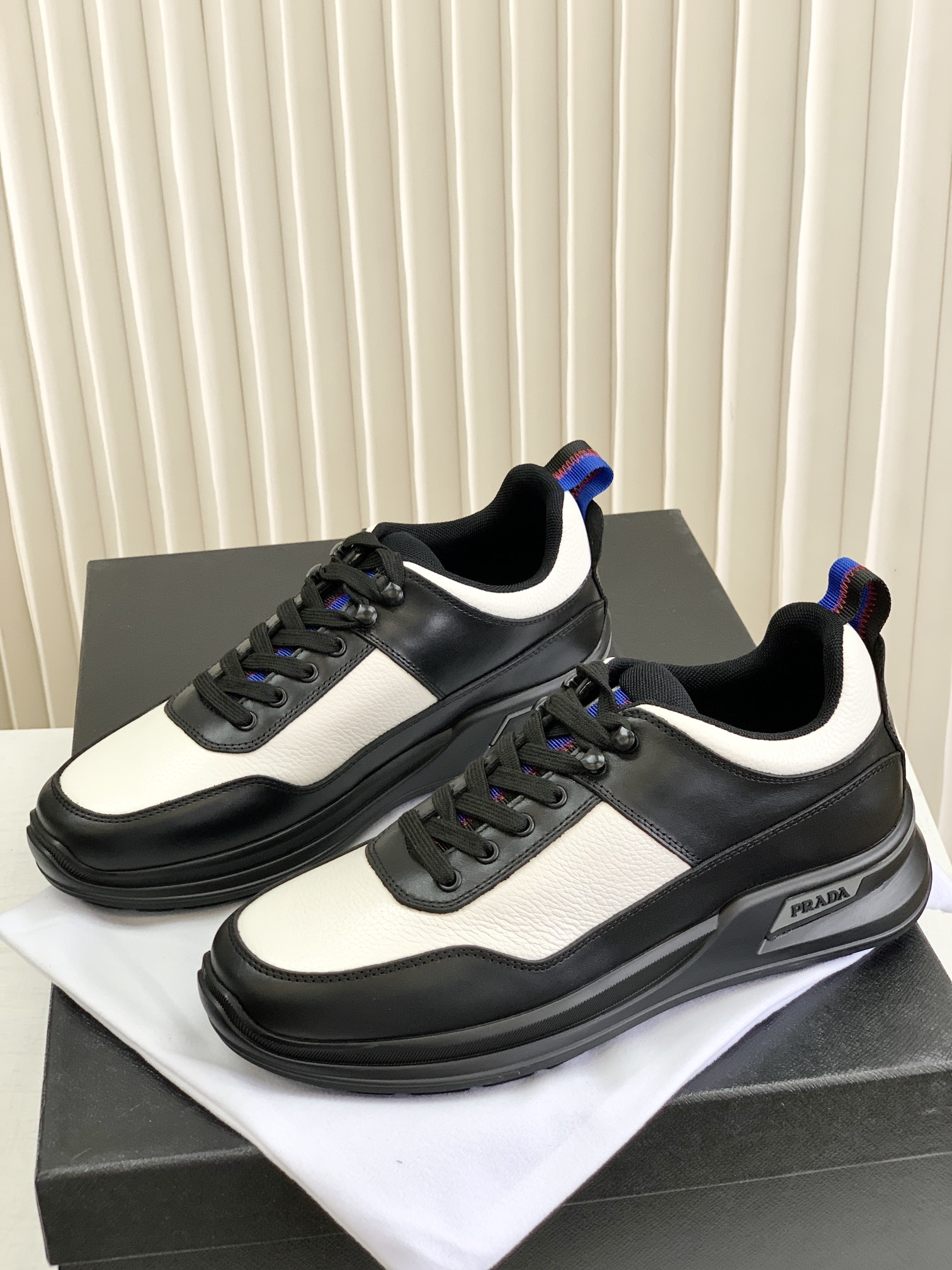 P**rada,正单,顶级,官网同步,2025最新款,男士商务休闲运动鞋‼️ 这款运动鞋采用光滑小牛皮拼接荔枝纹牛皮,现代简约风格,舒适透气,实用百搭,配以全金属珐琅鞋眼棉鞋带,鞋舌饰以撞色织带,与后跟鞋提拉袢相呼应,搭配4cm轻便的凸纹橡胶鞋底,外侧饰有Prada徽标细节,织物透气内里,品牌徽标牛皮垫脚,缔造舒适的穿着体验!