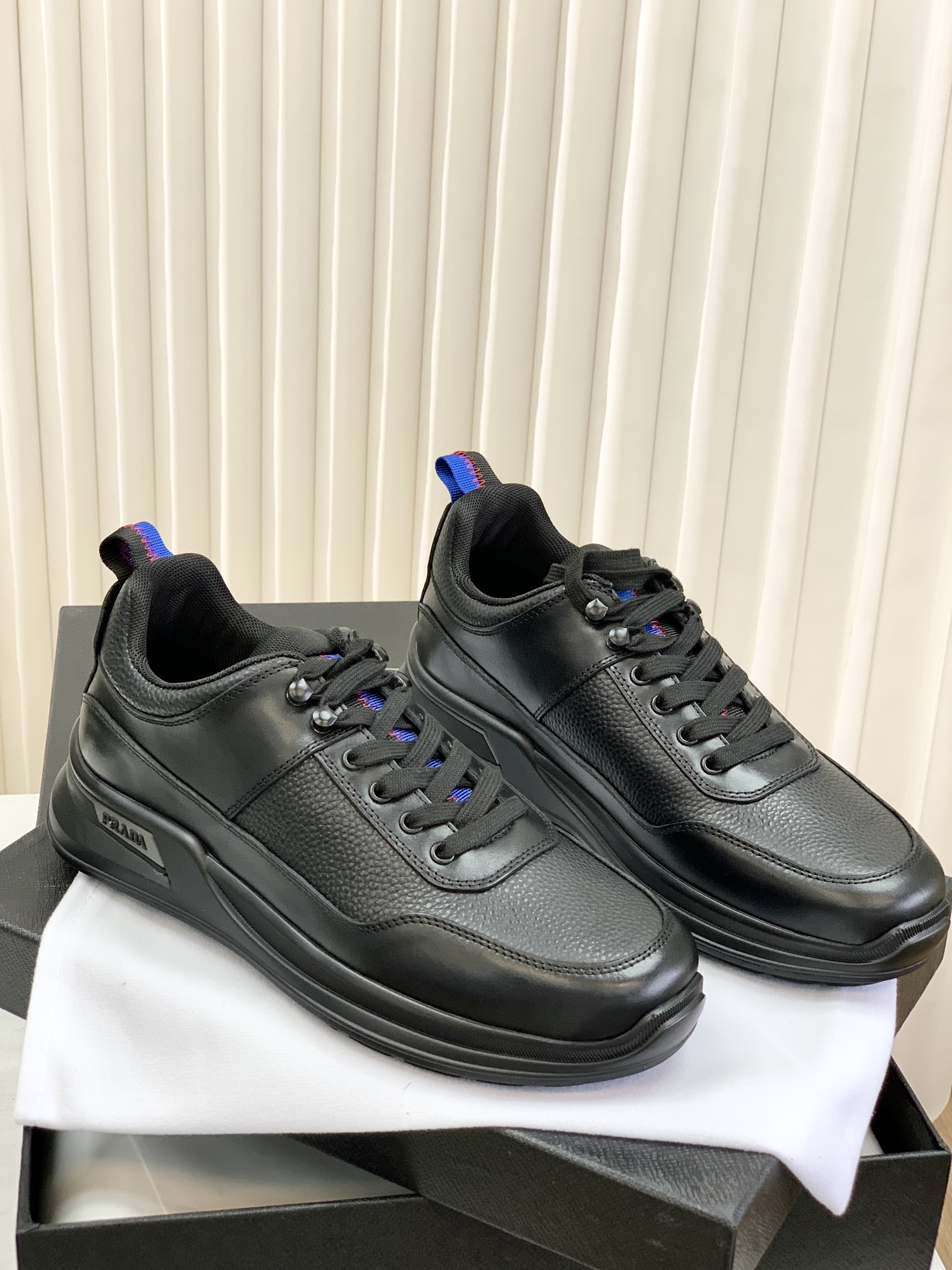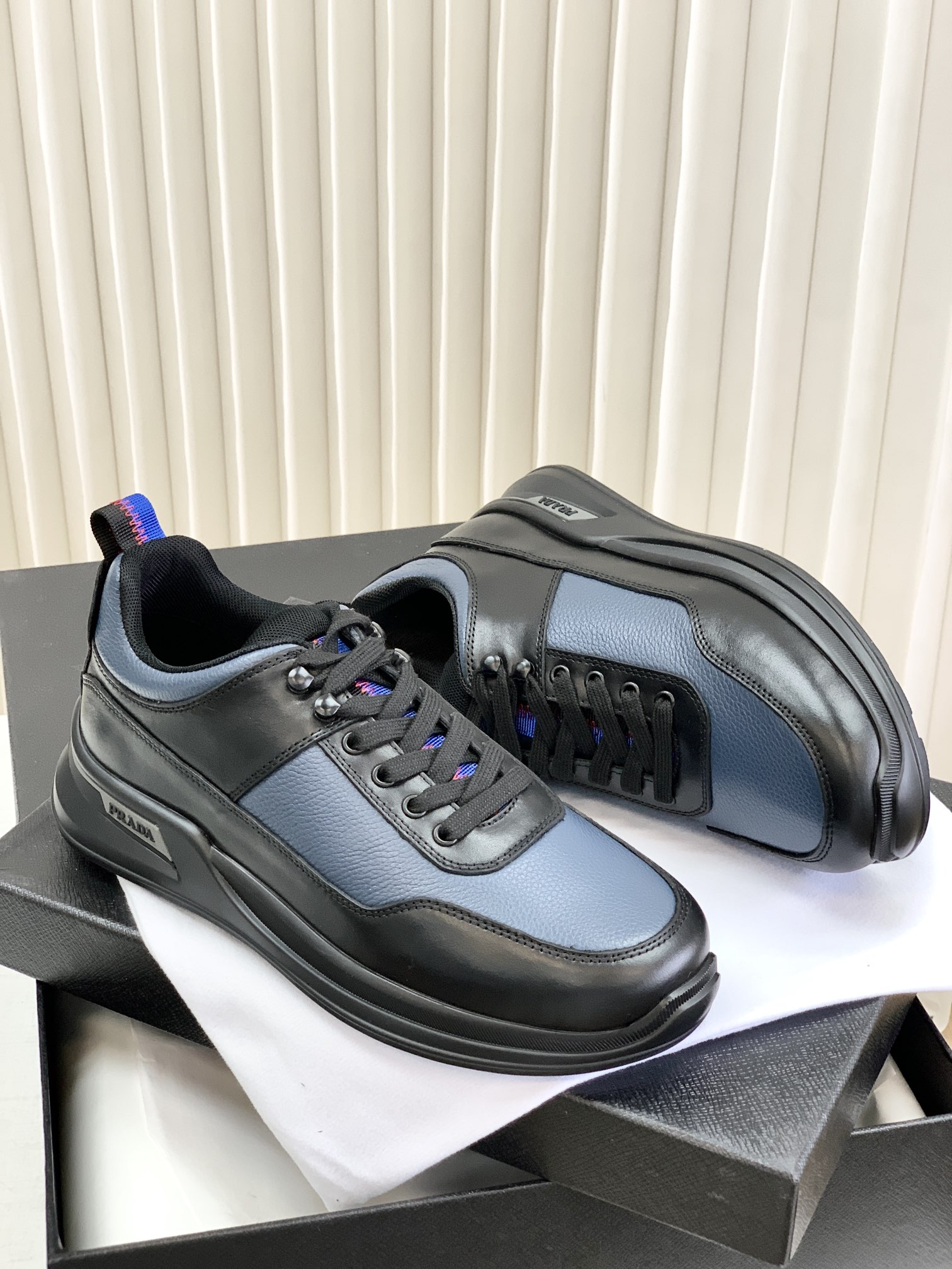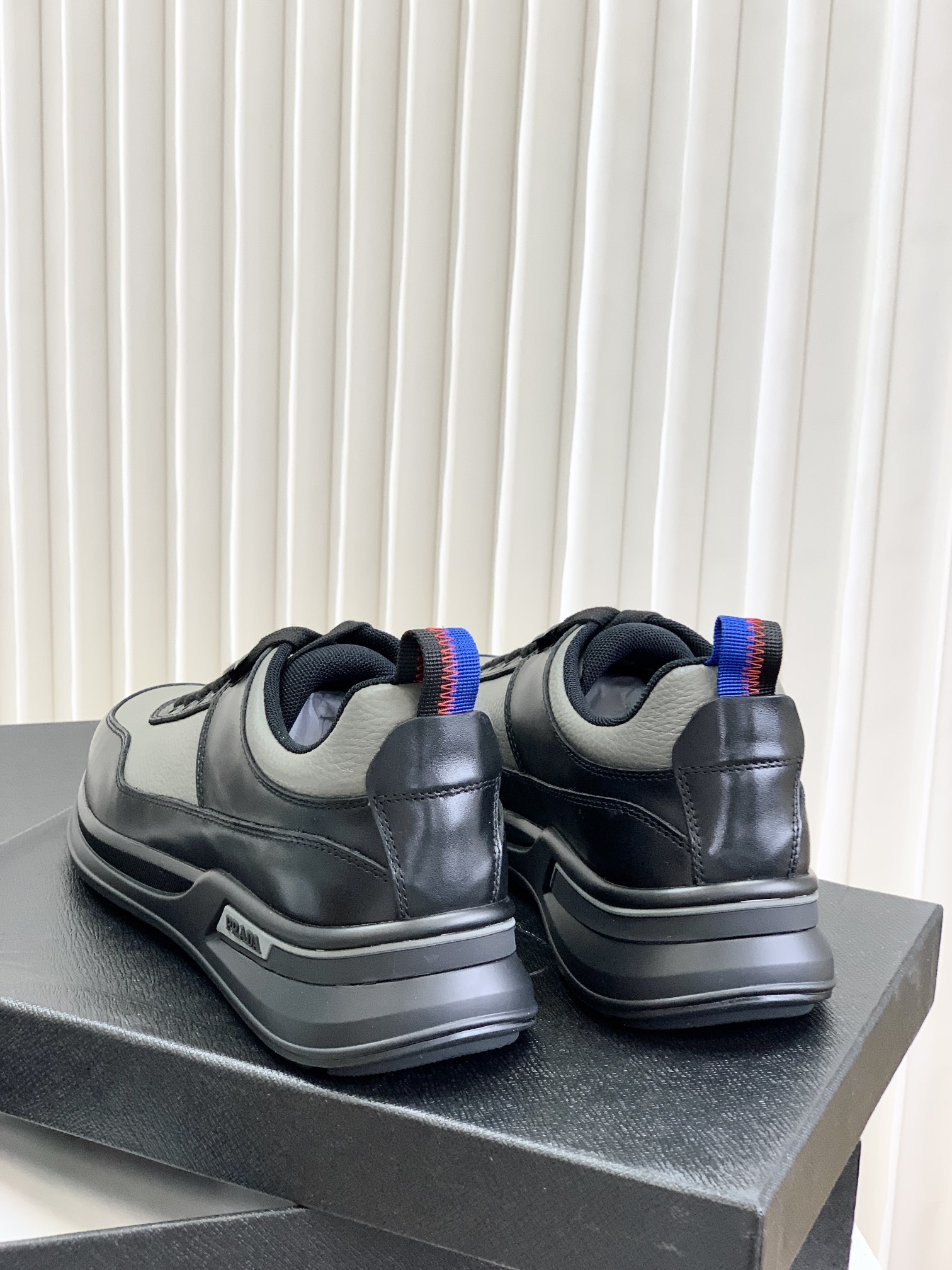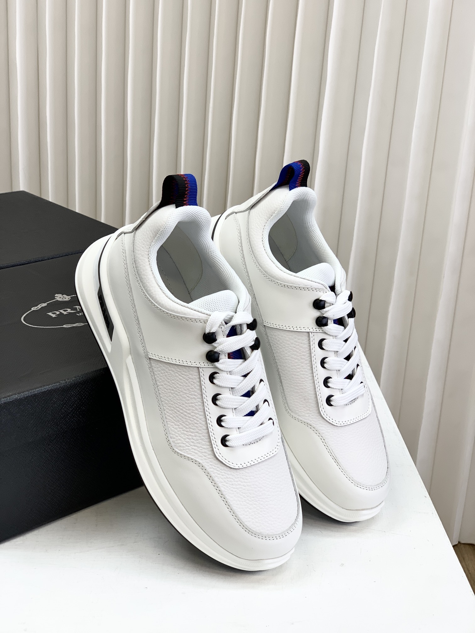 P**rada,正单,顶级,官网同步,2025最新款,男士商务休闲运动鞋‼️ 这款运动鞋采用光滑小牛皮拼接荔枝纹牛皮,现代简约风格,舒适透气,实用百搭,配以全金属珐琅鞋眼棉鞋带,鞋舌饰以撞色织带,与后跟鞋提拉袢相呼应,搭配4cm轻便的凸纹橡胶鞋底,外侧饰有Prada徽标细节,织物透气内里,品牌徽标牛皮垫脚,缔造舒适的穿着体验!