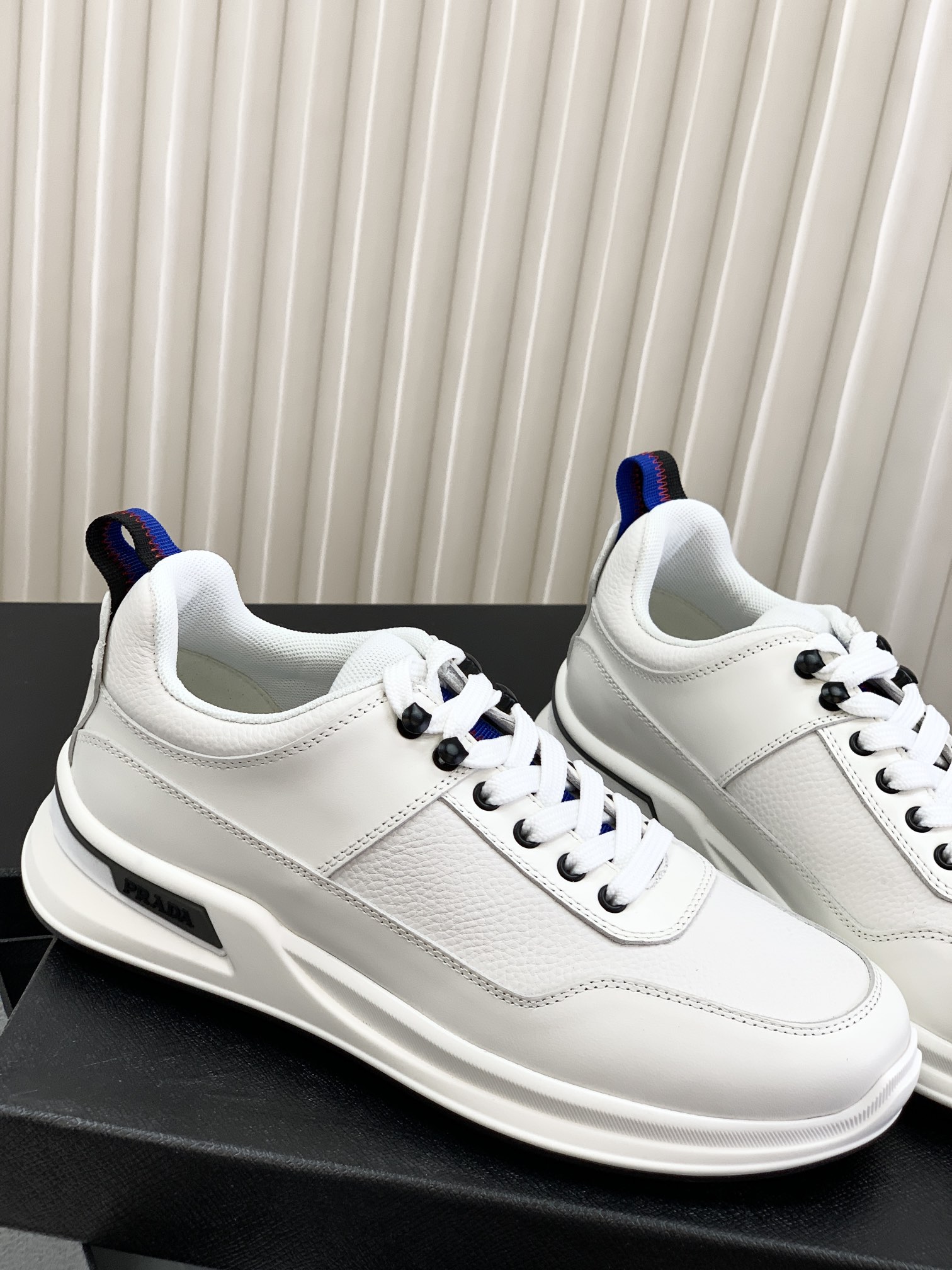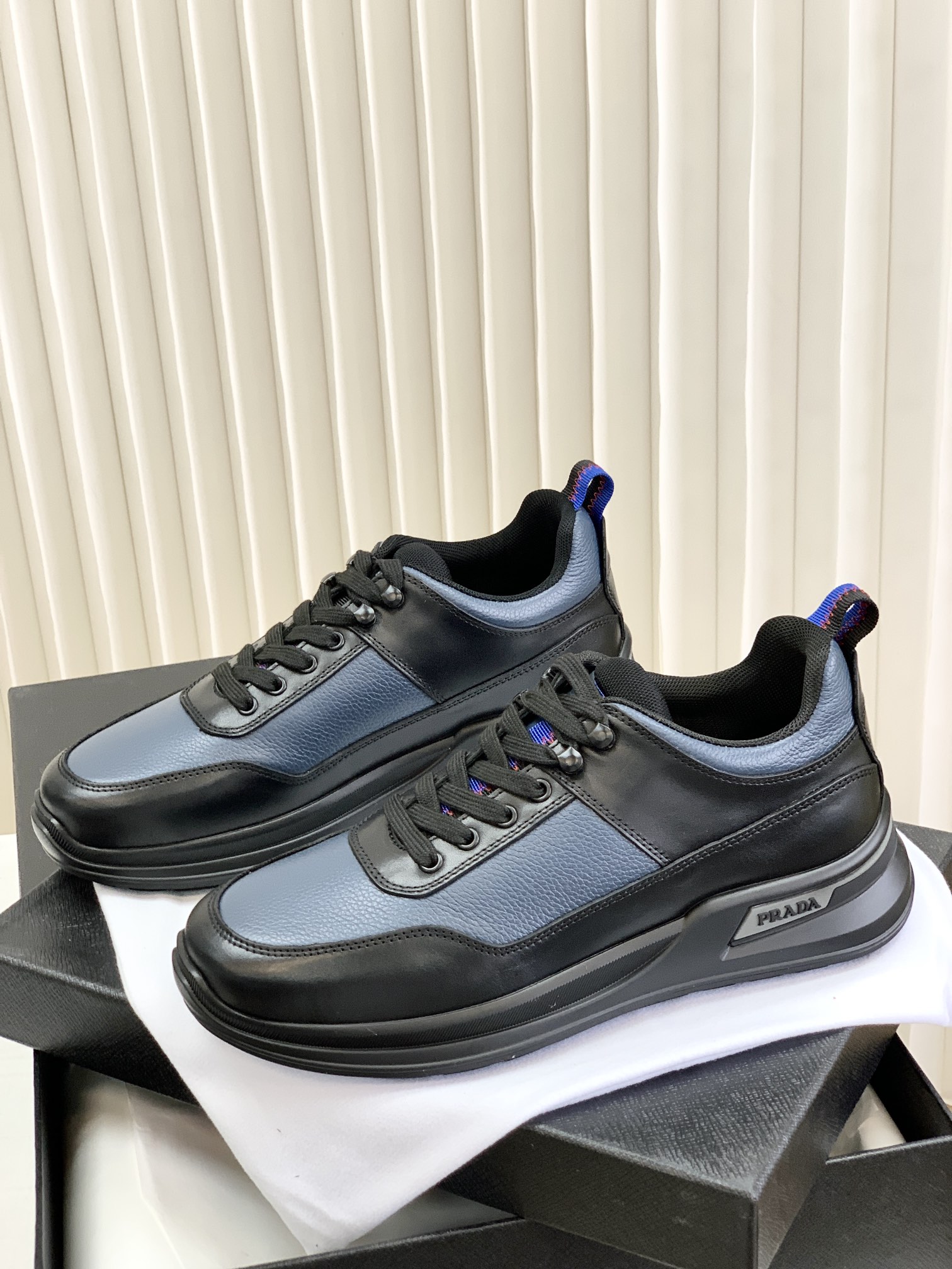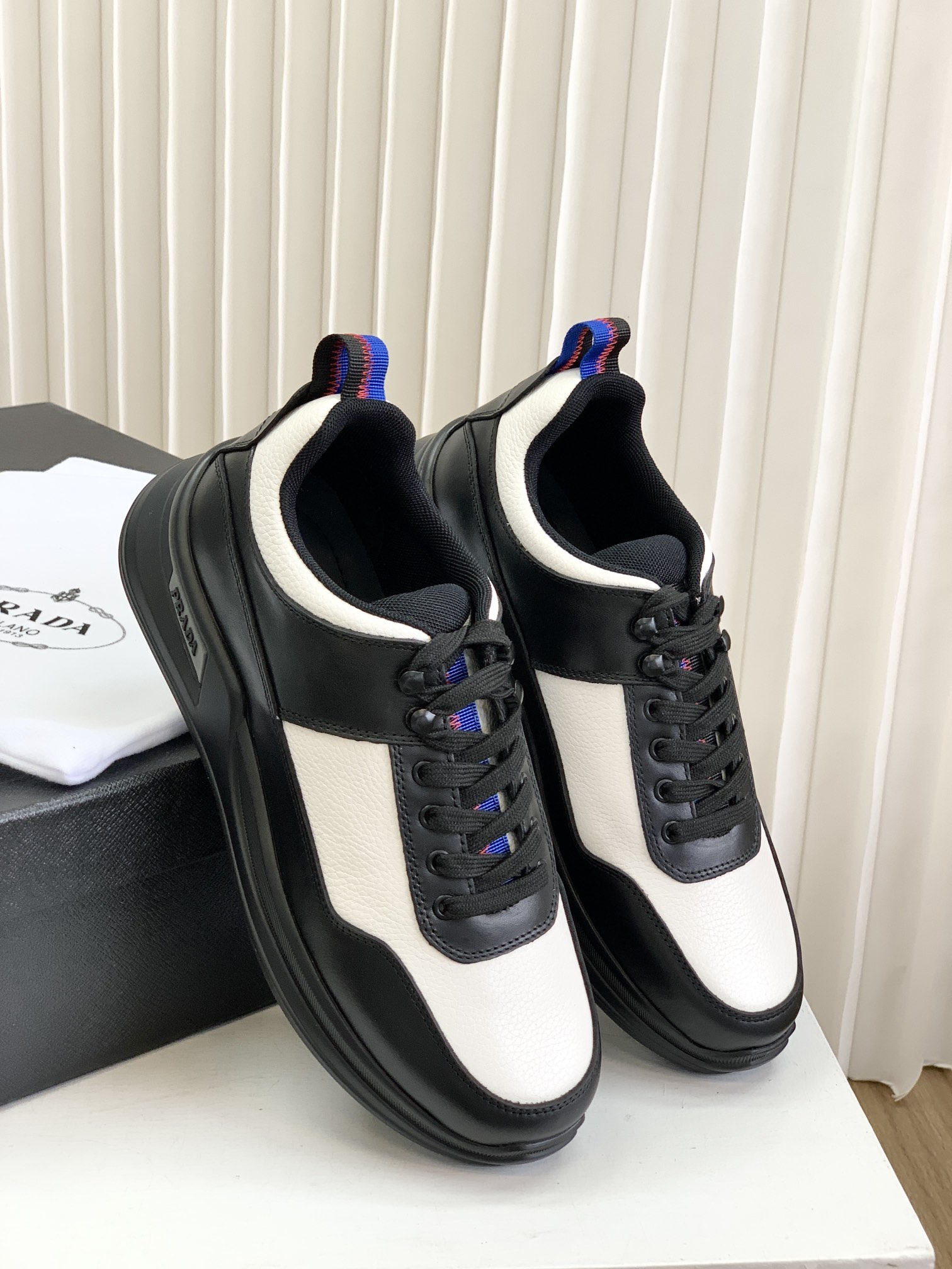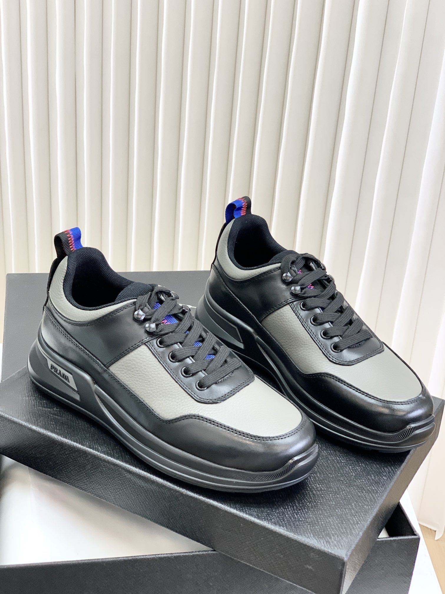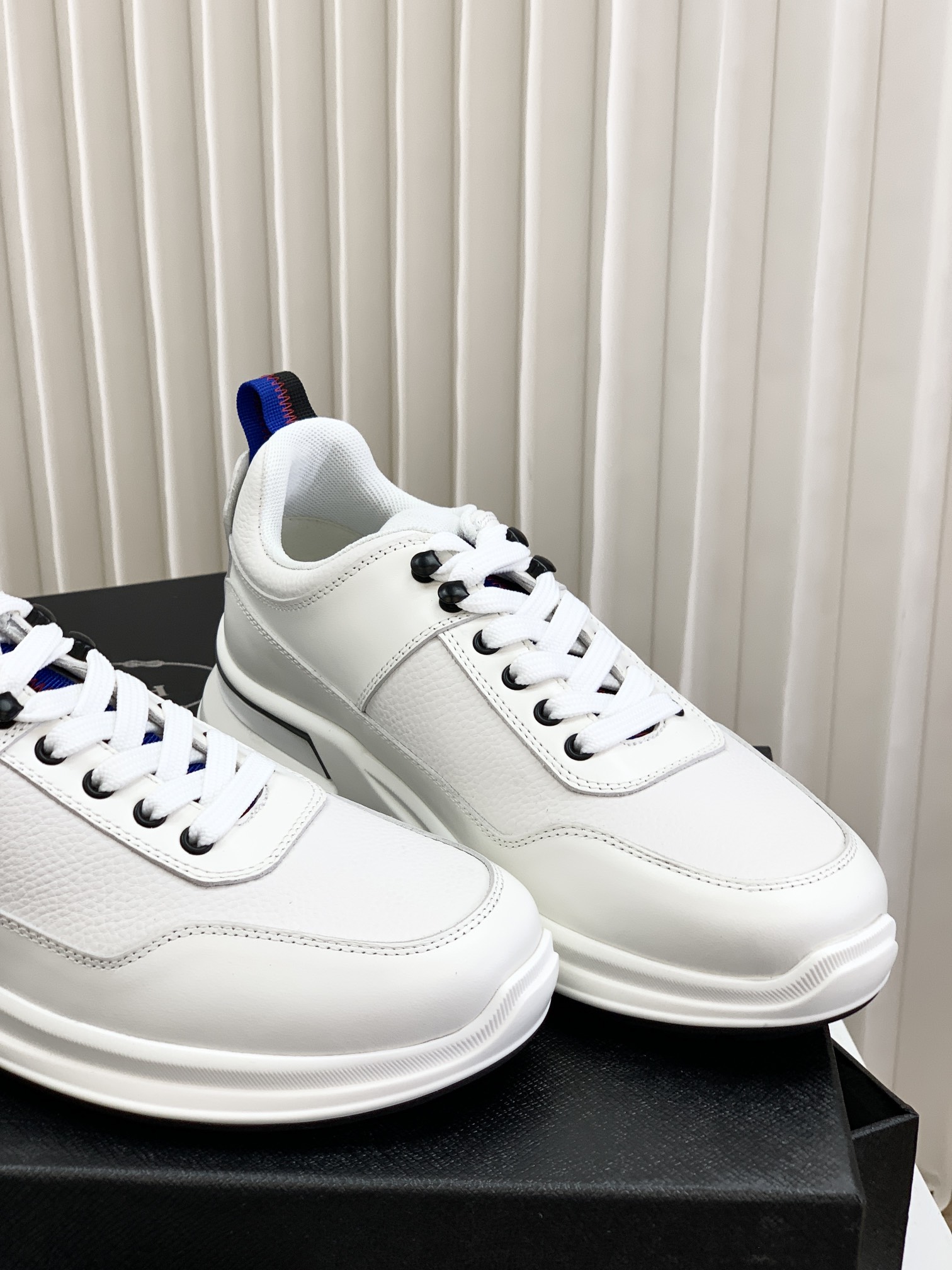 P**rada,正单,顶级,官网同步,2025最新款,男士商务休闲运动鞋‼️ 这款运动鞋采用光滑小牛皮拼接荔枝纹牛皮,现代简约风格,舒适透气,实用百搭,配以全金属珐琅鞋眼棉鞋带,鞋舌饰以撞色织带,与后跟鞋提拉袢相呼应,搭配4cm轻便的凸纹橡胶鞋底,外侧饰有Prada徽标细节,织物透气内里,品牌徽标牛皮垫脚,缔造舒适的穿着体验!