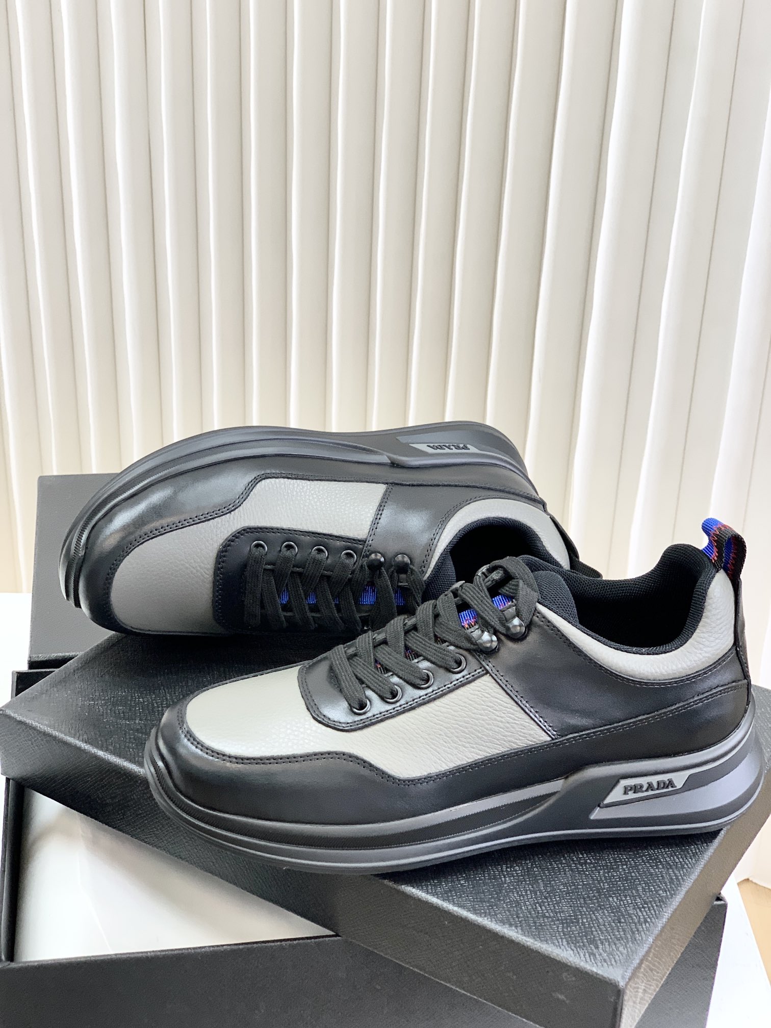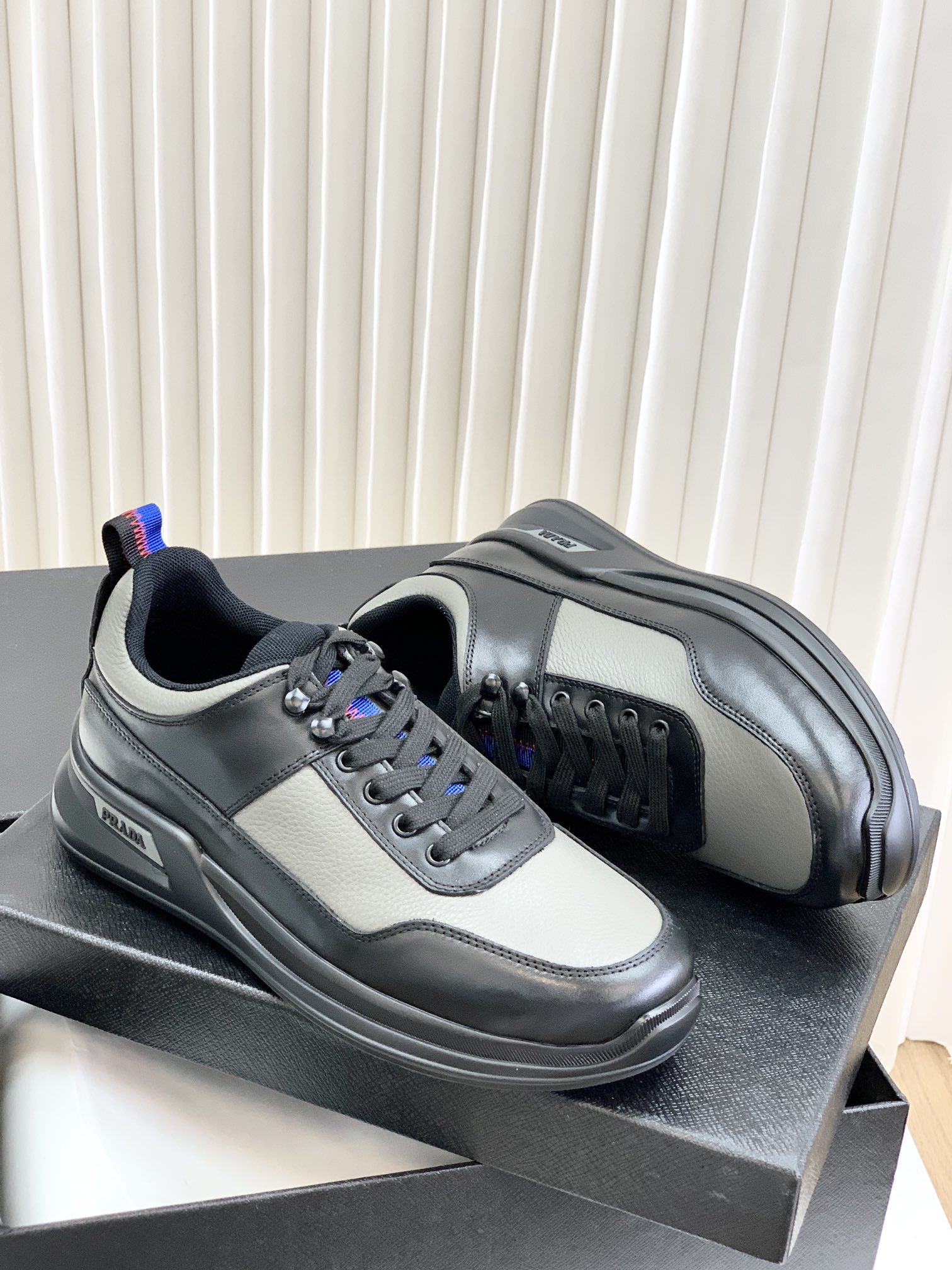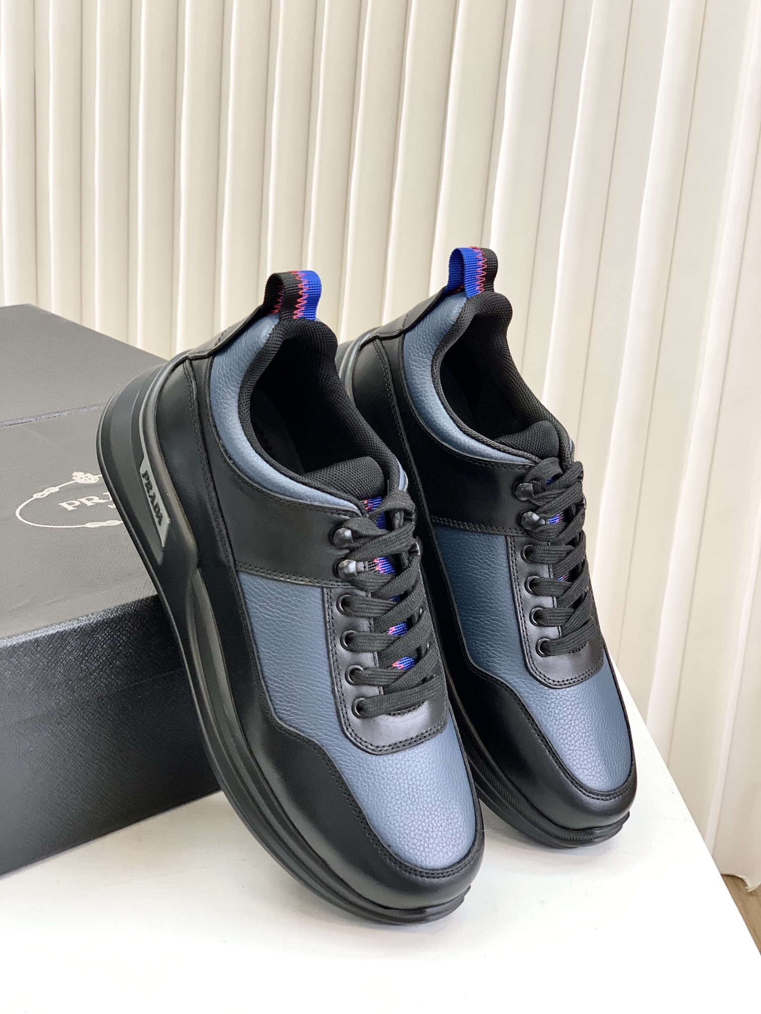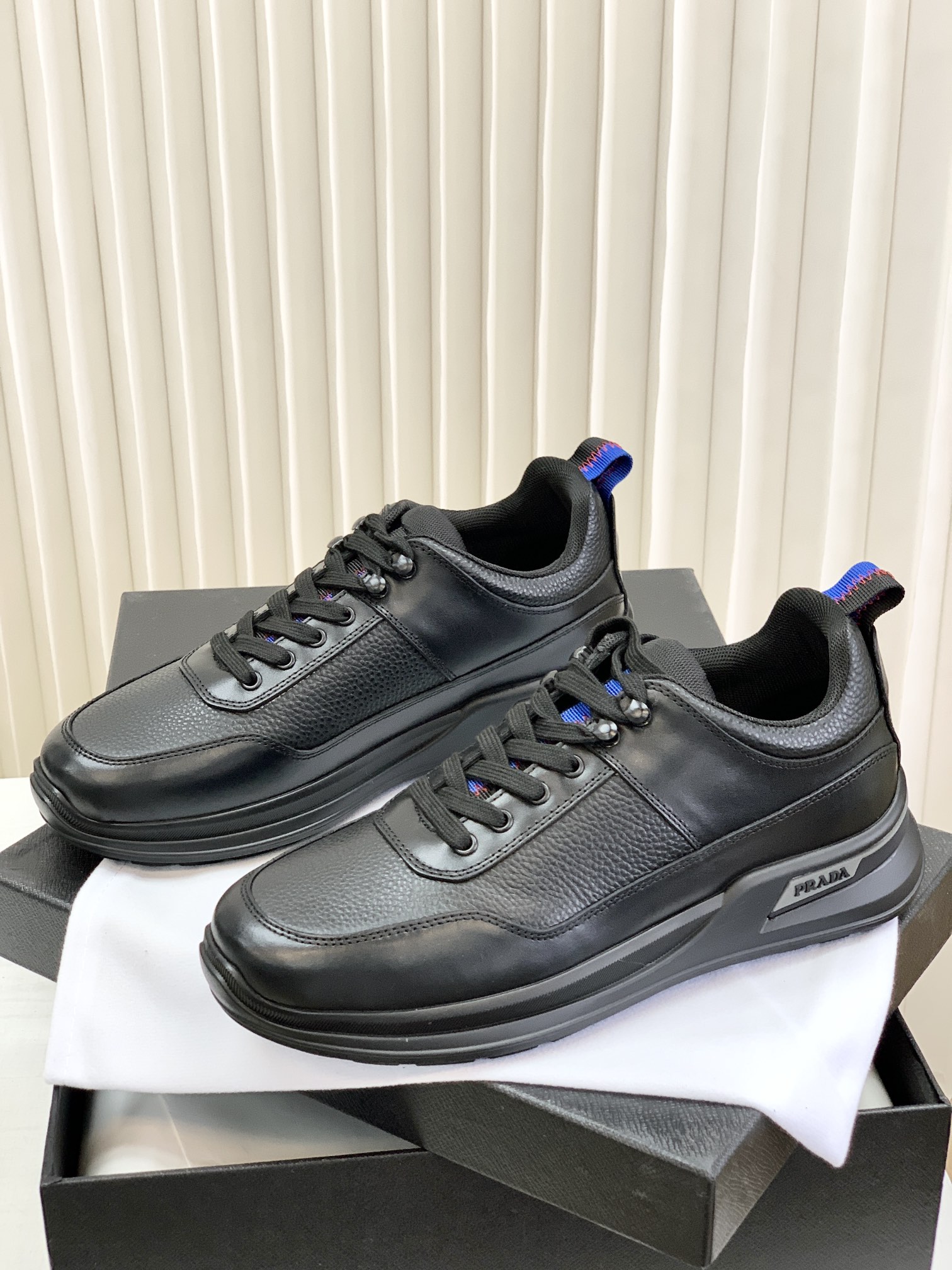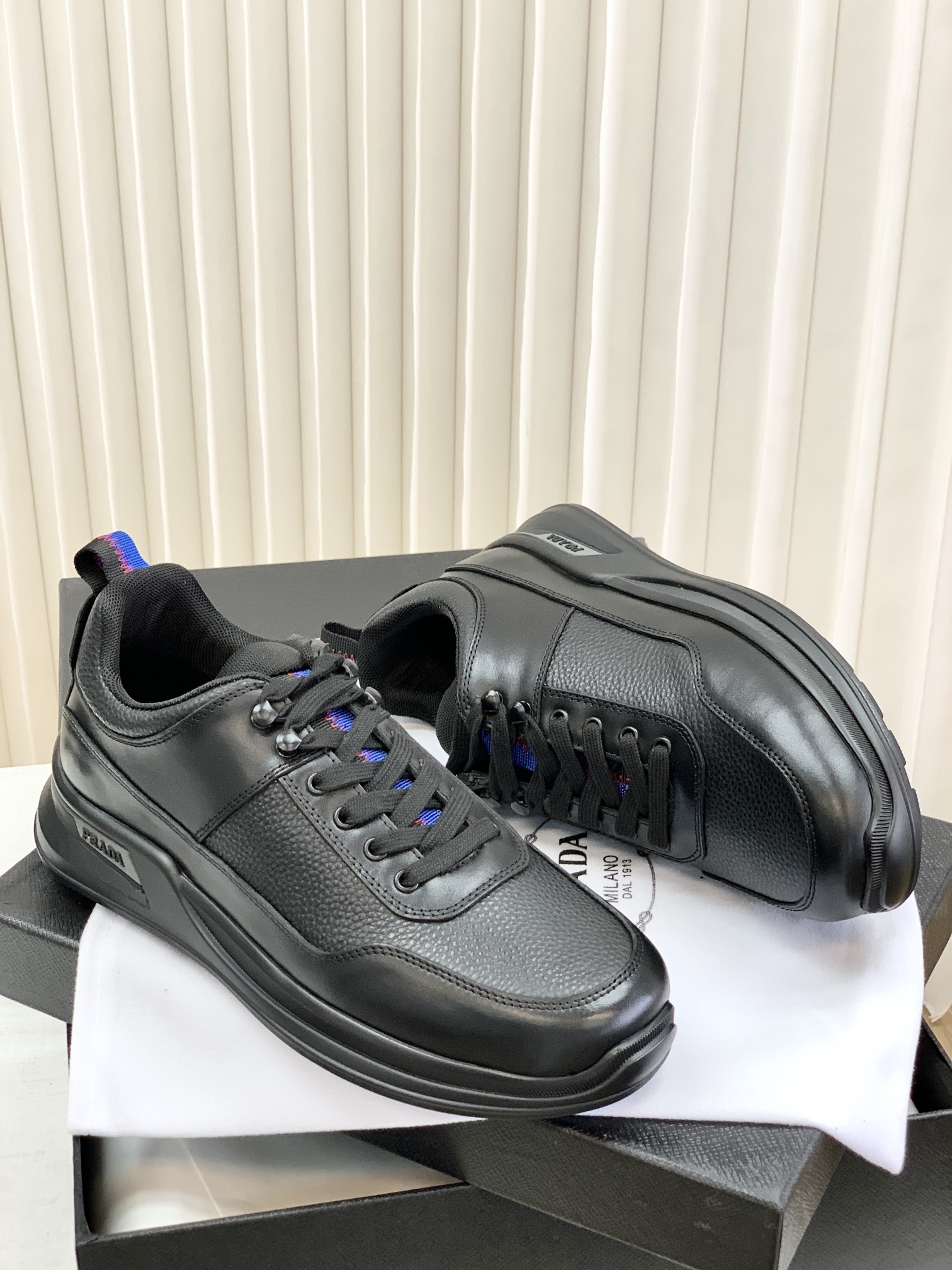 P**rada,正单,顶级,官网同步,2025最新款,男士商务休闲运动鞋‼️ 这款运动鞋采用光滑小牛皮拼接荔枝纹牛皮,现代简约风格,舒适透气,实用百搭,配以全金属珐琅鞋眼棉鞋带,鞋舌饰以撞色织带,与后跟鞋提拉袢相呼应,搭配4cm轻便的凸纹橡胶鞋底,外侧饰有Prada徽标细节,织物透气内里,品牌徽标牛皮垫脚,缔造舒适的穿着体验!