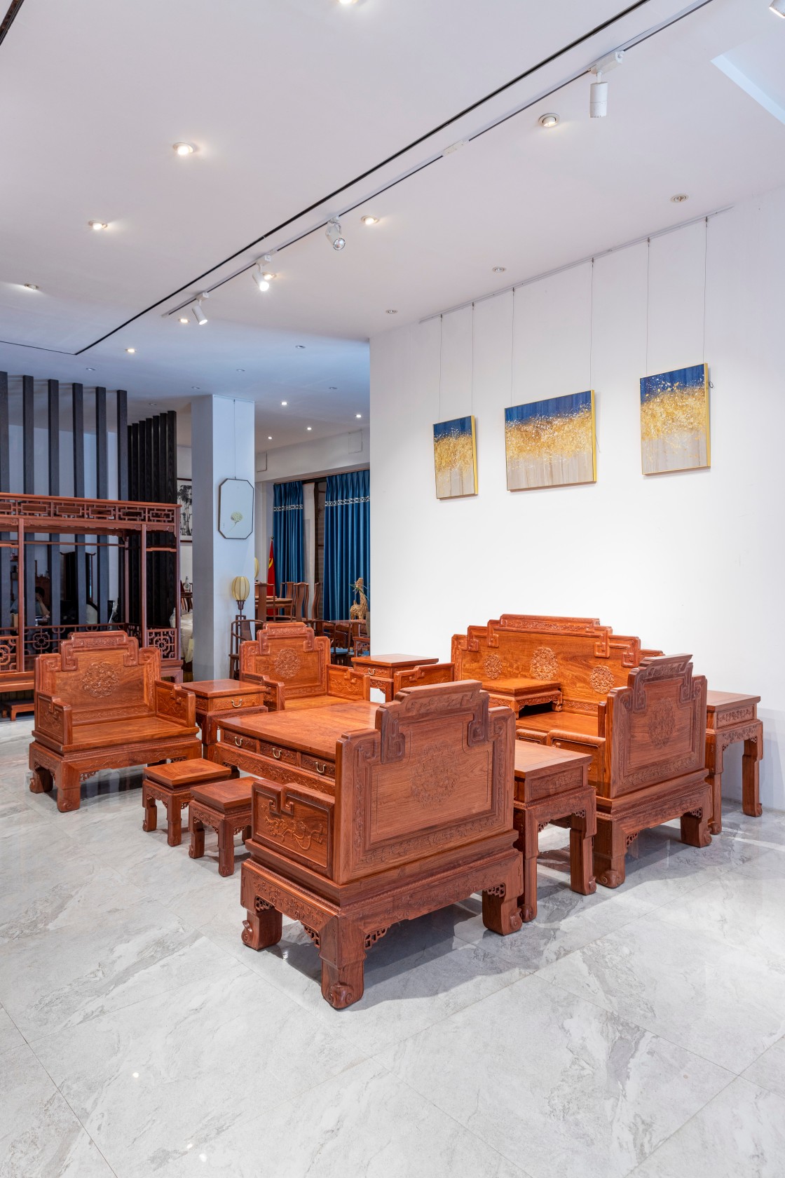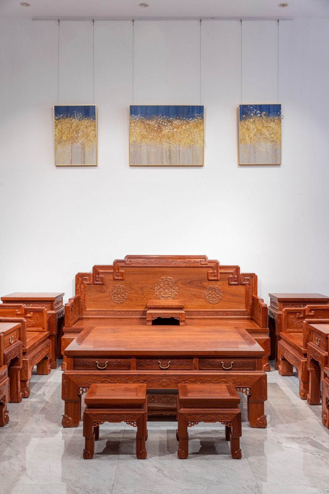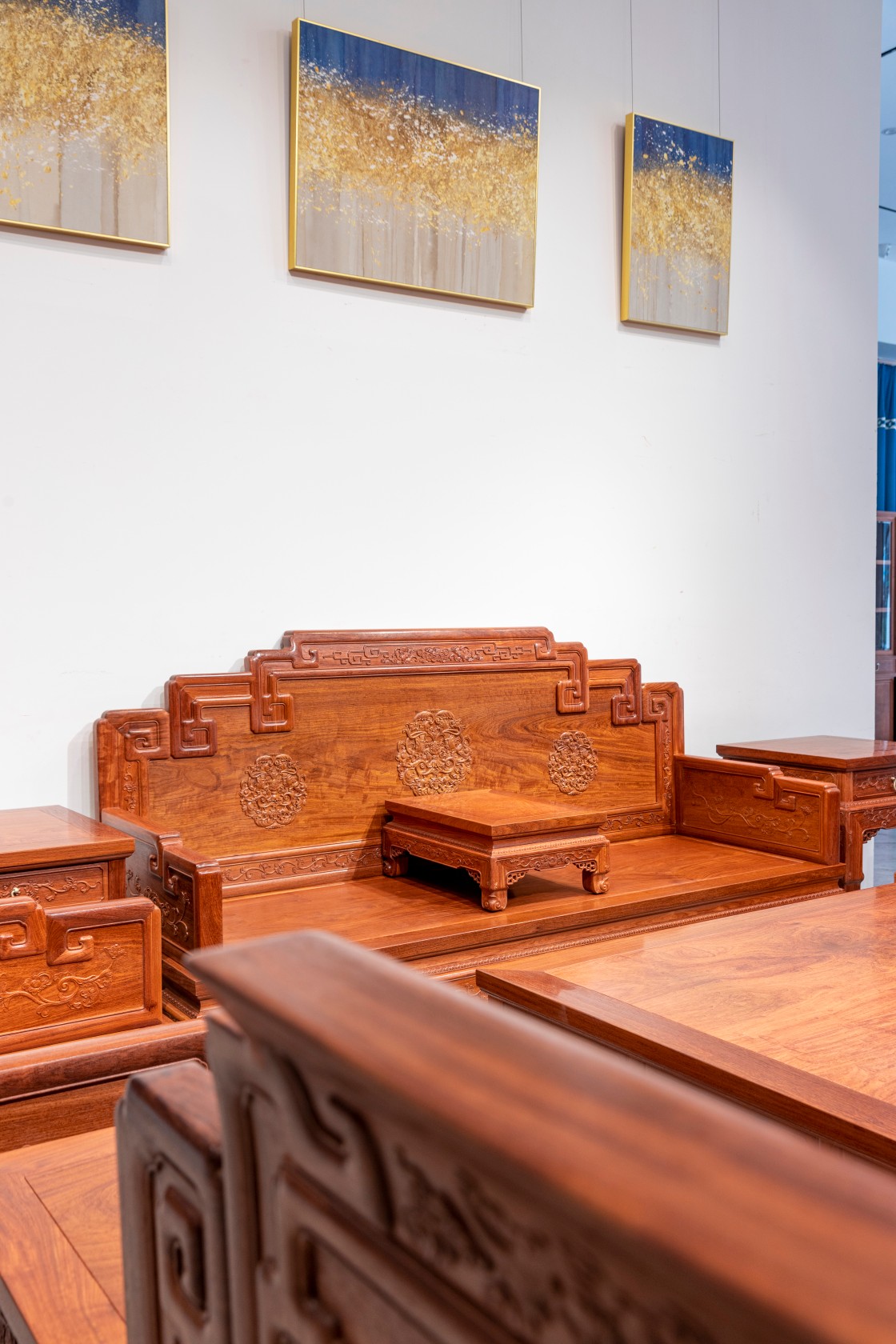 此沙发用材硕大,造型庄重,稳重霸气,百年榫卯工艺,支撑力强,长久实用不变形,制作雕刻工艺精细,气宇不凡,在满堂家具中处于尊贵地位。