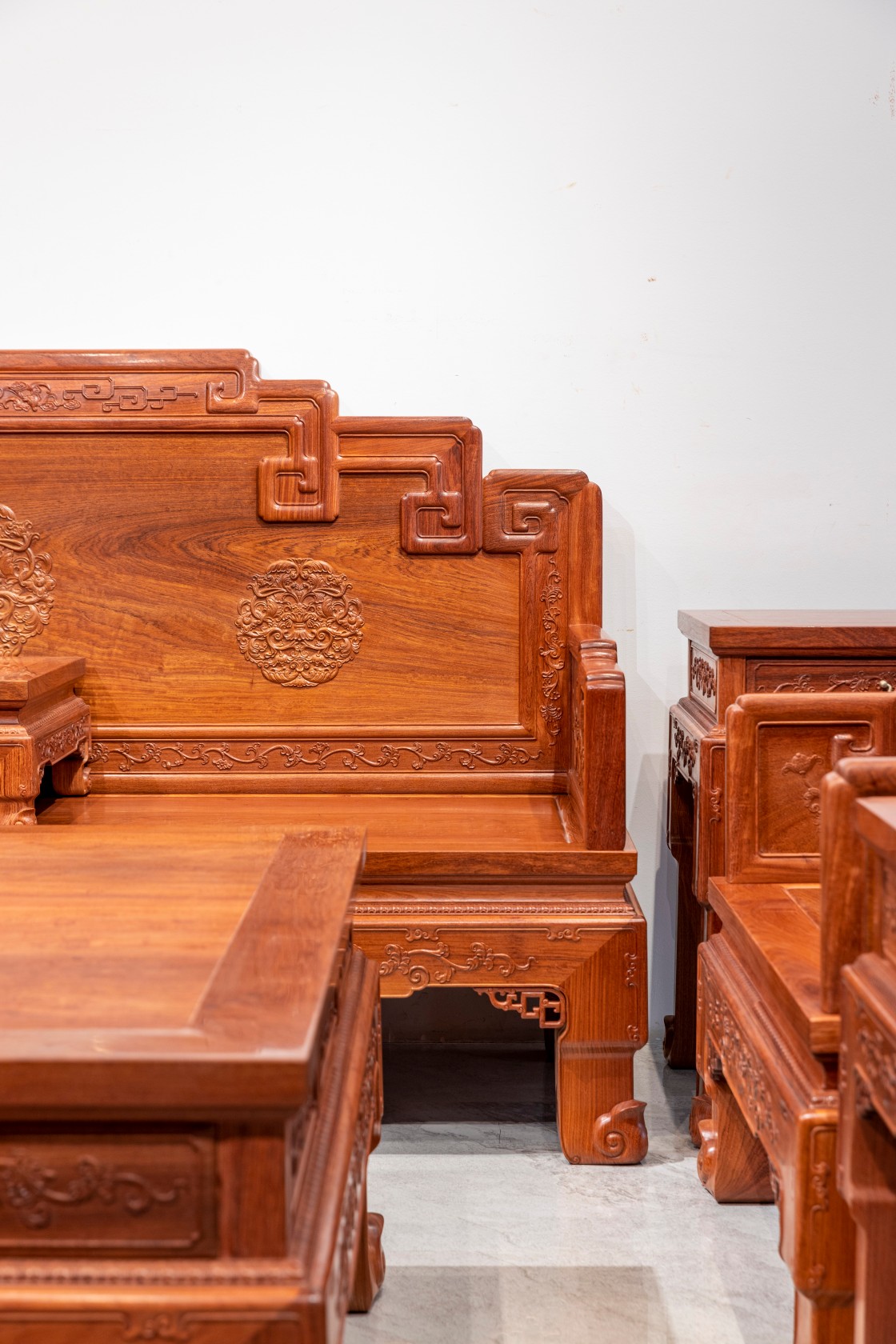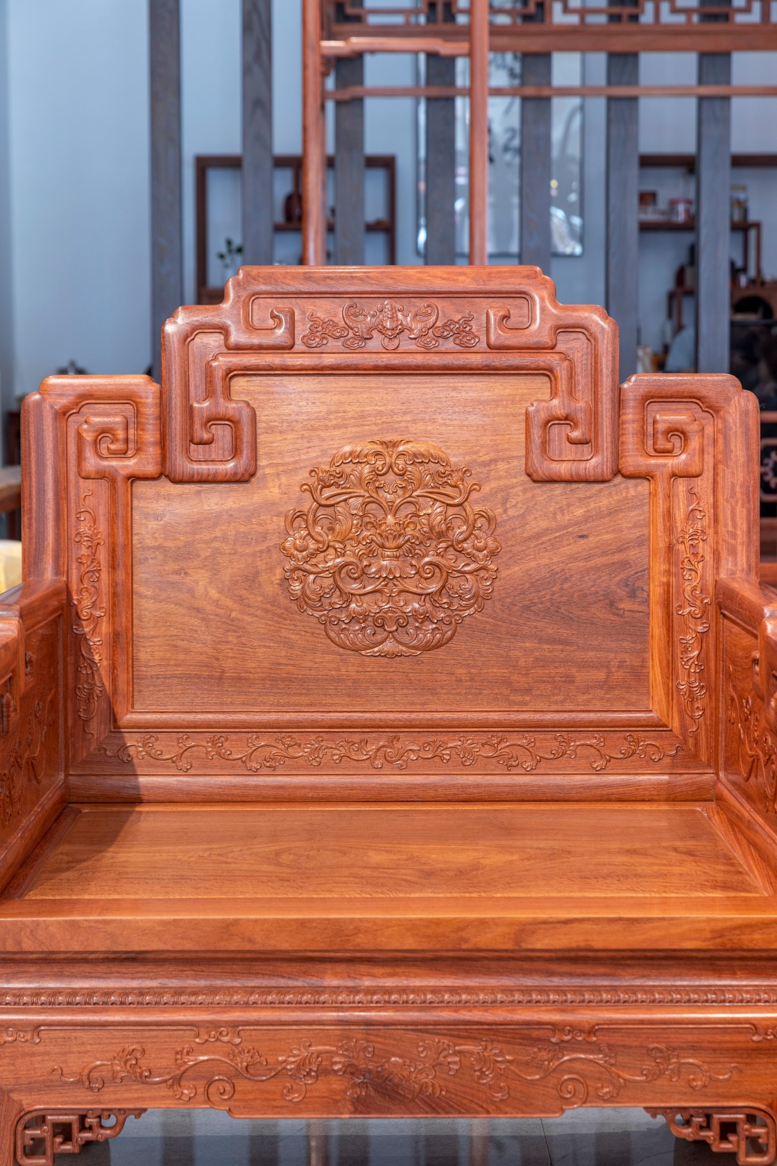 西番莲 宝座式沙发整器造型大气,用料奢华,威严蓬勃,细节雕刻精湛。沙发三面围板均为独板,靠背板上部回形搭脑中部浮雕蝙蝠纹,背板正中饰有西番莲团花纹饰,四周边沿及两侧面板浮雕西番莲纹饰,枝叶卷曲饱满、富丽华贵。靠背板背面同样饰以团花纹饰,纹样工整传统。座面攒框镶板,面下有束腰,直牙条,正中下垂洼堂肚,牙条亦雕饰西番莲纹饰,牙条下两侧各安透雕托角牙子,三弯式腿,外翻云纹足。