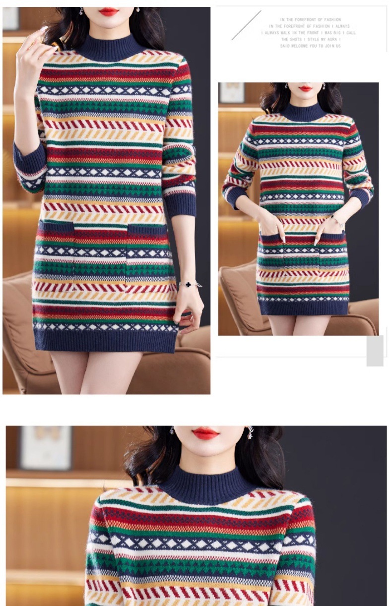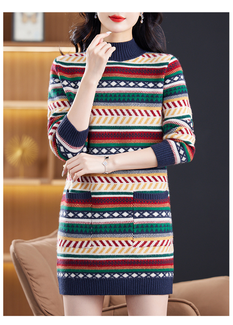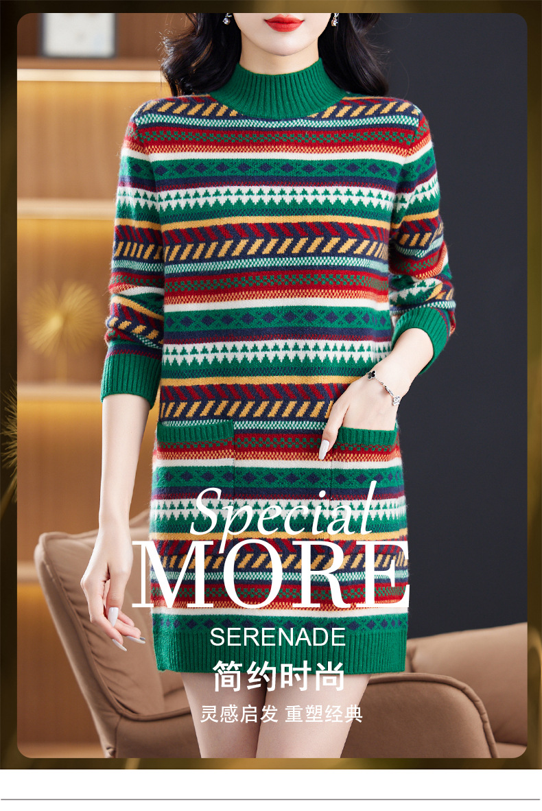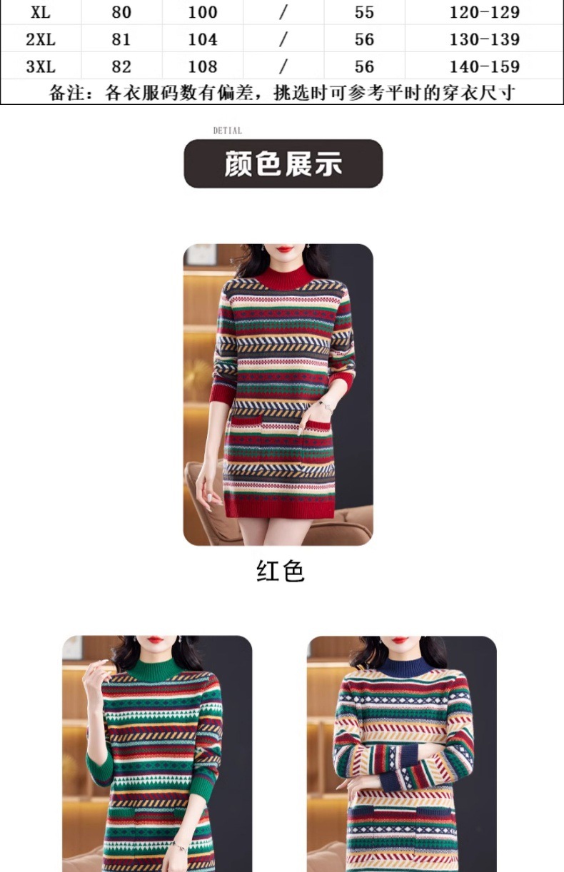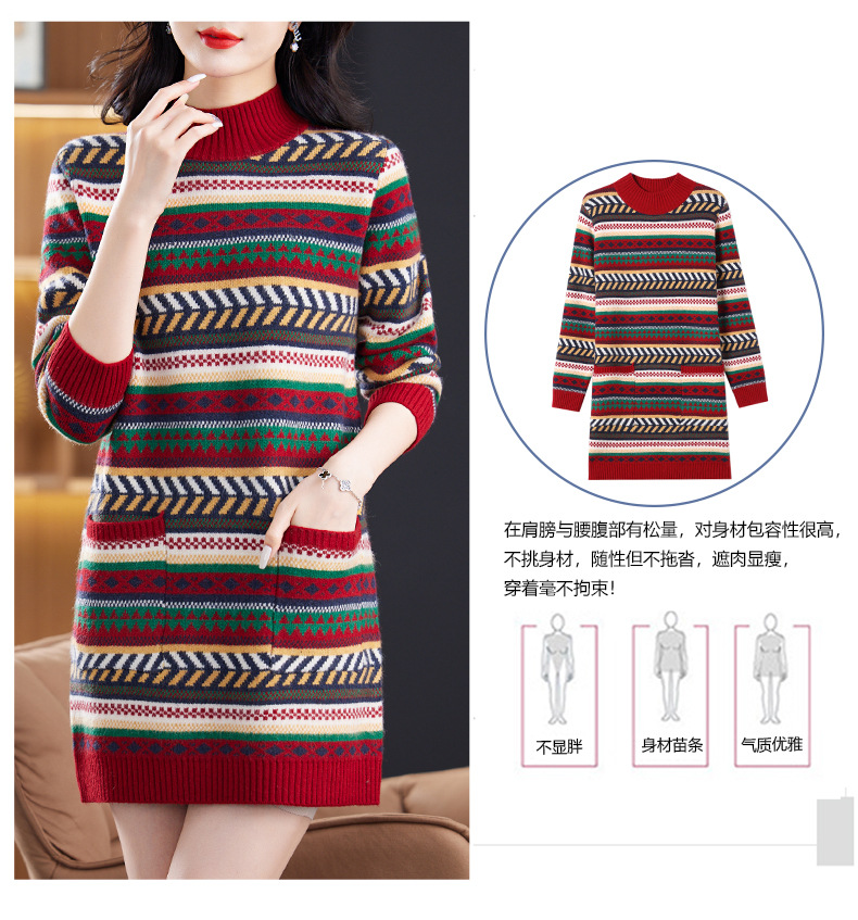 冬季新款,半高领中长款条纹提花加厚口袋女士毛衣针织打底衫CC-XX-3770