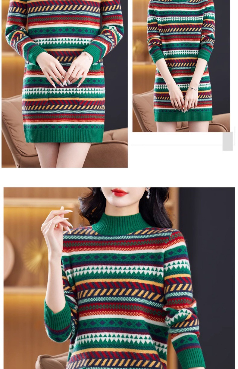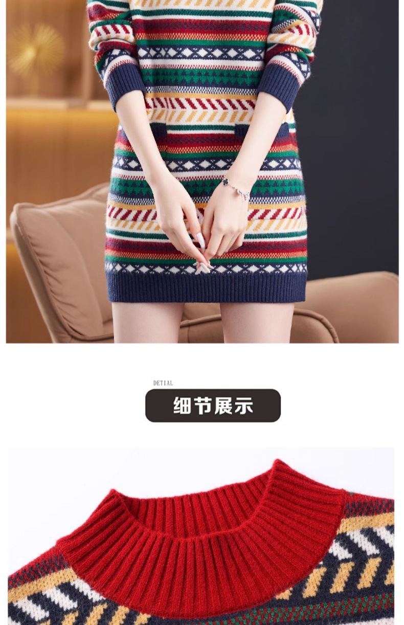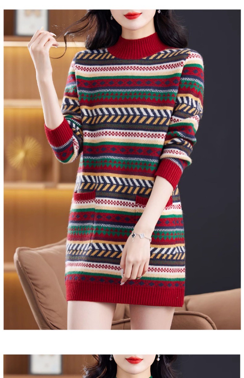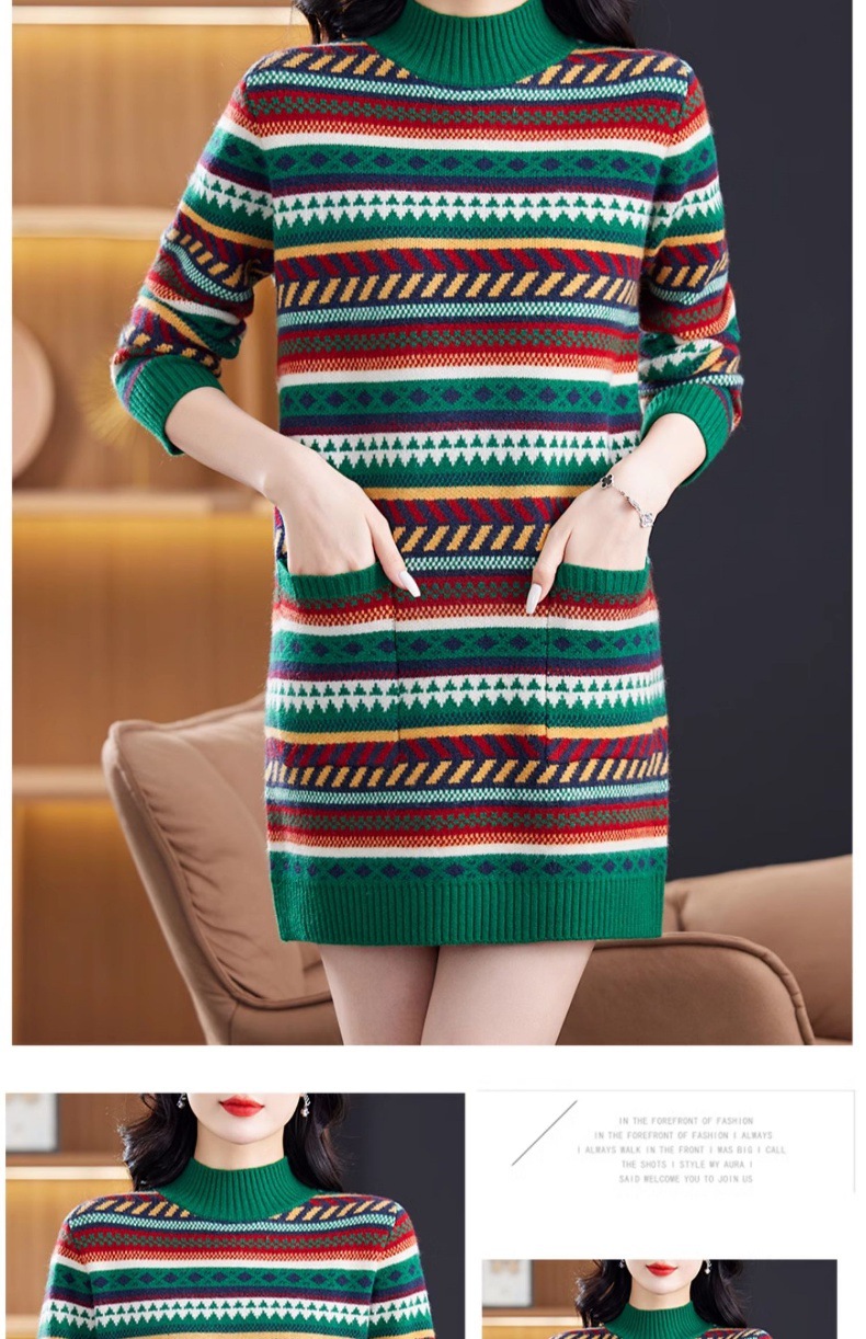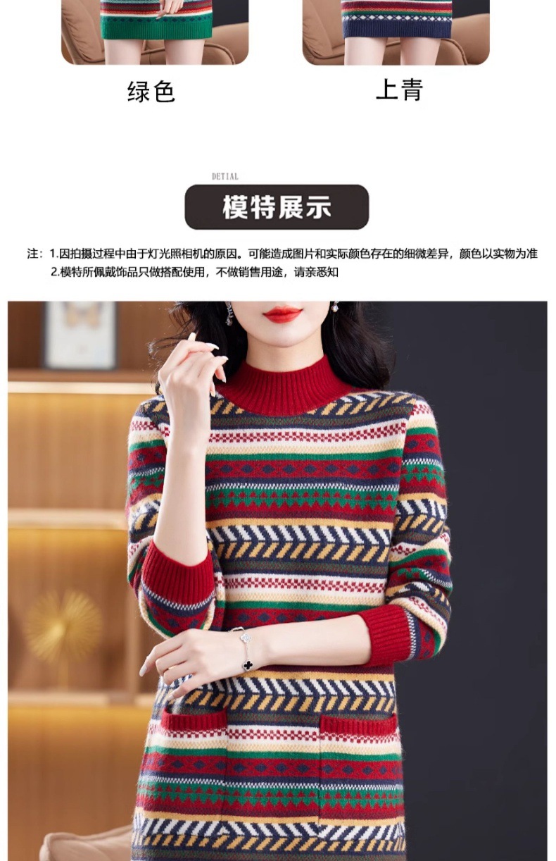 冬季新款,半高领中长款条纹提花加厚口袋女士毛衣针织打底衫CC-XX-3770