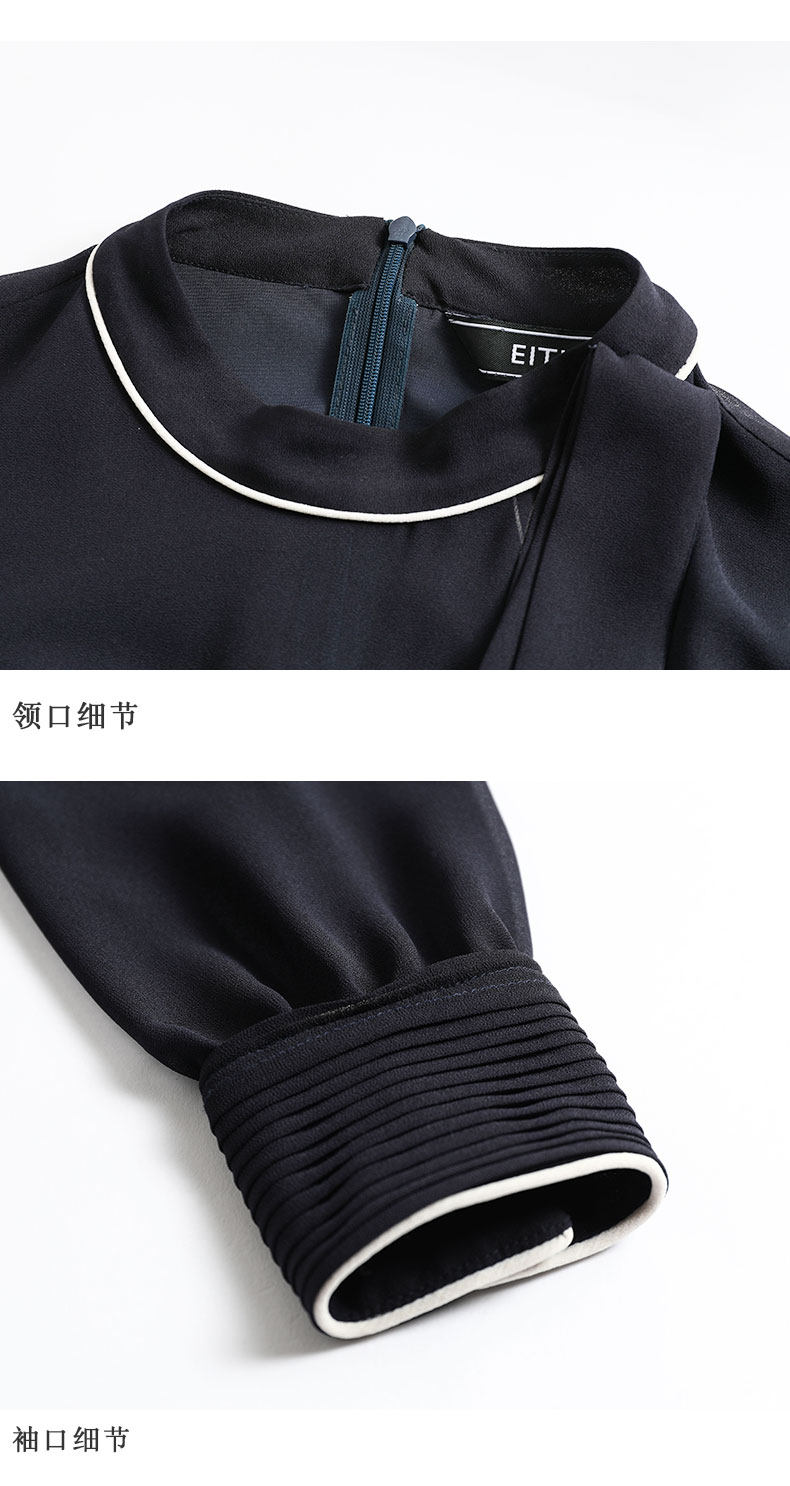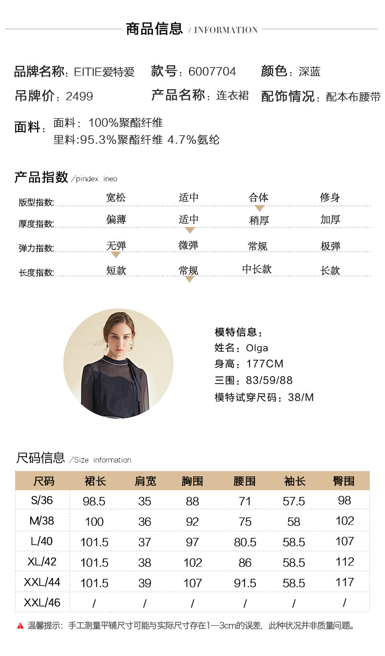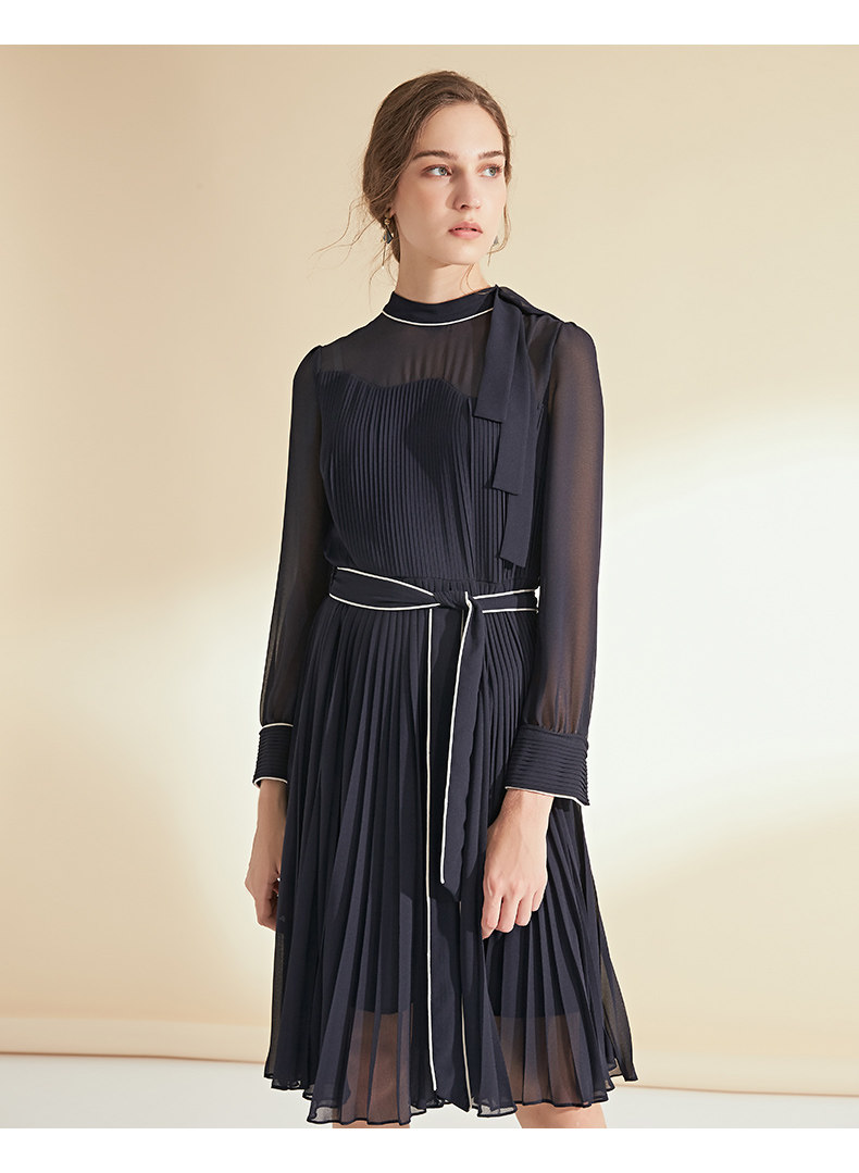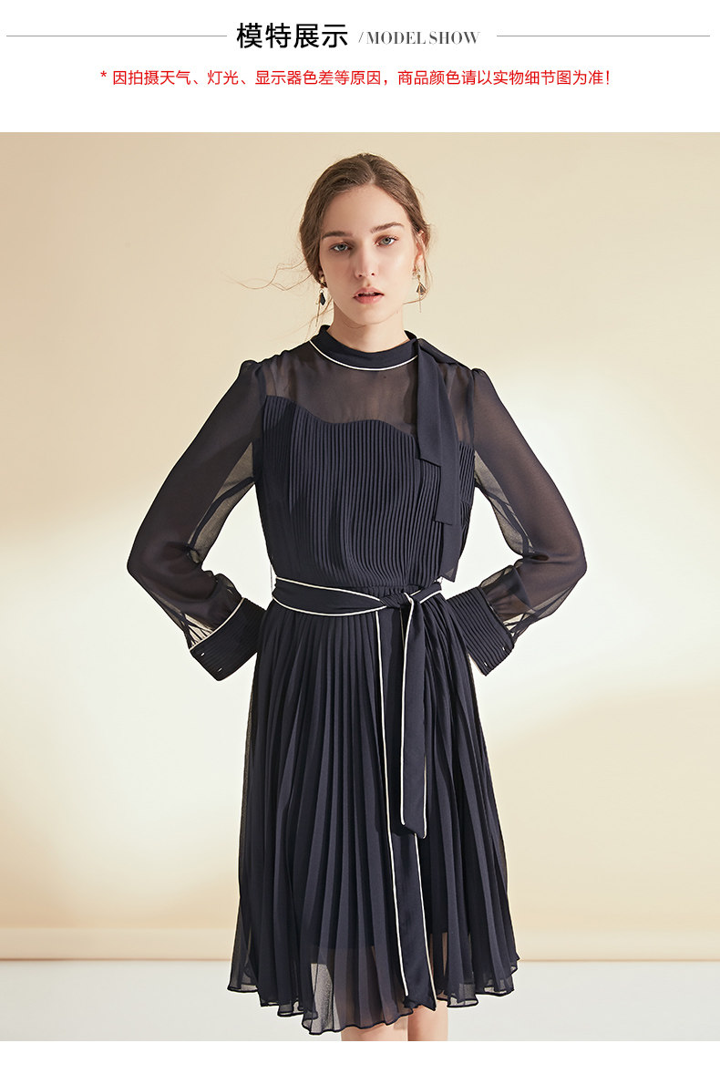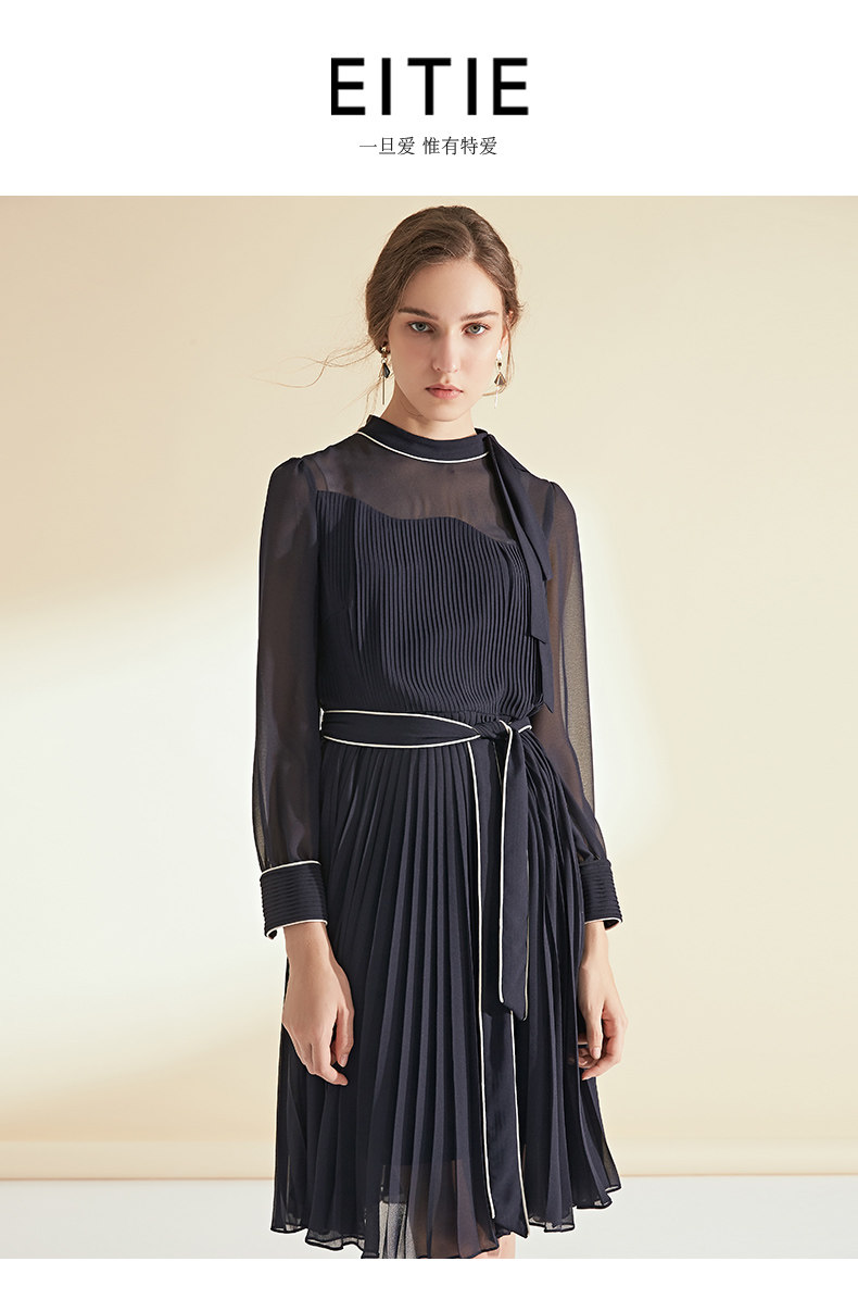 EITIE爱特爱女装初秋季收腰显瘦系带拼色压褶连衣裙6007704