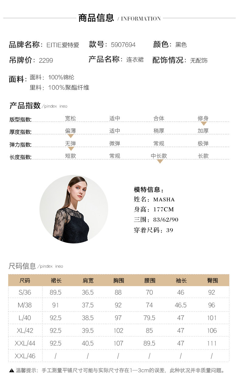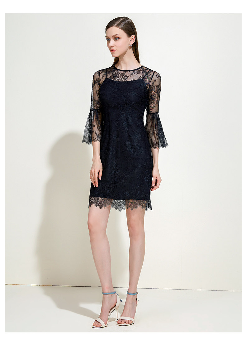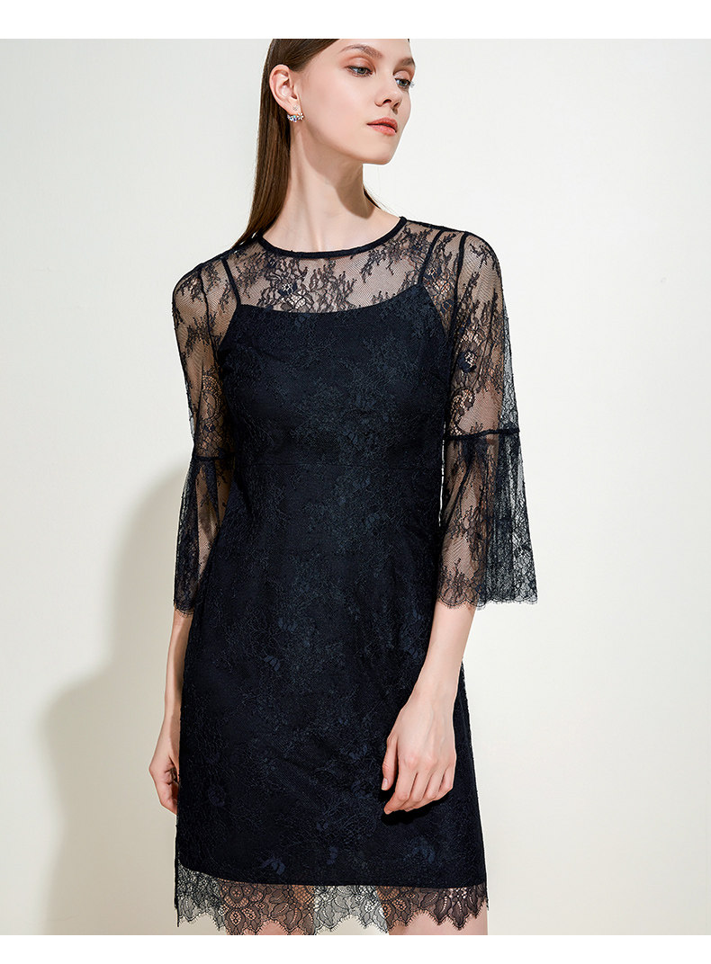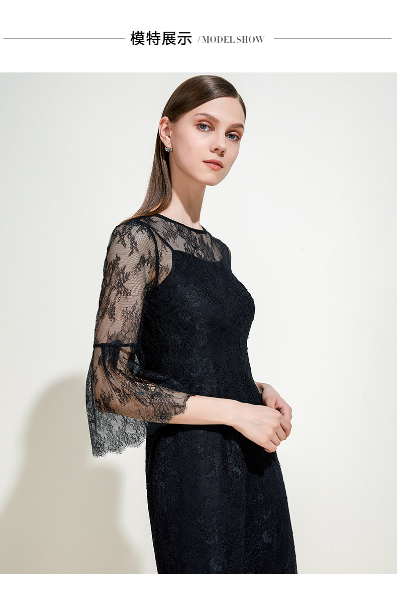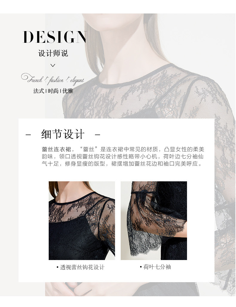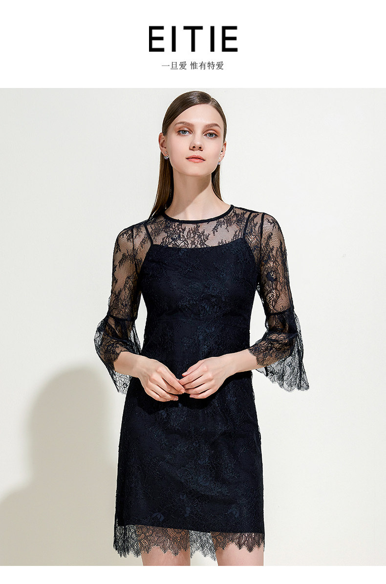 EITIE爱特爱女装春夏季荷叶花边七分袖性感蕾丝拼接连衣裙5907694