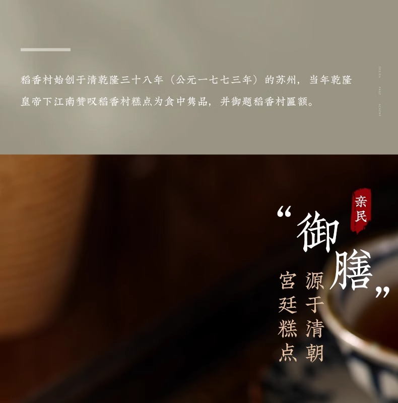 - 稻香村始创于公元1773年(清乾隆三十八年),中国糕点行业现存历史悠久的企业之一,历经两个多世纪的发展,稻香村以其悠久的文化底蕴、精湛的制作技艺、卓越的品质信誉和行业影响力,被誉为“糕点泰斗”。