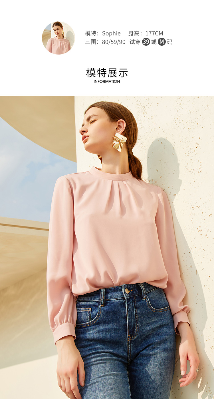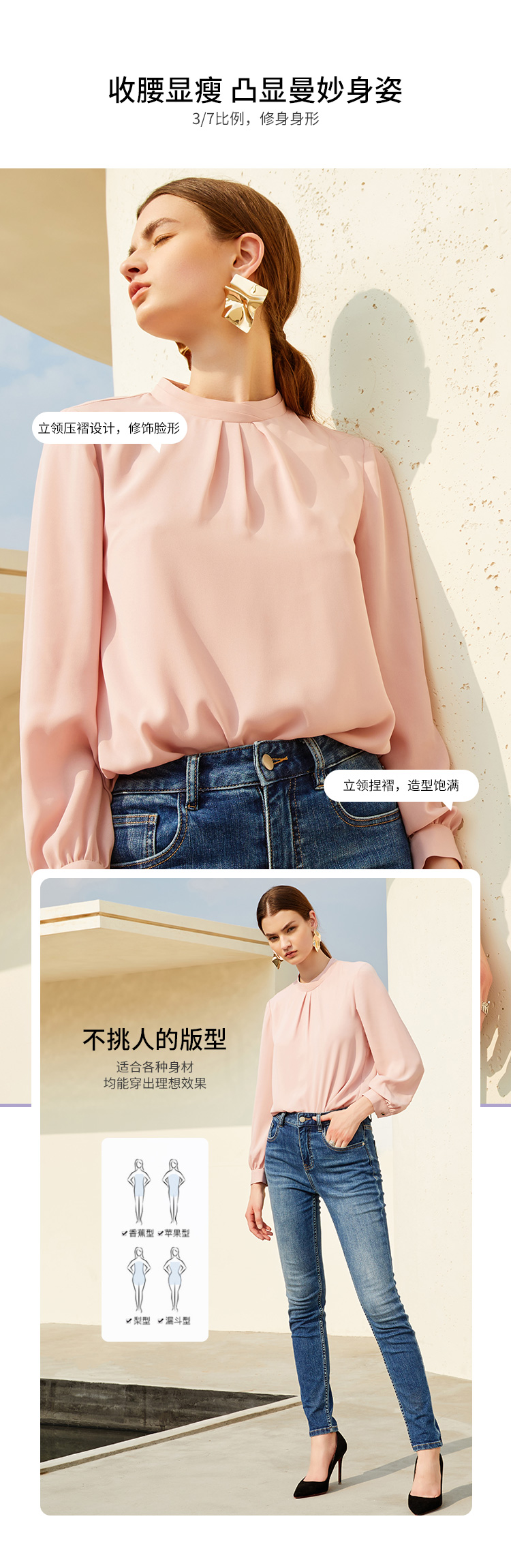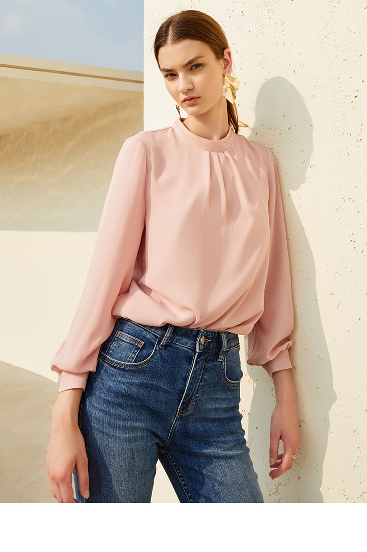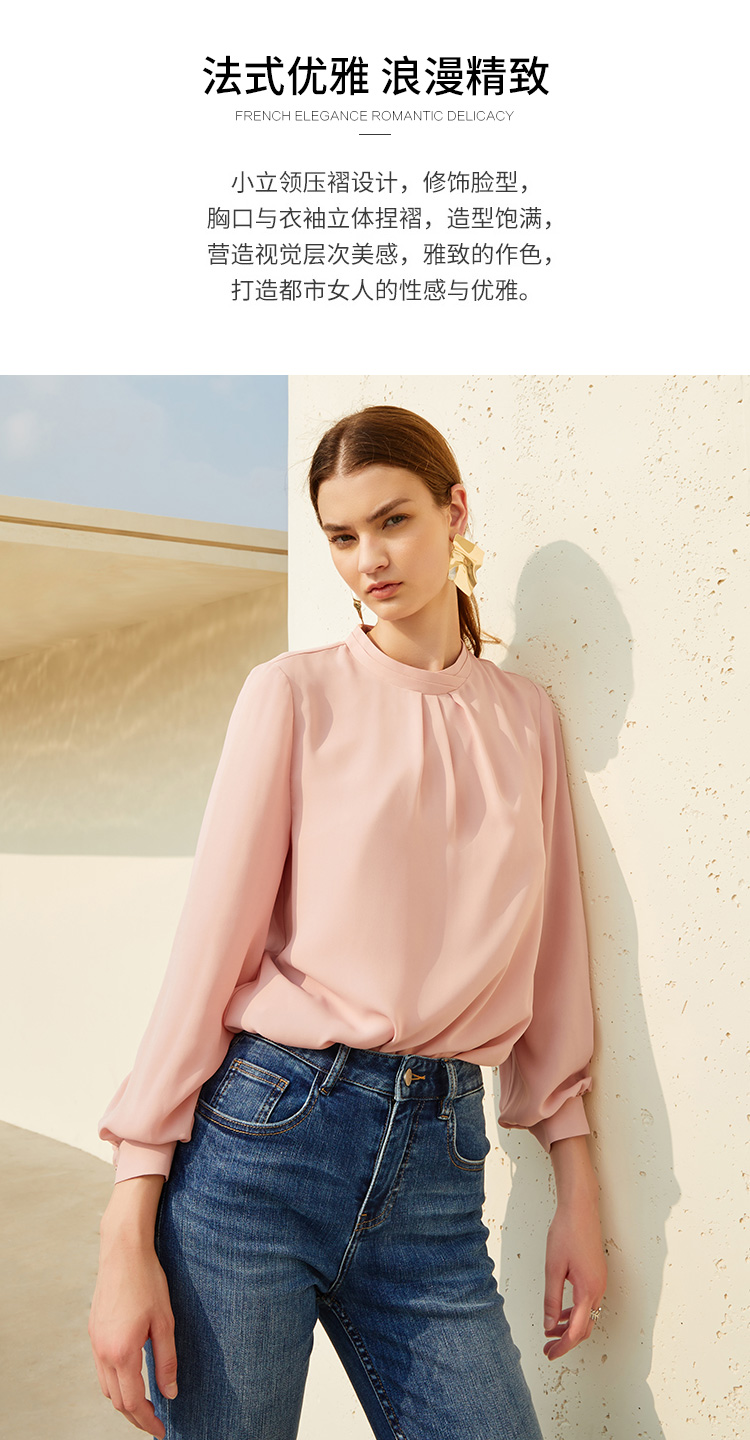 EITIE爱特爱秋季新款洋气压褶通勤小立领复古泡泡袖T恤上衣女