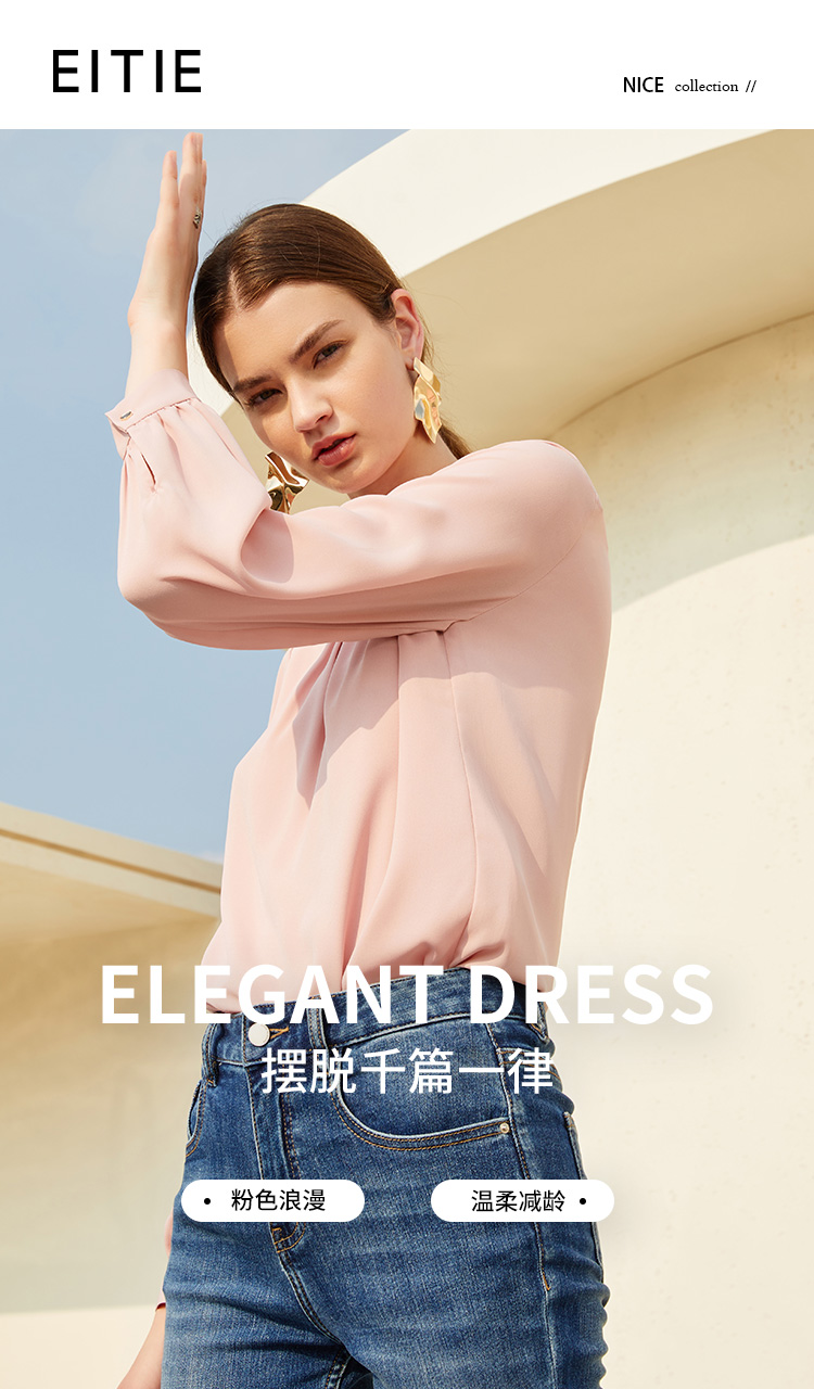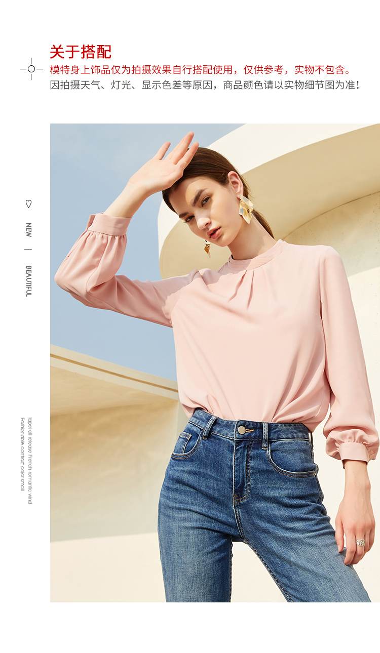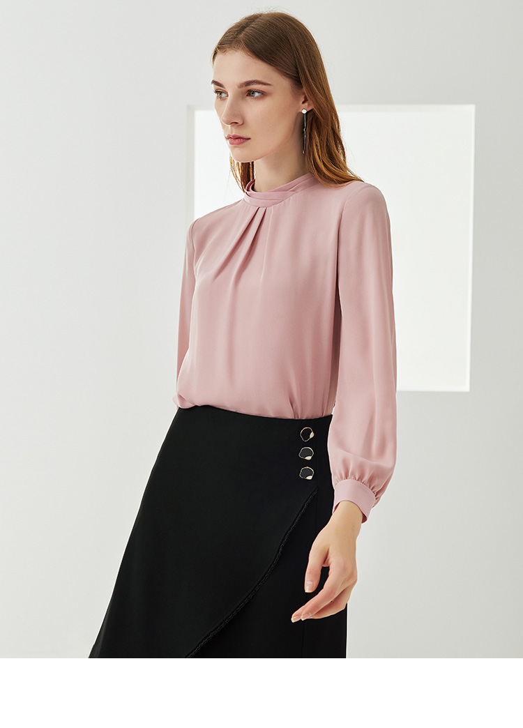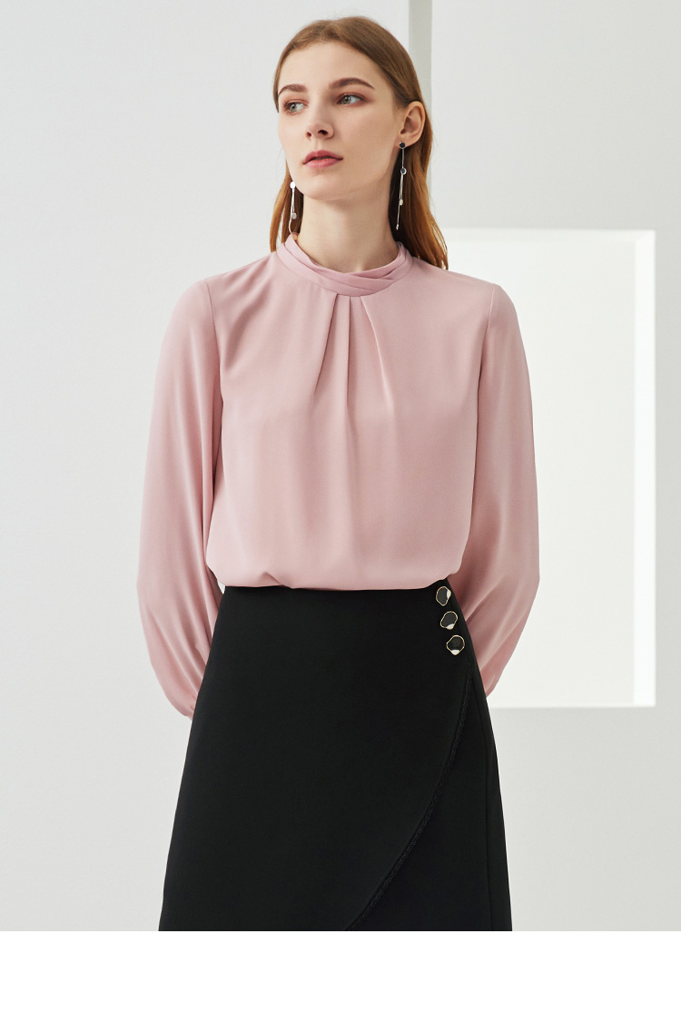EITIE爱特爱秋季新款洋气压褶通勤小立领复古泡泡袖T恤上衣女