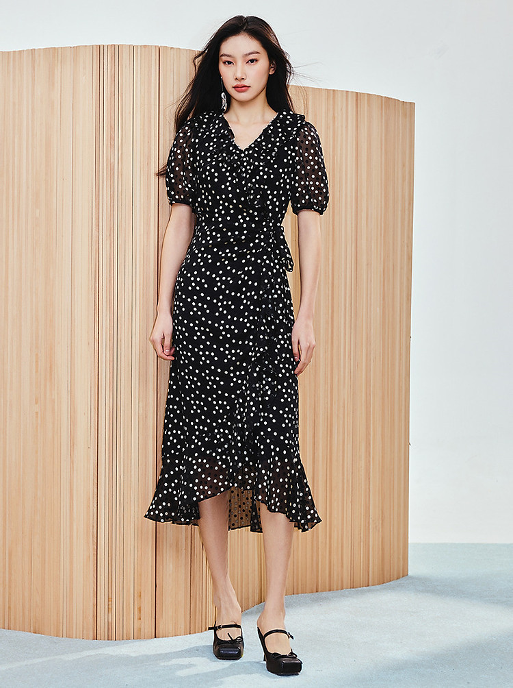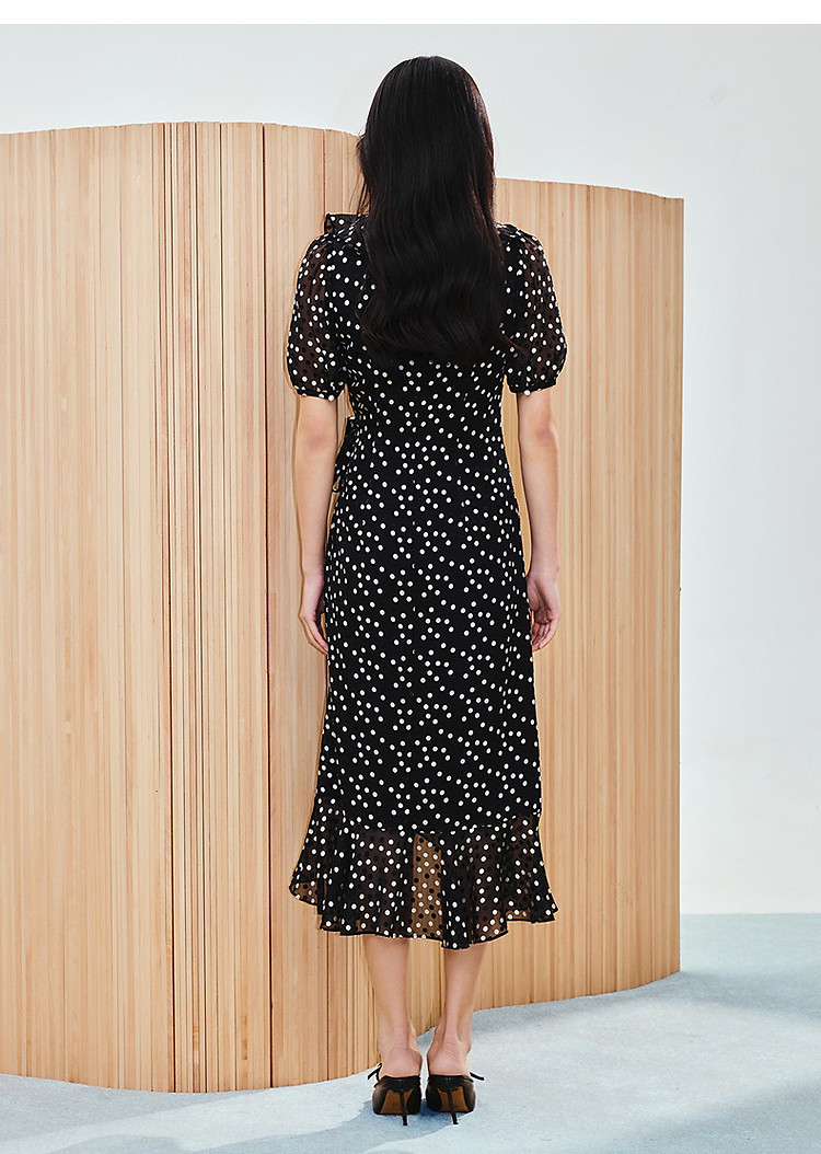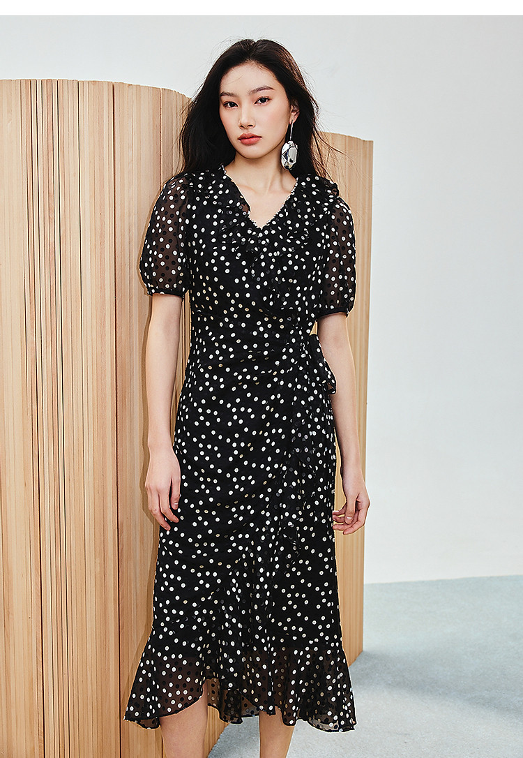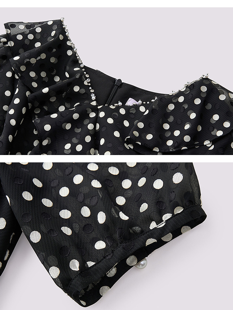 法式复古波点收腰连衣裙25夏浪漫赫本风X型收腰抽褶长裙(货号:MS86DR020D0003)