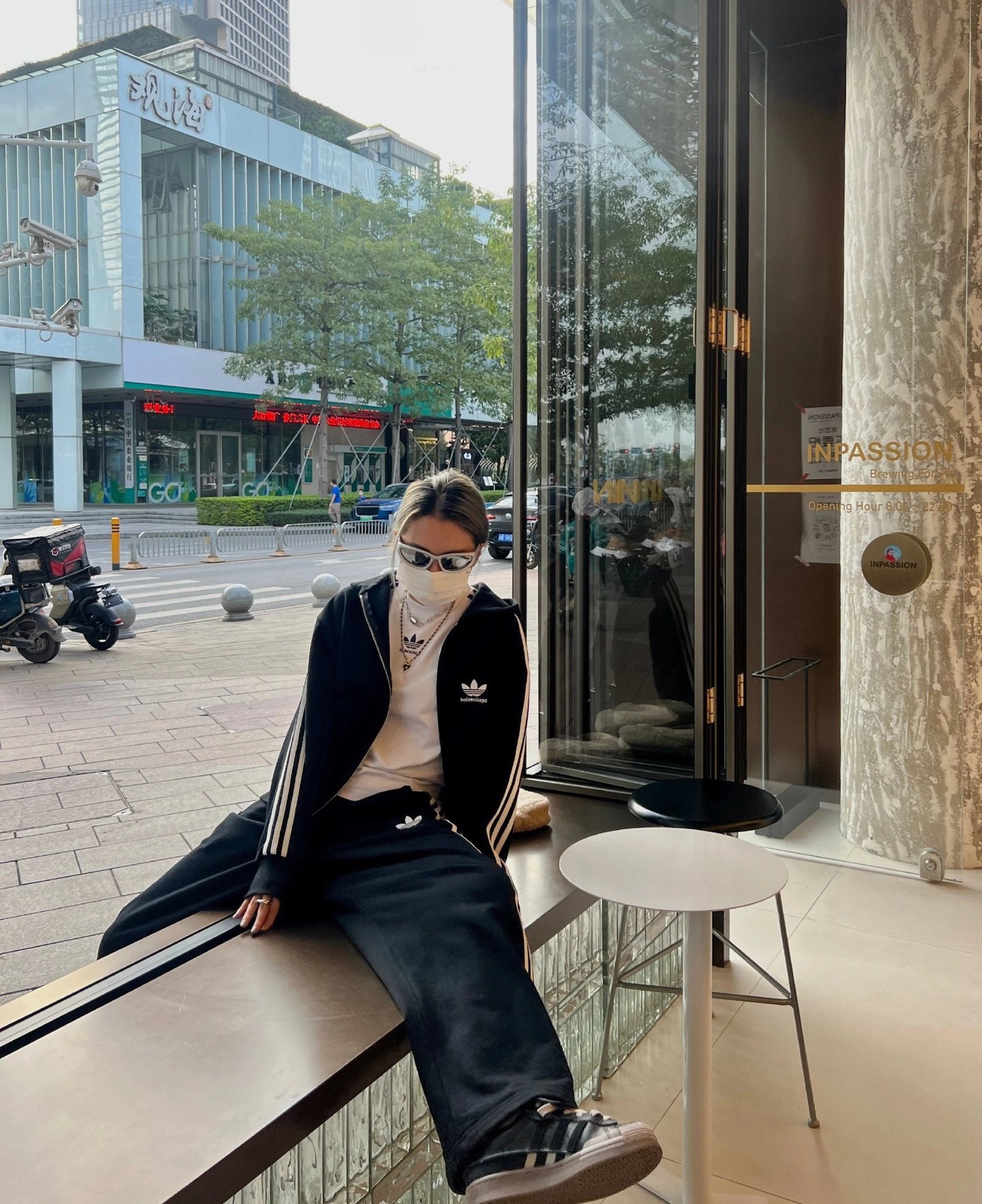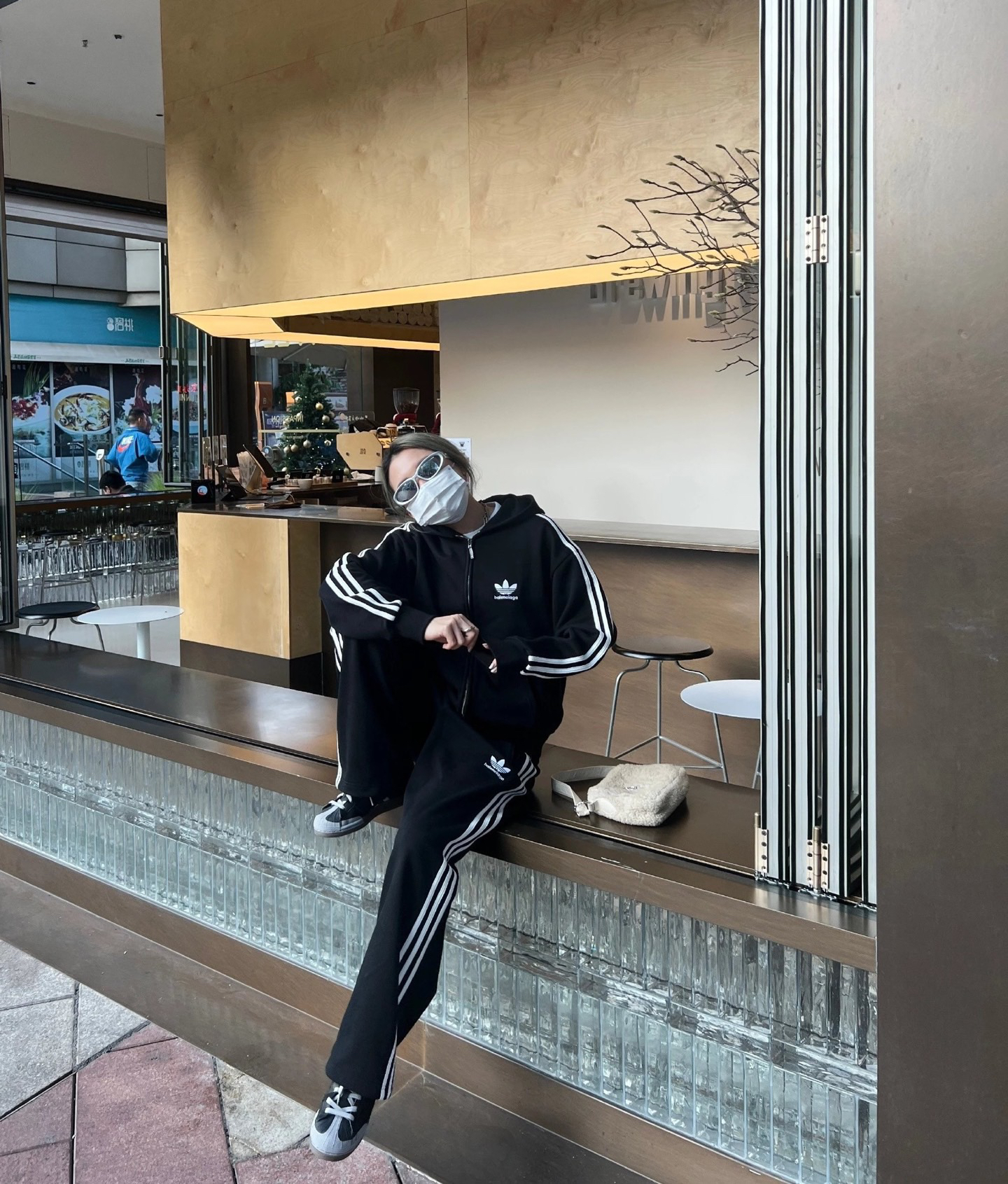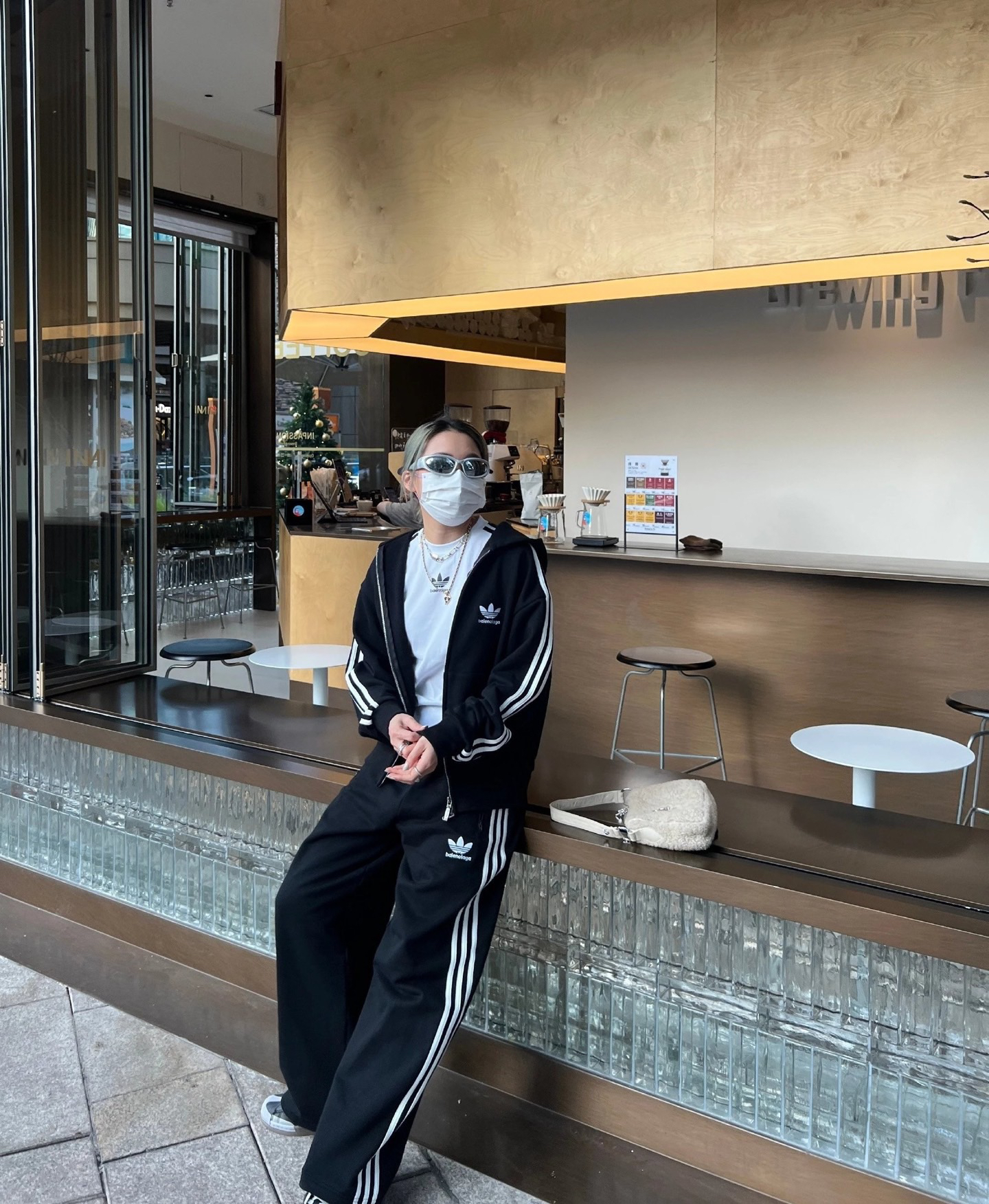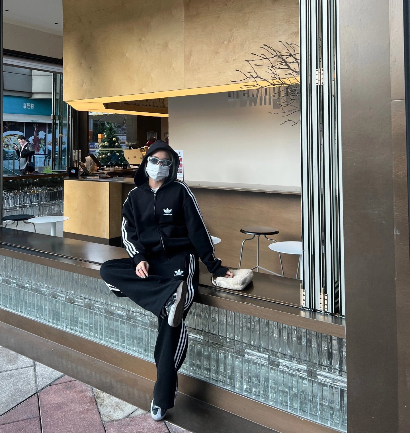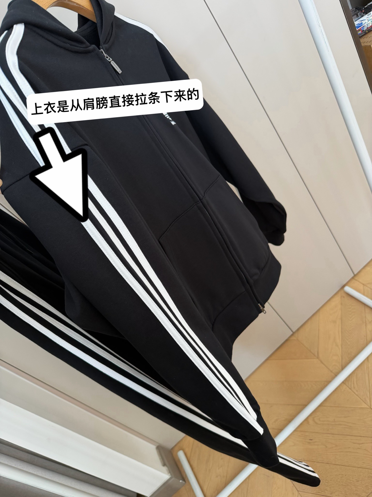 打破传统运动套装的设计边界,上衣采用从肩膀直接延伸至袖口的贯穿式拉条,裤子两侧则对称分布三道立体拉条,不仅视觉上拉长身形比例,更通过结构化设计勾勒利落线条,行走间自带动态张力,街头辨识度瞬间拉满,轻松穿出不费力的潮流感。