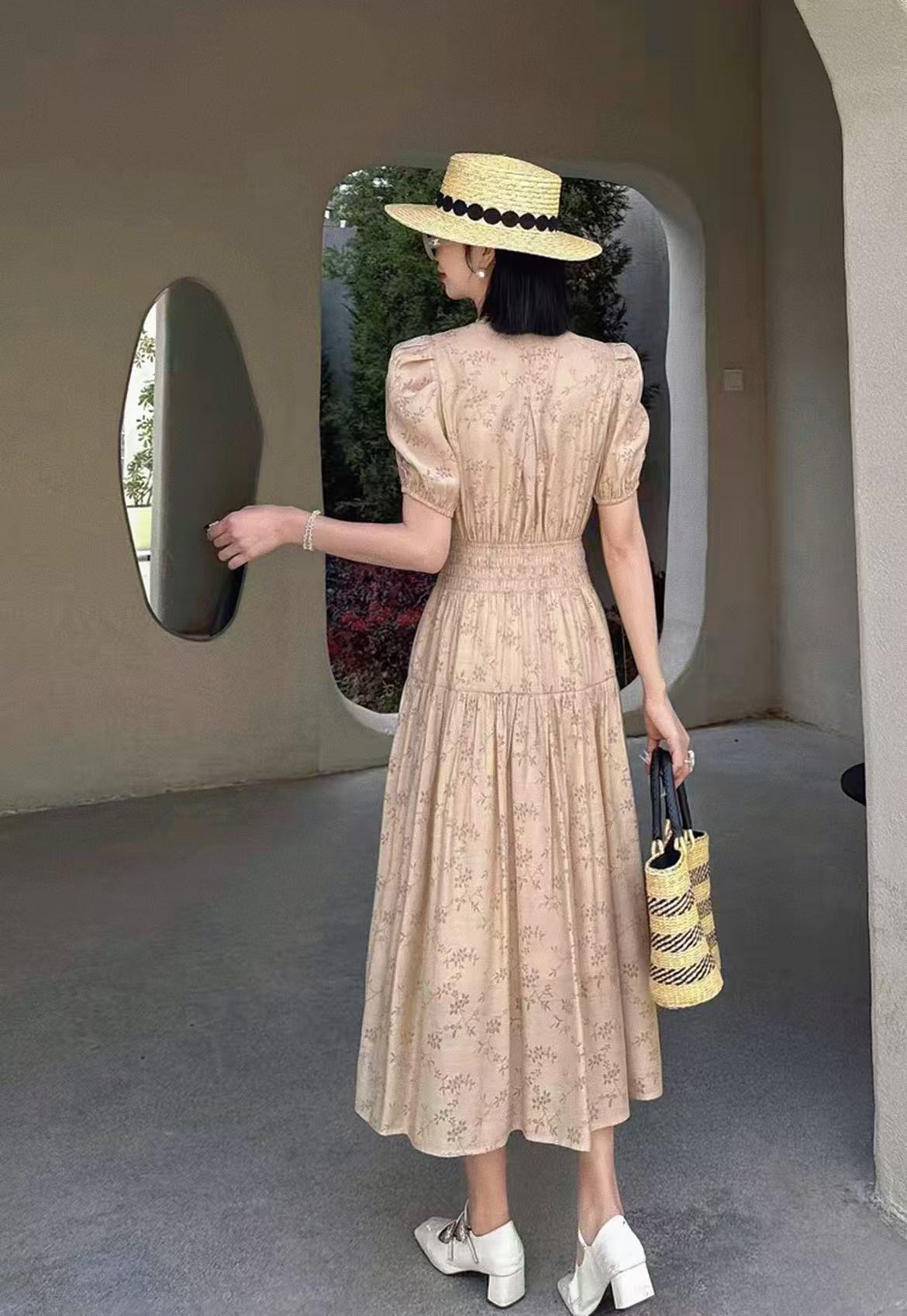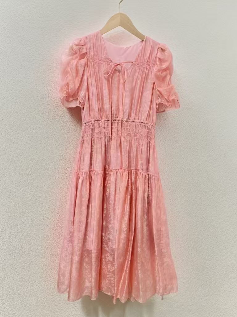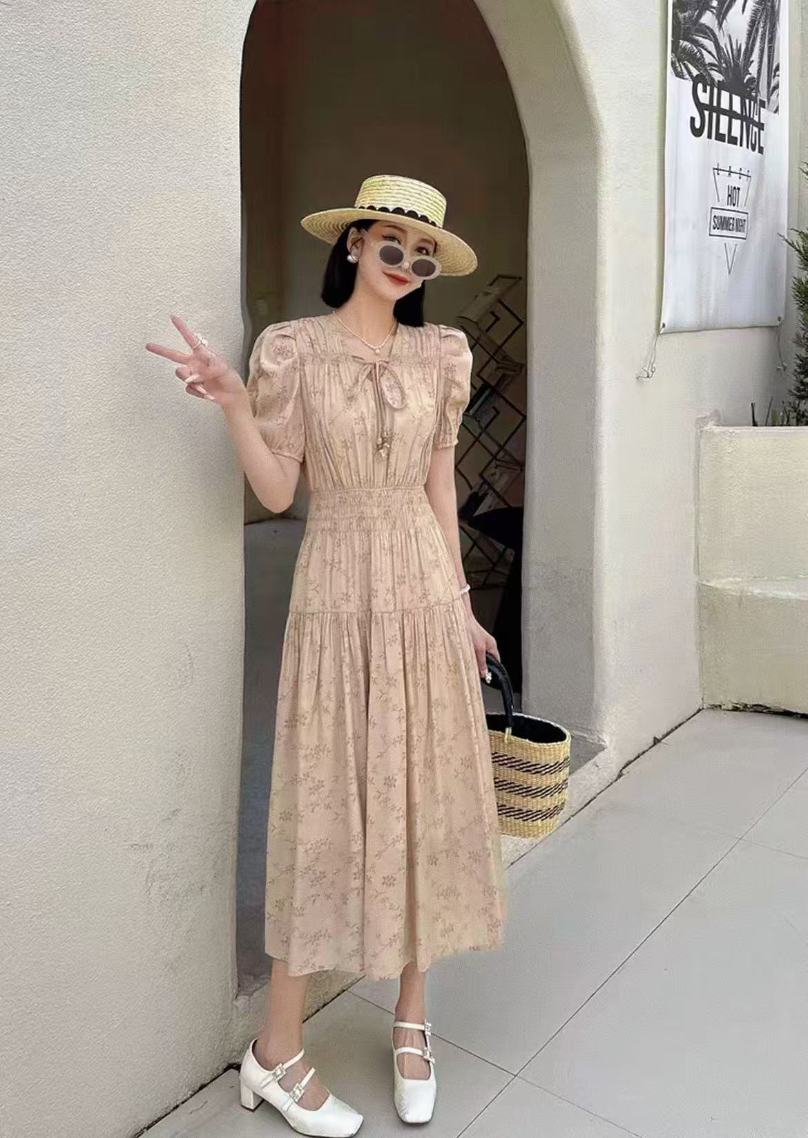 【MYBL】1619泡泡袖V领高腰修身显瘦暗纹连衣裙-喜出