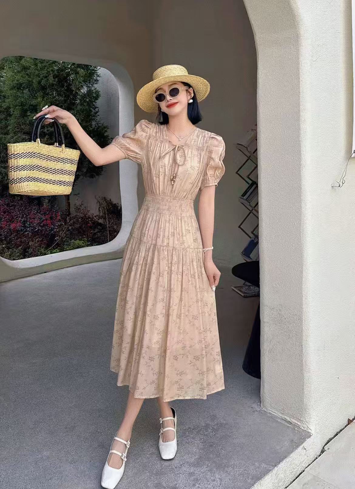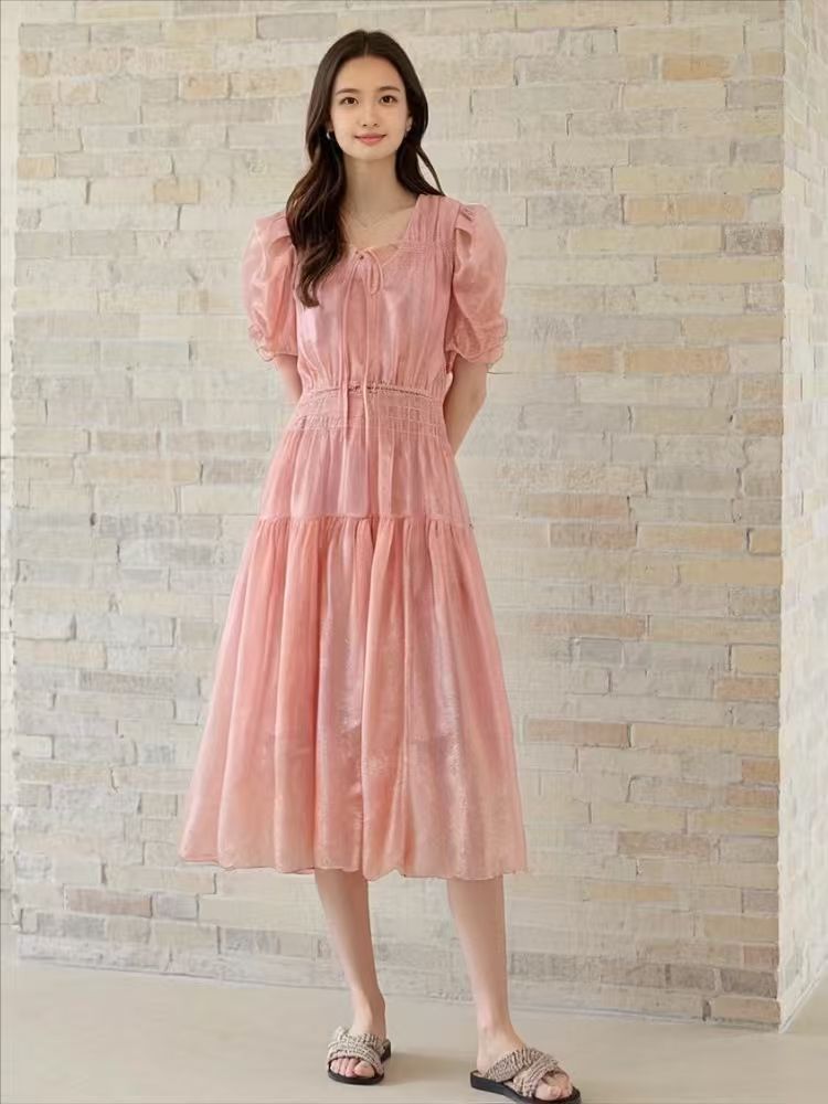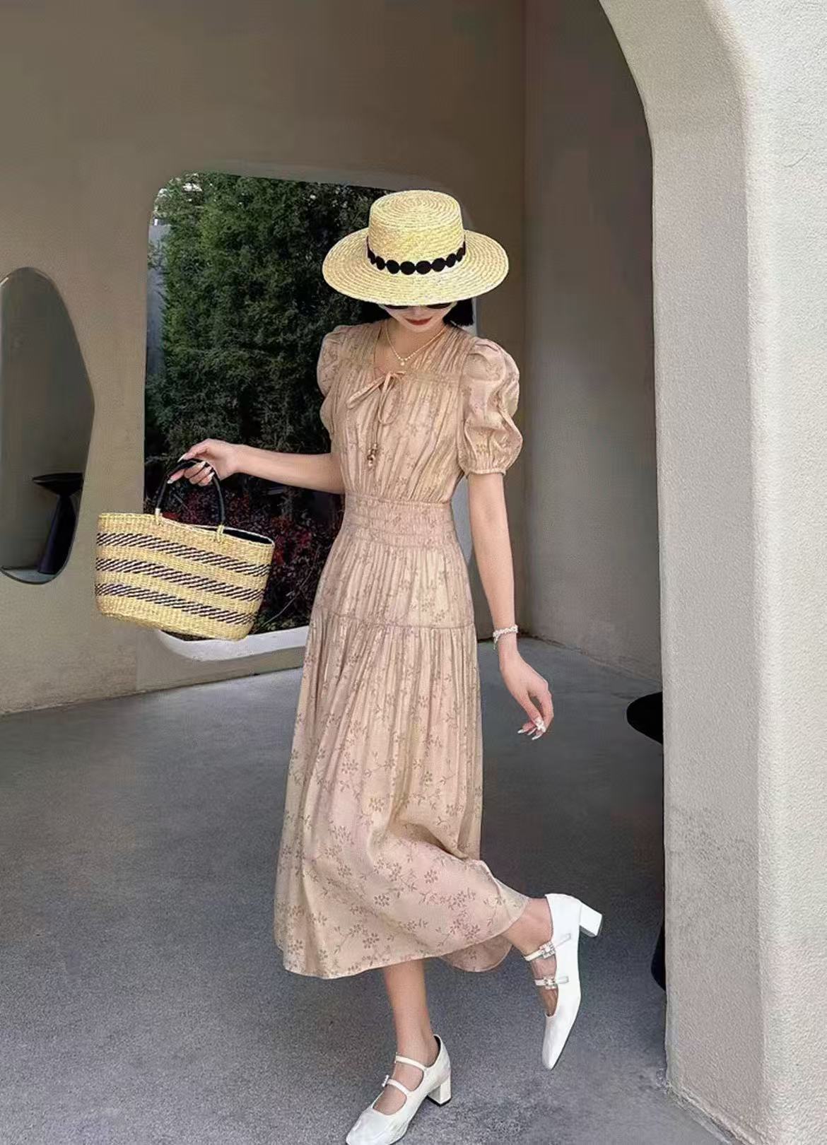 【MYBL】1619泡泡袖V领高腰修身显瘦暗纹连衣裙-喜出