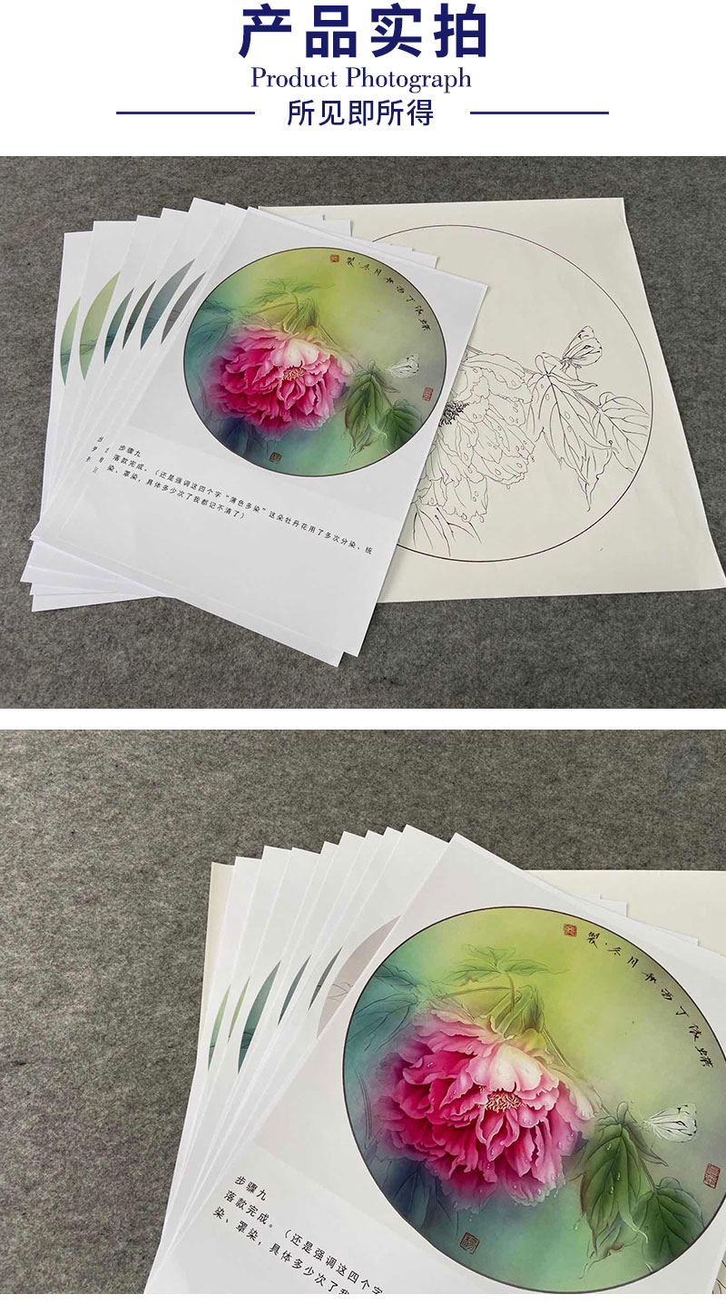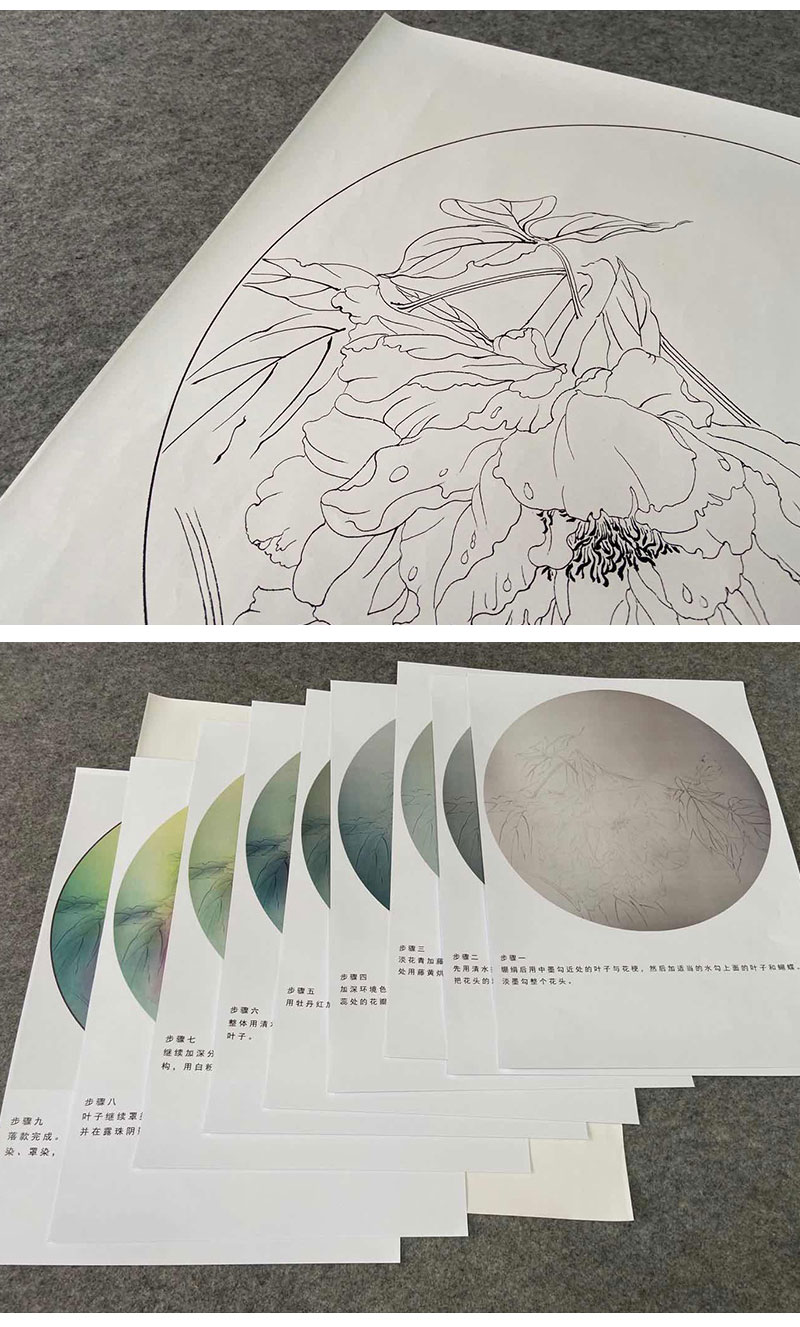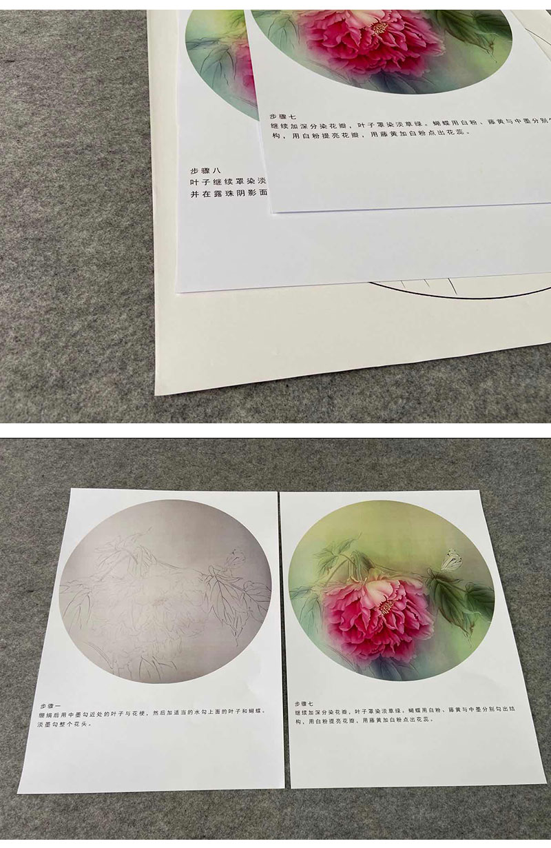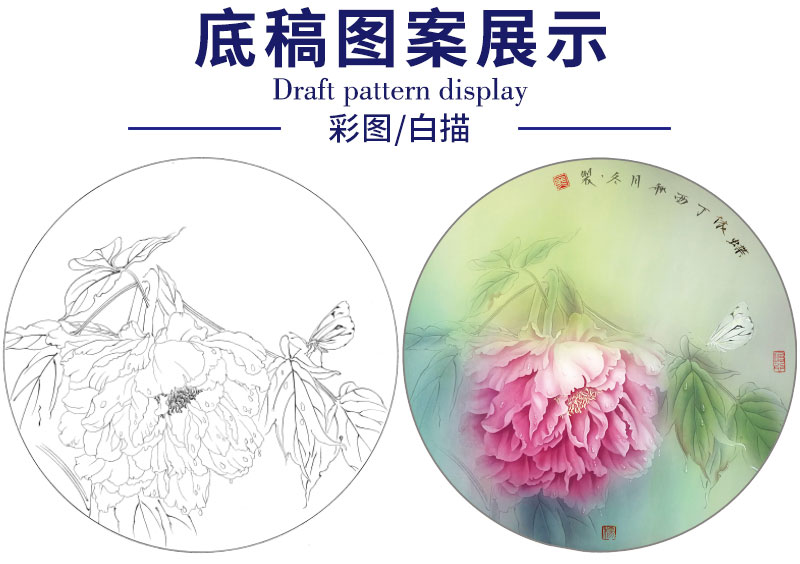 【有步骤、大彩图】杨冬冬工笔画白描底稿圆形小品《雨后》牡丹蝴蝶初学者临摹花鸟线稿HD39