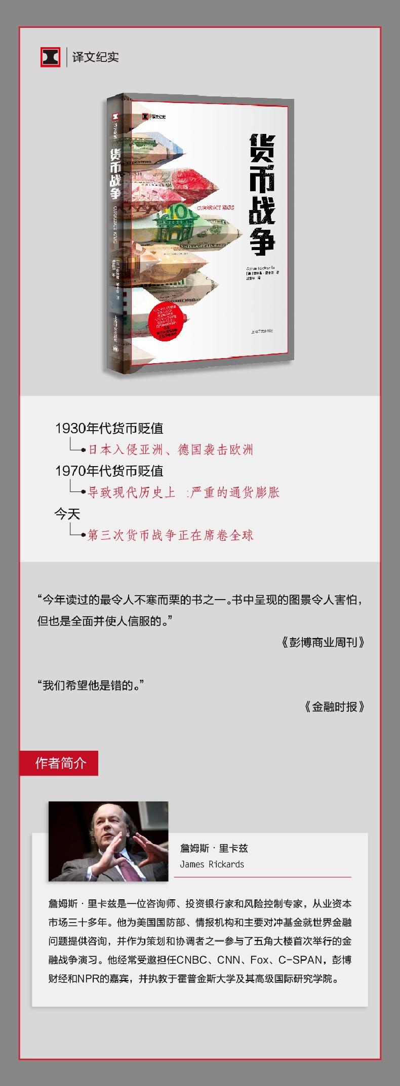詹姆斯•里卡兹是一位咨询师、投资银行家和风险控制专家,从业资本市场三十多年。他为美国国防部、情报机构和主要对冲基金就世界金融问题提供咨询,并作为策划和协调者之一参与了五角大楼次举行的金融战争演习。他经常受邀担任CNBC、CNN、Fox、C-SPAN,彭博财经和NPR的嘉宾,并执教于霍普金斯大学及其高级国际研究学院。