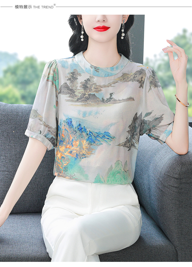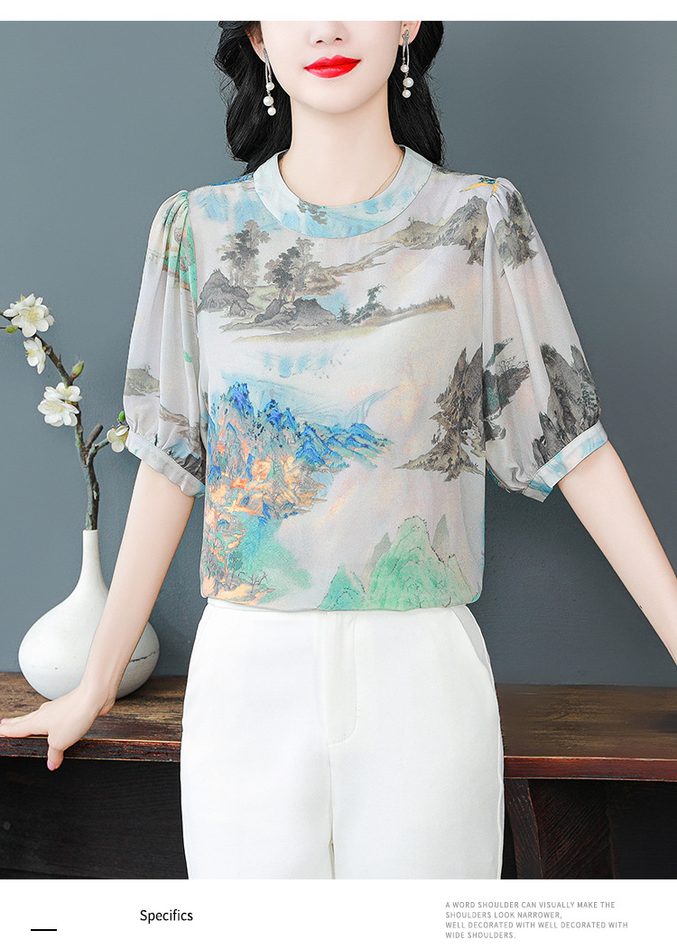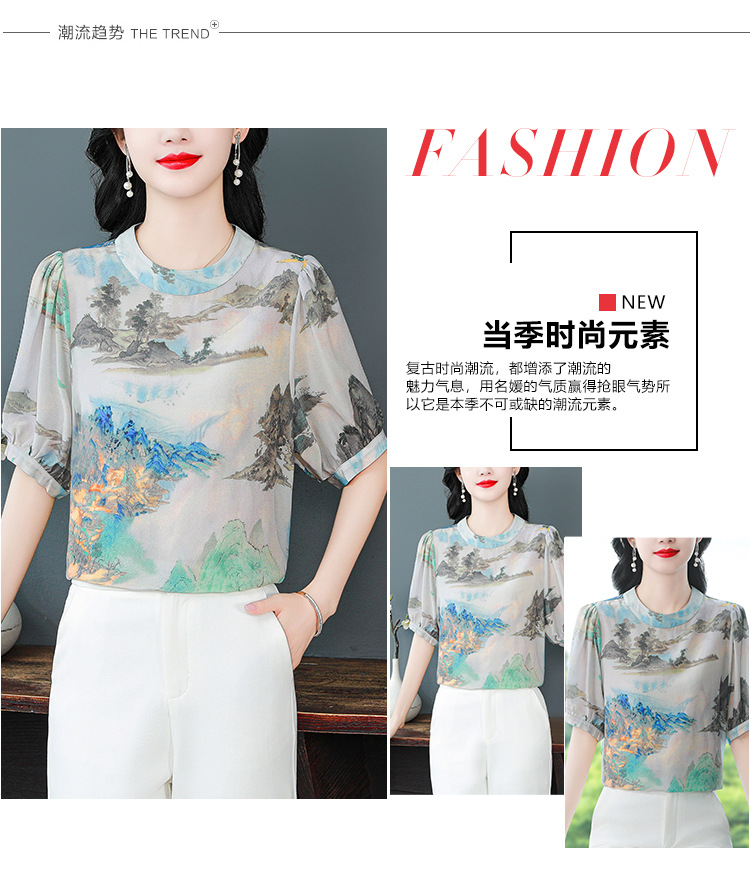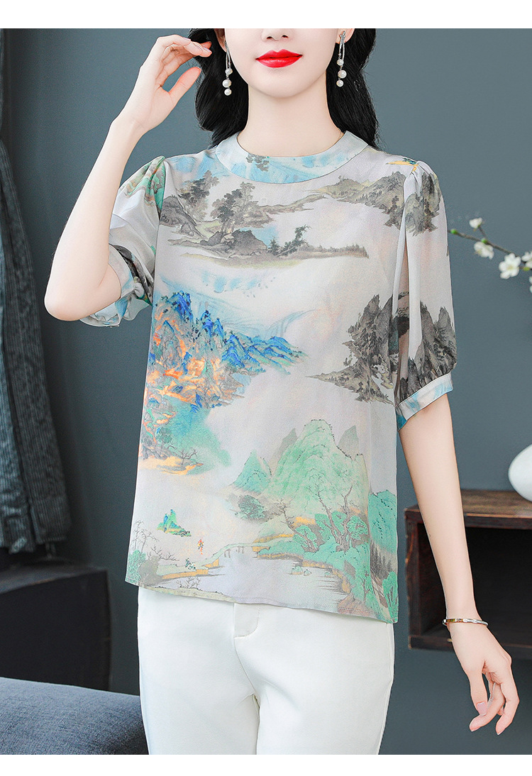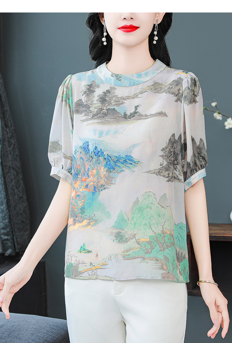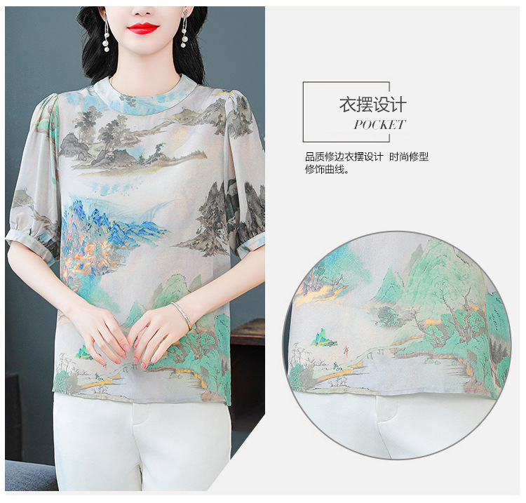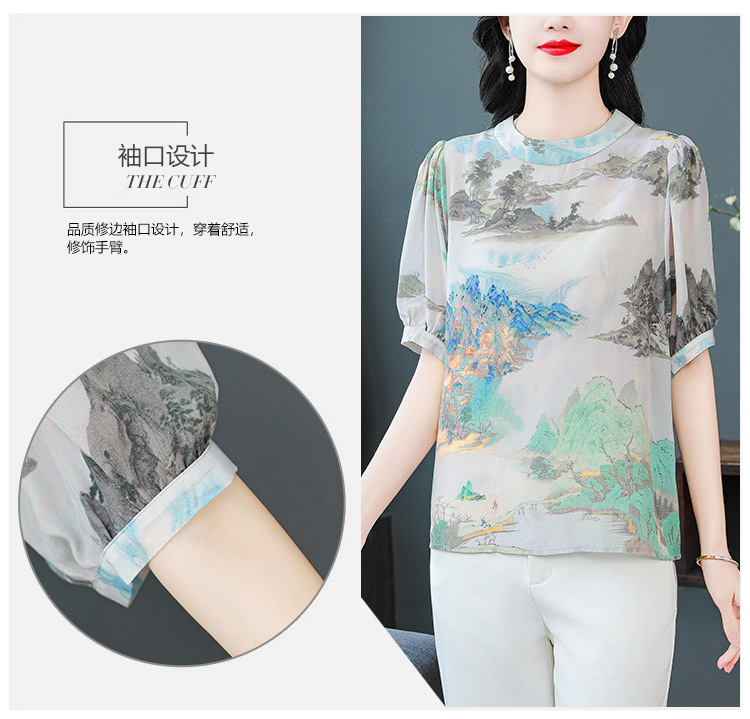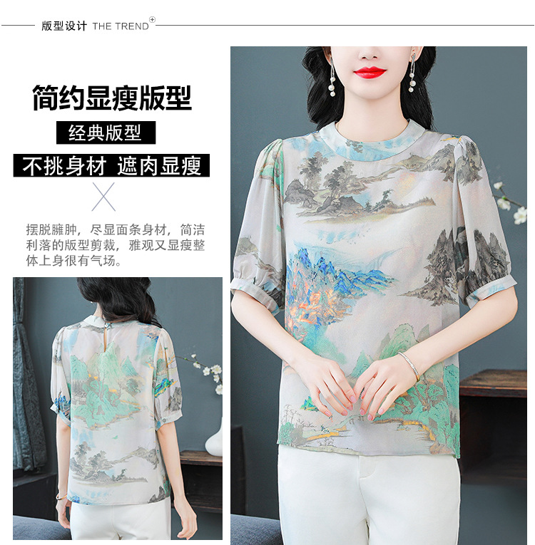SMZ18516国风印花小衫女士夏季2024新款中老年妈妈宽松遮肚子套头休闲上衣