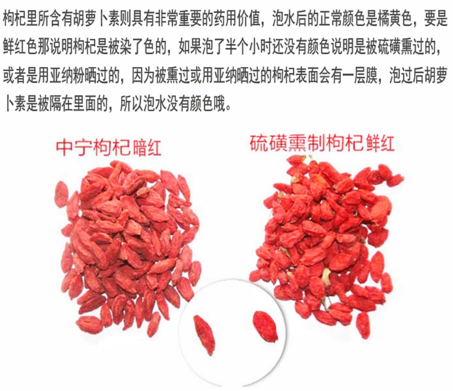 二、原材为当季新鲜枸杞果,无硫磺熏蒸,无防腐添加剂,无亚硫酸钠