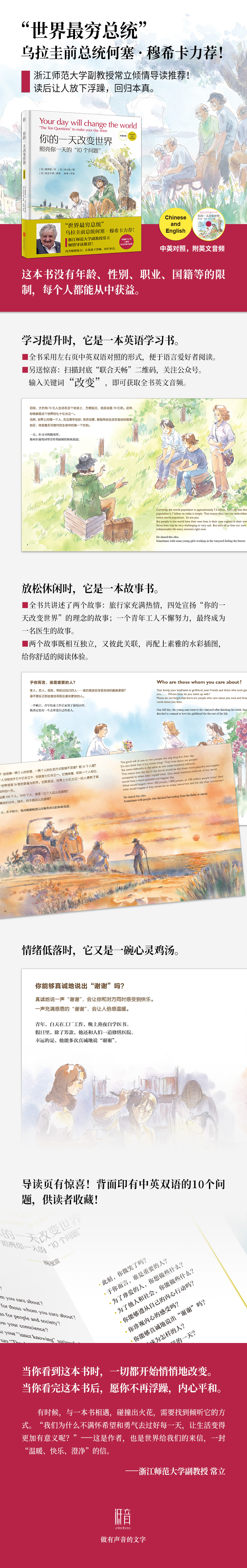 3.赠送双重惊喜!中英双语内文,扫描书内二维码,即可听全书英文音频,兼具语言学习功能;导读页背面印有超级励志的中英双语版“10个问题”,可收藏。