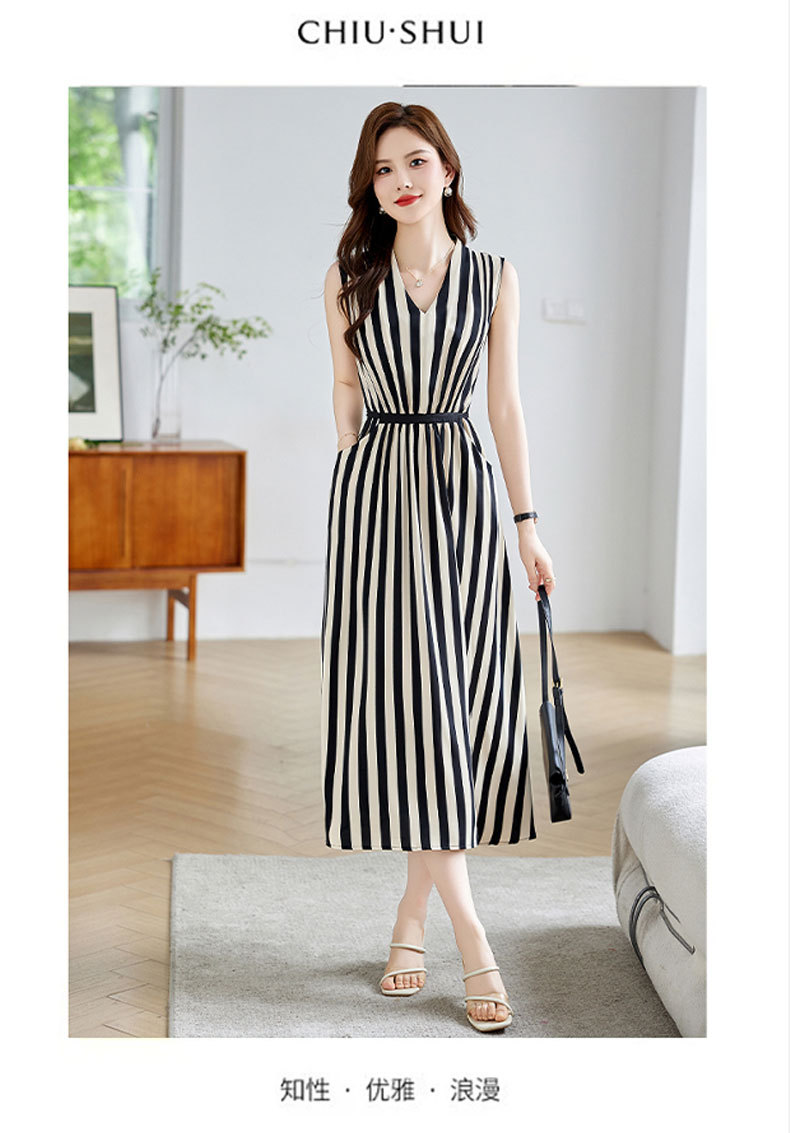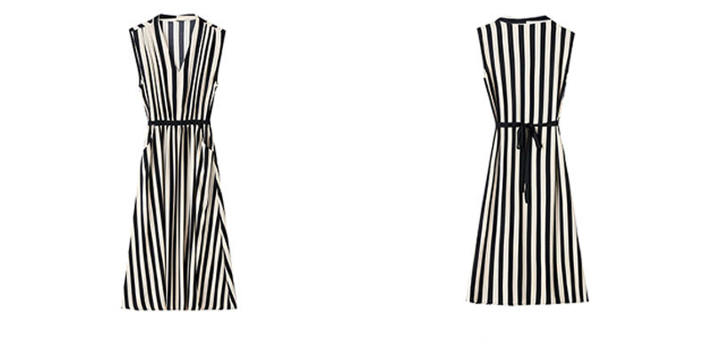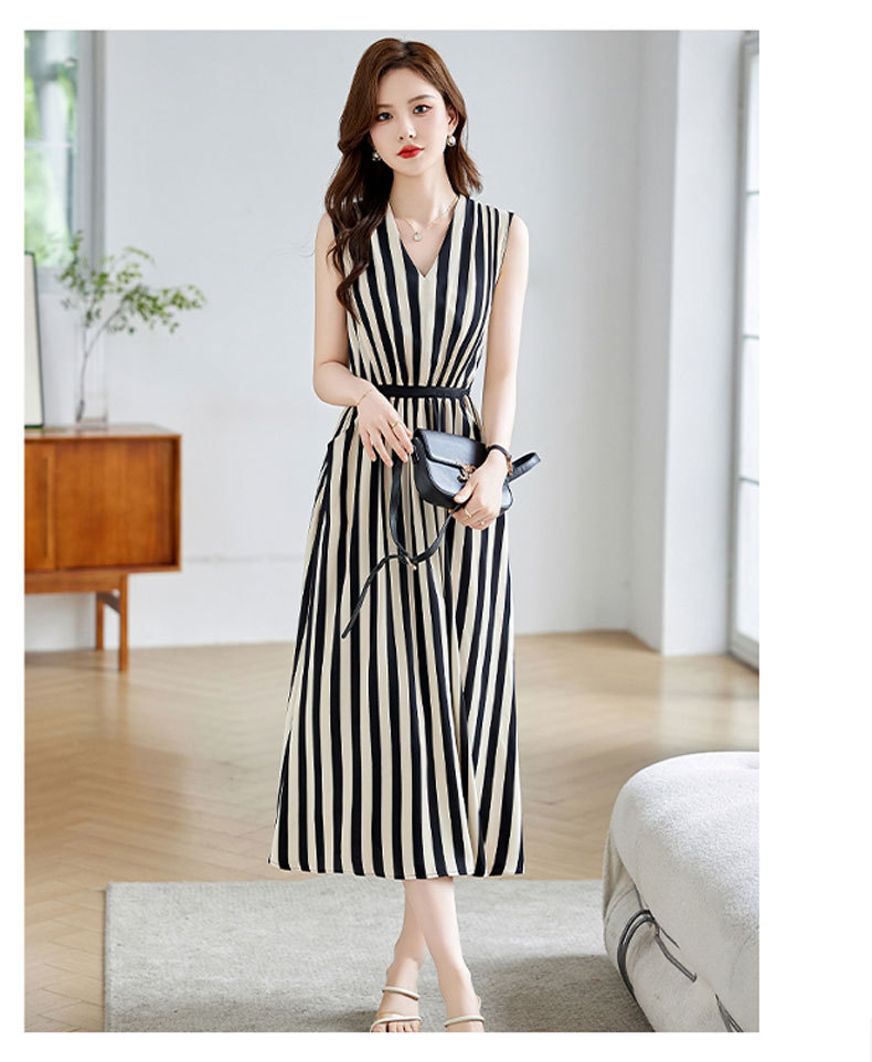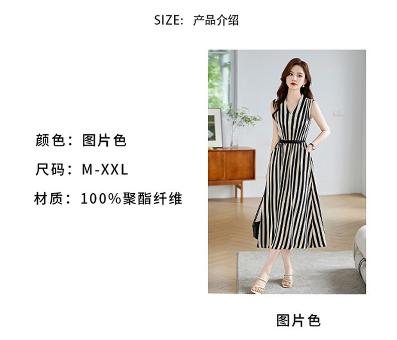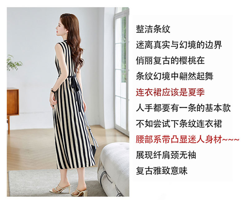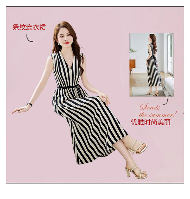 雀说 V领条纹背心连衣裙女夏新款系带收腰洋气长裙4ZF-5280