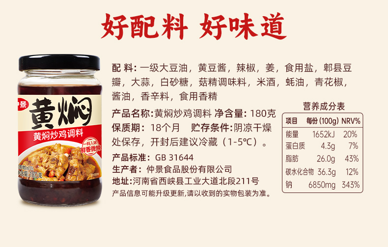 仲景黄焖炒鸡调料包黄焖酱汁黄焖排骨黄焖鱼炒菜调味酱料180g
