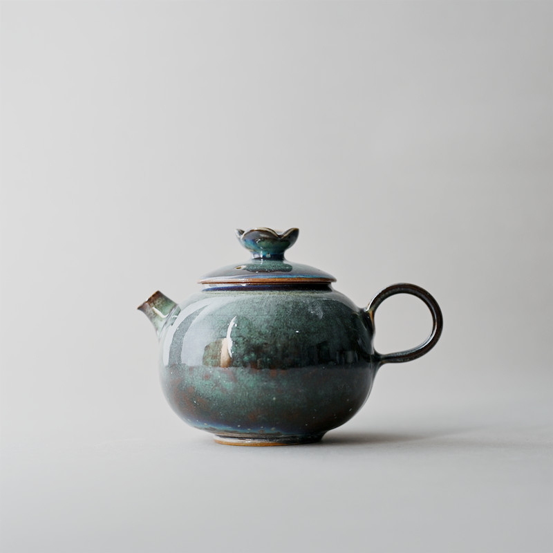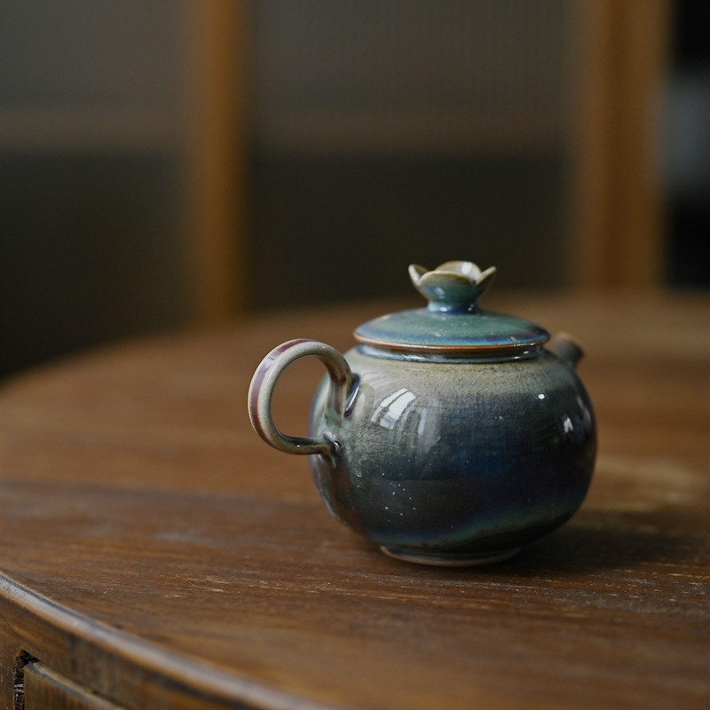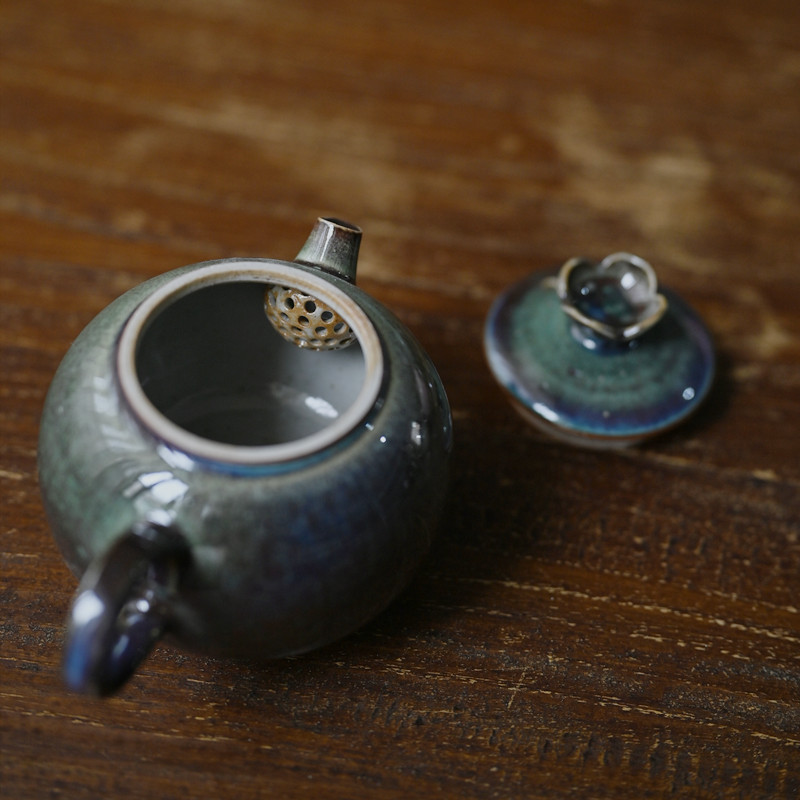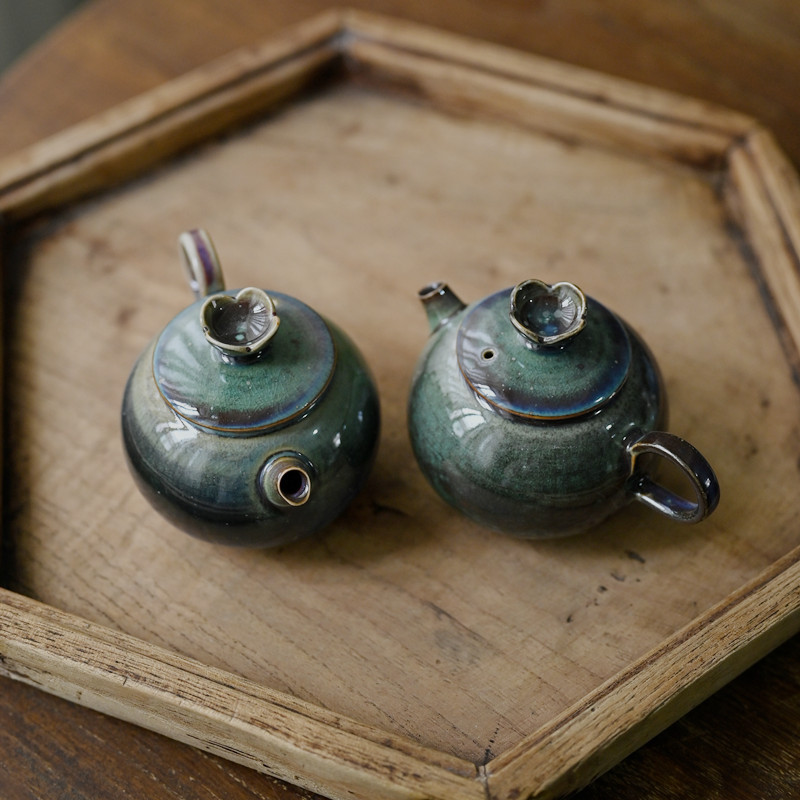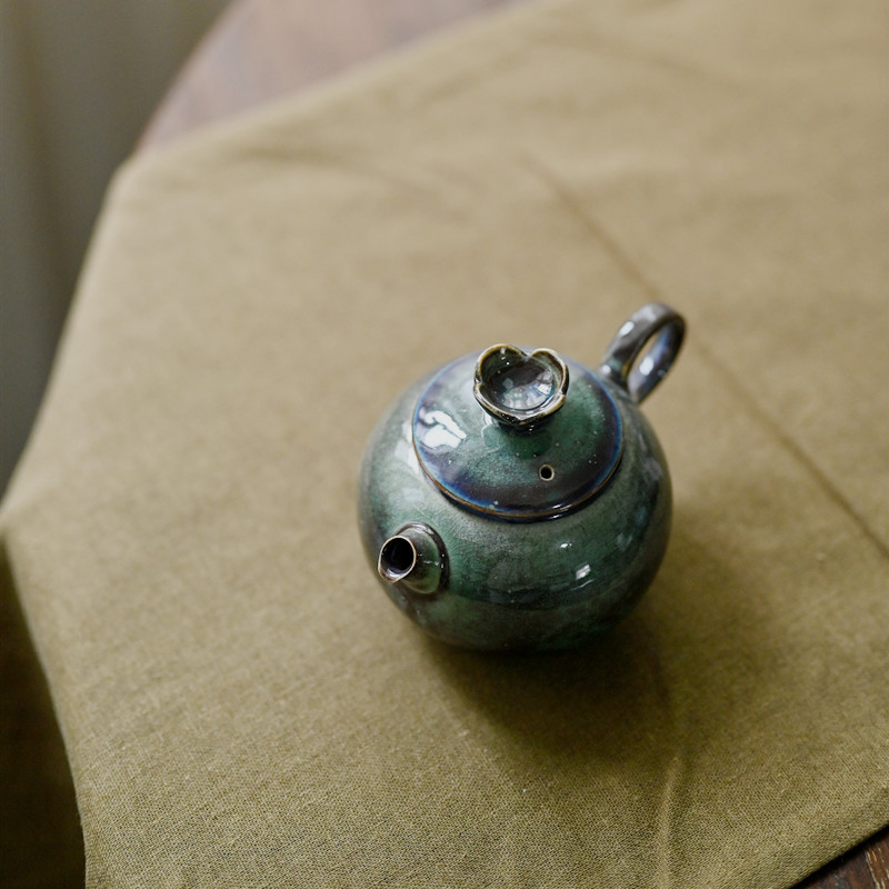 「景德镇手拉坯小茶壶」高温原矿孔雀绿釉粗陶球孔壶 家用小号陶瓷泡茶壶