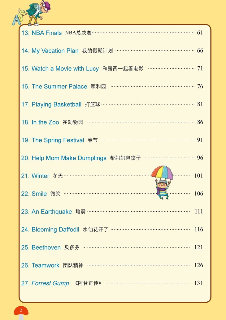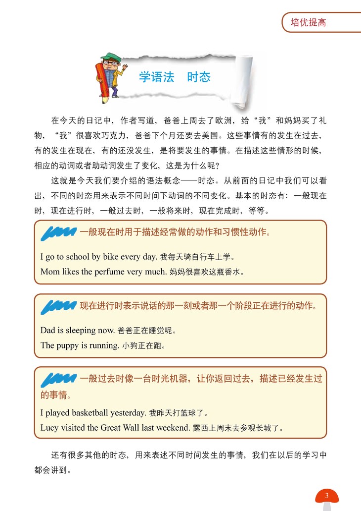 《小学生的第一本英语日记书:读故事+学语法+写日记(培优提高)》设计了27篇日记,深入小学高年级阶段的话题,增加句式难度和篇幅长度。每个单元第一部分是日记样本,并通过漫画图片分句解析日记全文,随后解析重点单词,扩展单词并提供了全文中文译文。第二部分针对写日记过程中出现的语法知识点进行归纳。第三部分解析日记的步骤,提供日记模板,以"日记口袋"的形式提供日记素材。