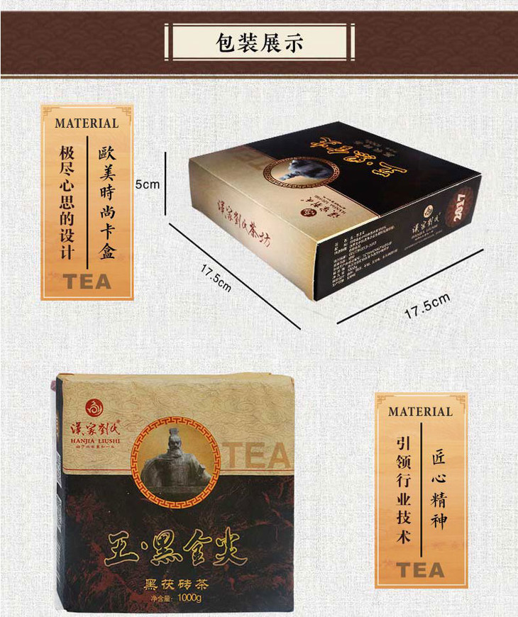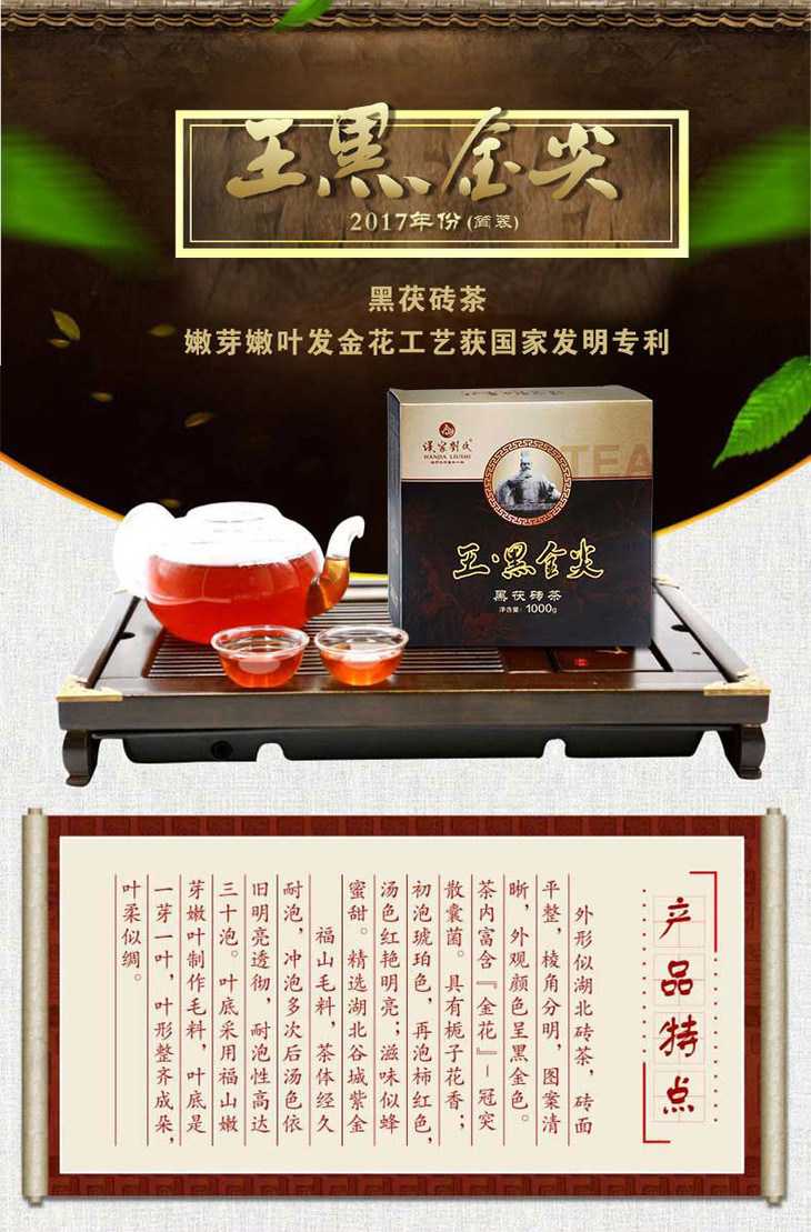 汉家刘氏 2017黑茶 湖北砖茶 王黑金尖 正宗两年金花茯砖 黑金尖 1kg 礼盒装