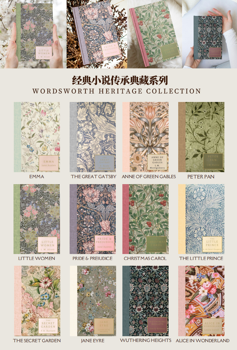 由我们才华横溢的总监 Nichola 精心设计。该系列采用四分之一布面装订,使用柔软的亚麻布。这些版本配有 4 色印刷图案衬页、丝带标记、页头和页尾带以及金属镀金页边。精美的设计符合复古时尚的流行趋势,非常适合放在您的书架上。封面是由知名艺术家 William Morris 和 William Kilburn 创作的。