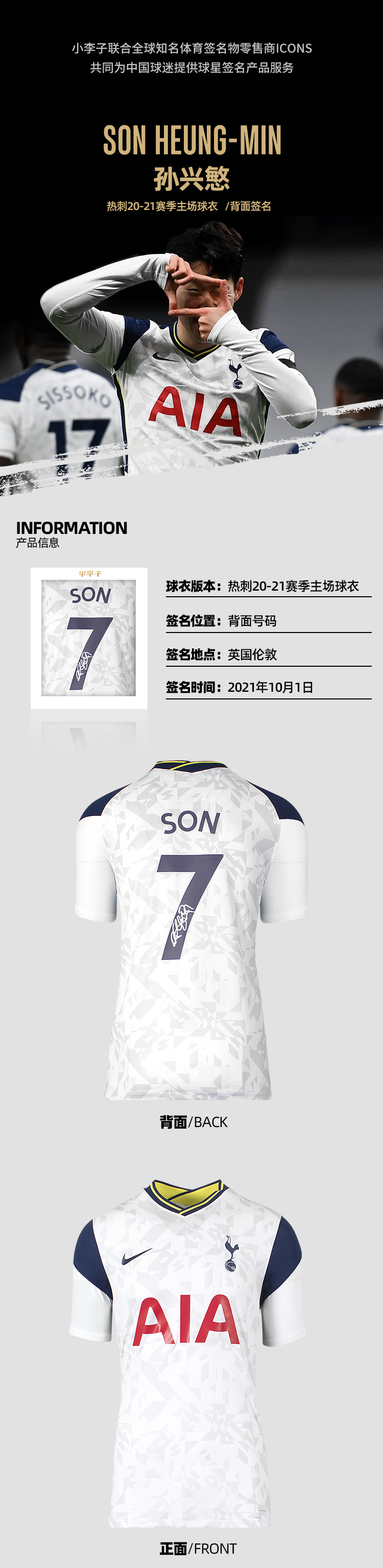 孙兴慜亲签热刺20-21赛季主场签名球衣含证书