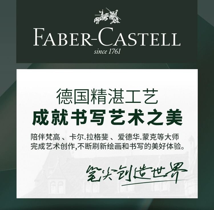 - 德国辉柏嘉,始创于1761年的家族品牌,历经259年岁月洗礼的制笔权威,一直致力于提供高品质书写及绘画艺术创作工具的专业制造商。
