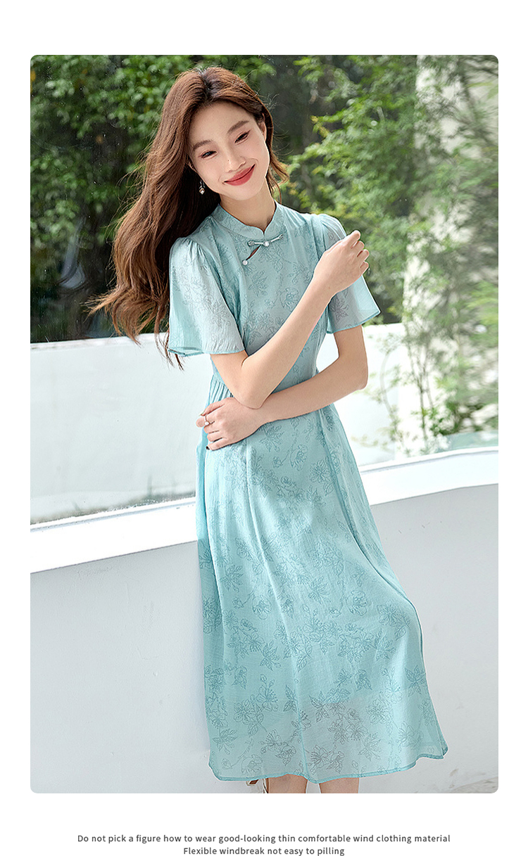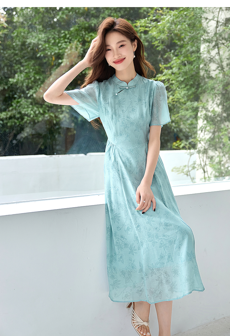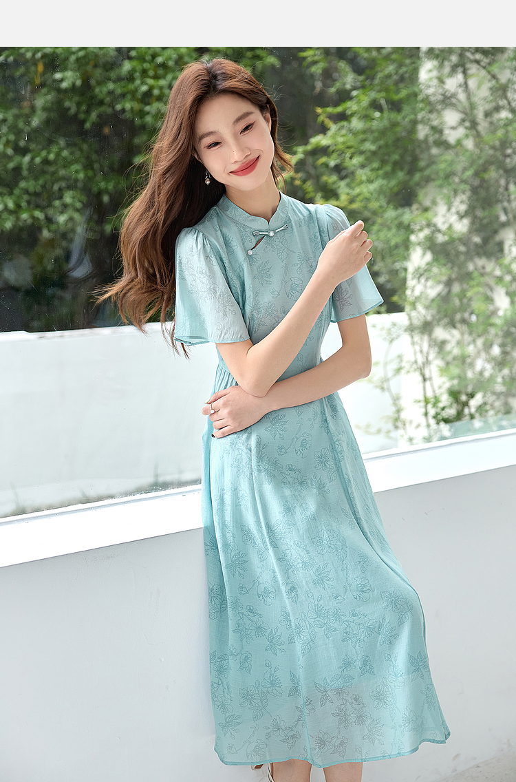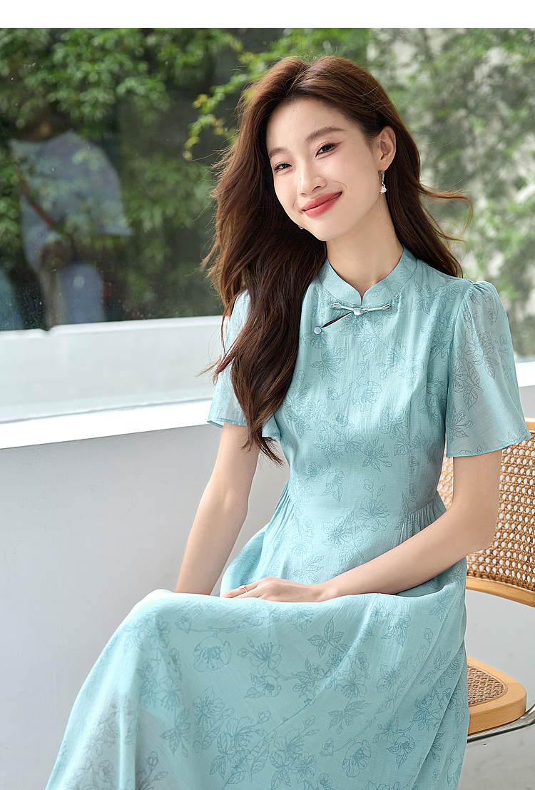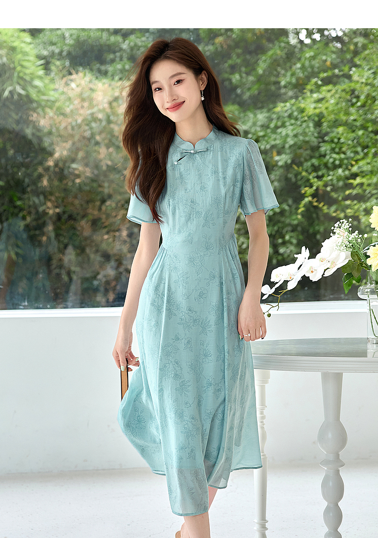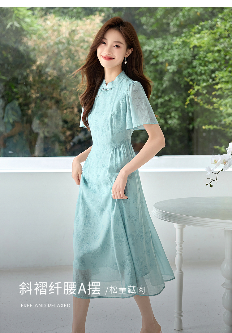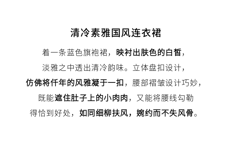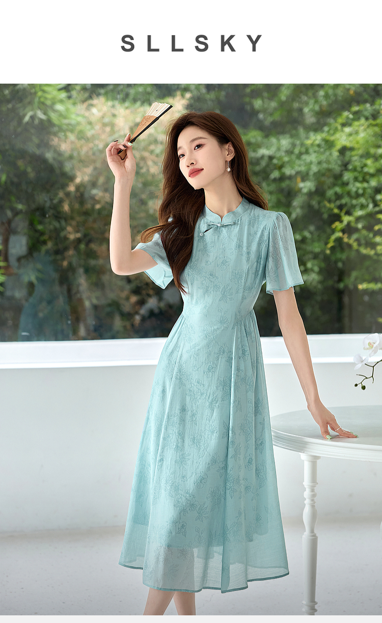【五折购】熙世界2025夏女装新中式国风线描压花清冷感蓝色改良旗袍连衣裙