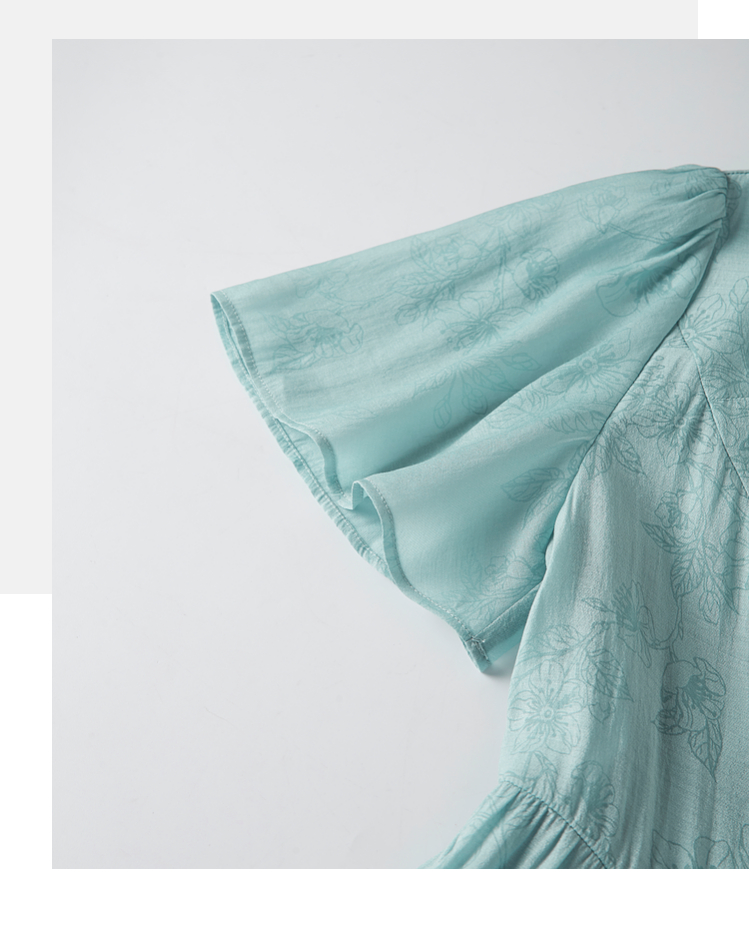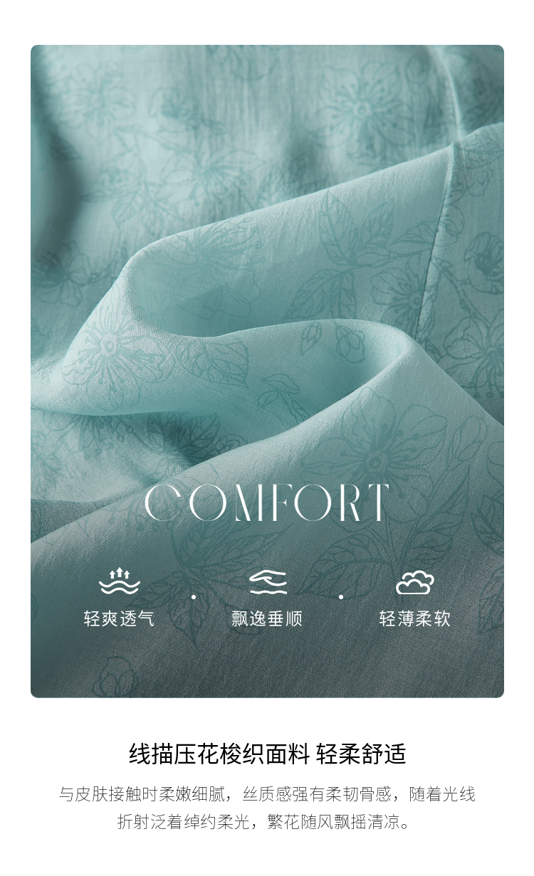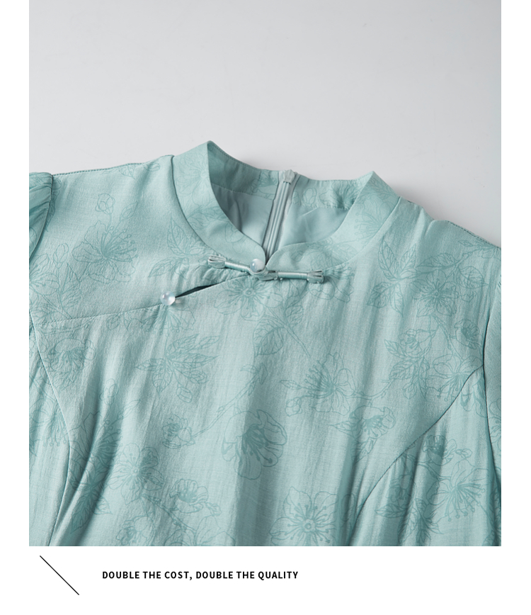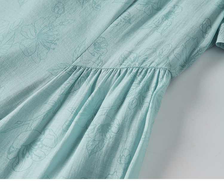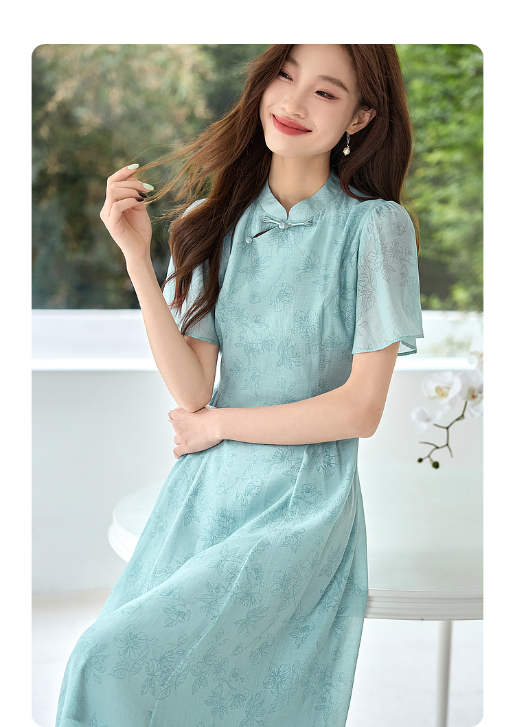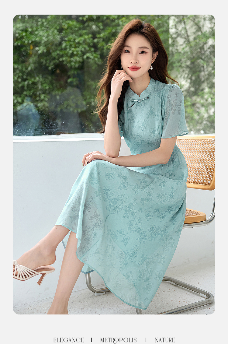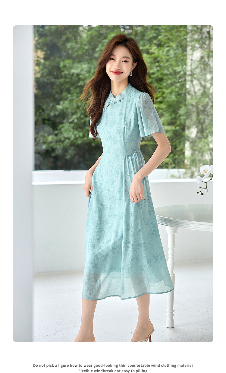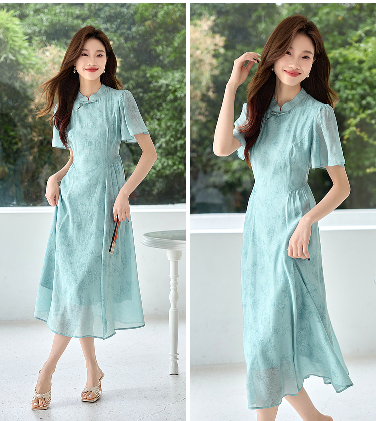 【五折购】熙世界2025夏女装新中式国风线描压花清冷感蓝色改良旗袍连衣裙