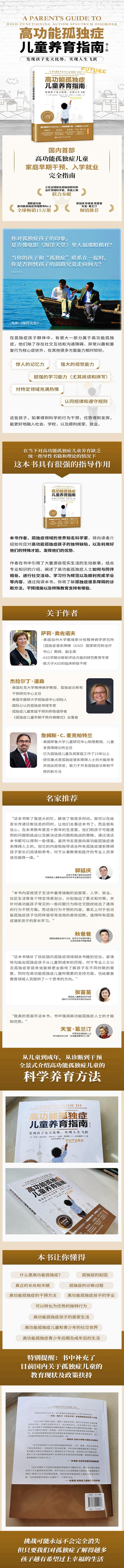 这本书是养育高功能孤独症人士的推荐指南,至今已经使超过15万家庭受益。本书作者、孤独症领域的世界有名专家,将向读者介绍如何应对高功能孤独症孩子的独特缺陷,以及利用好他们的特殊才能、发挥他们的优势。作者在书中引用了大量源自现实生活的生动故事,结合专业知识的介绍,阐述了高功能孤独症人士如何与同伴相处、进行社交活动、学习行为规范以及顺利完成学业等内容。通过阅读本书,你将了解孤独症谱系障碍的诊断方法、干预措施以及特殊教育支持有哪些。这个近期新修订的版本增加了近期新的研究成果和资源,包括DSM-5诊断标准的变化。