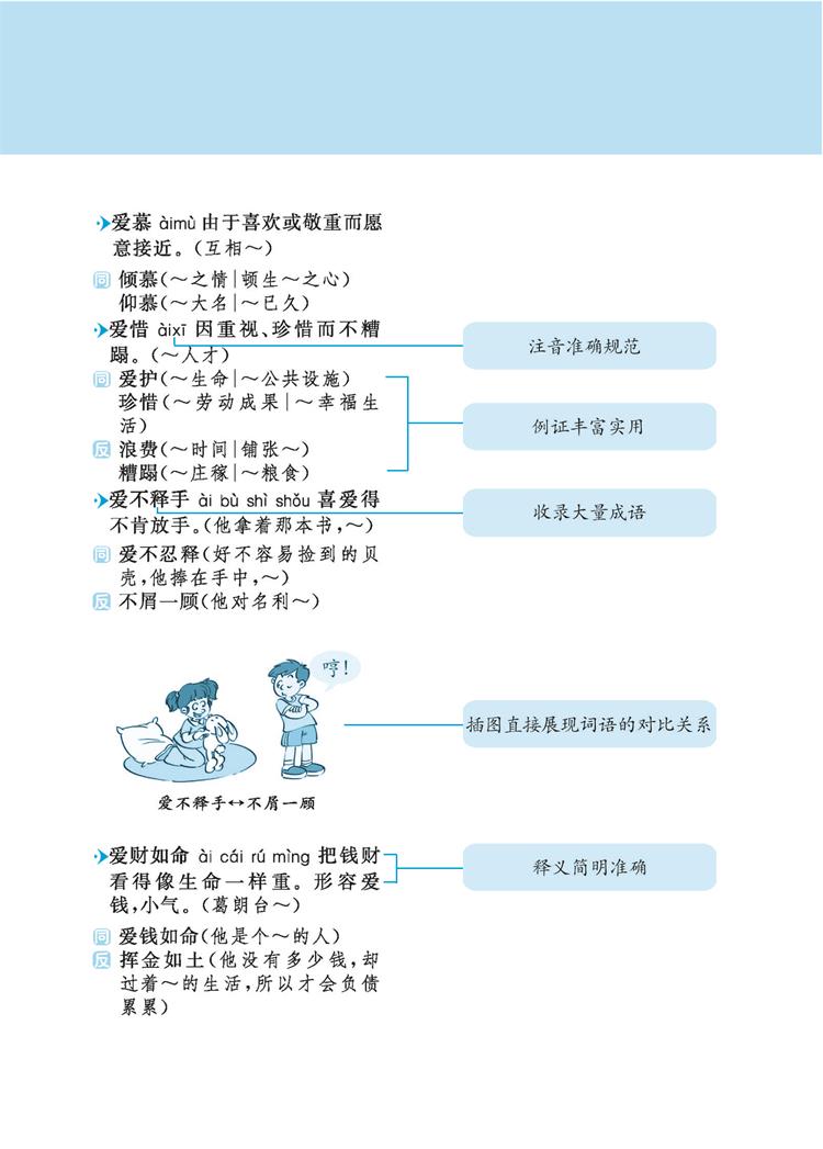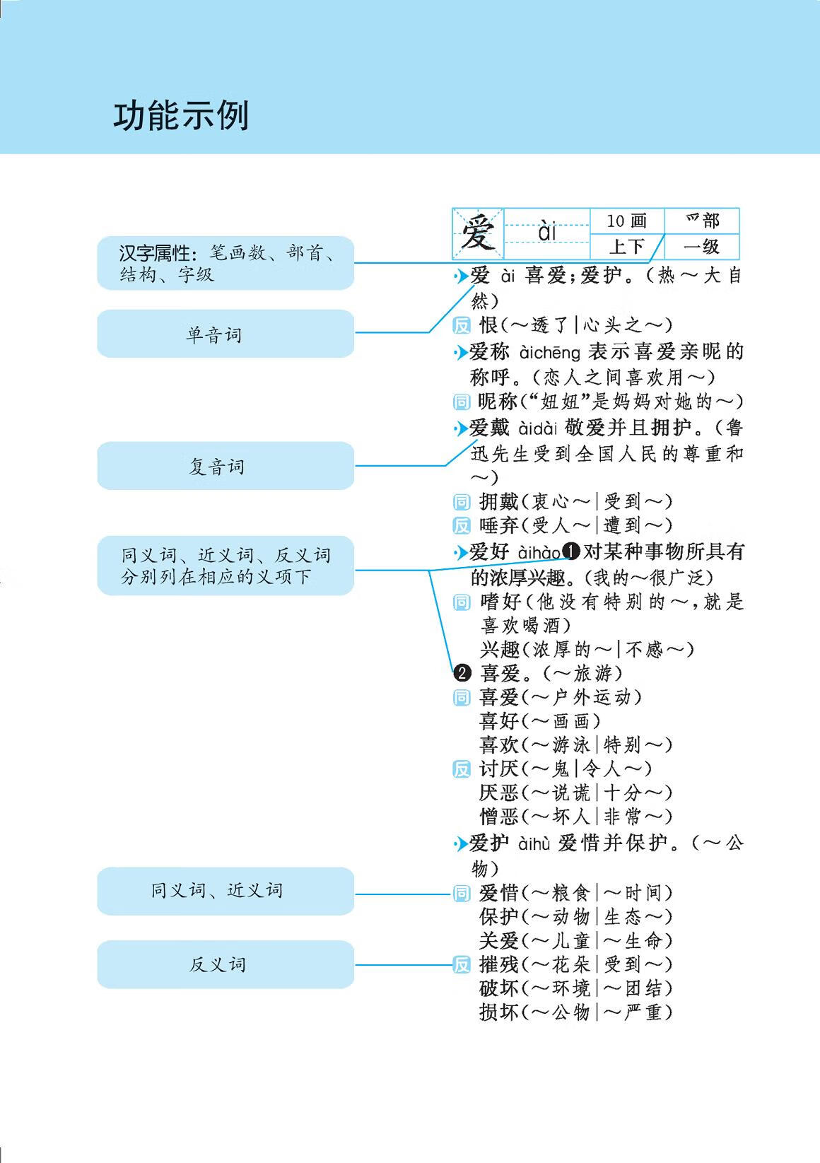 《新课标部编版小学生同义词近义词反义词词典》根据语文课程标准和部编版语文教材编写,收录总词条20000余条,搭配30000余条。同义词近义词、反义词分别列在相应的义项下。具有笔画数、部首、结构、字级、注音、释义、同义词、近义词、反义词、组词、搭配、造句、插图等13种功能。