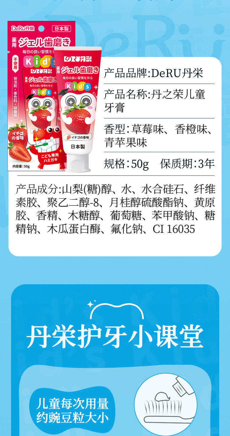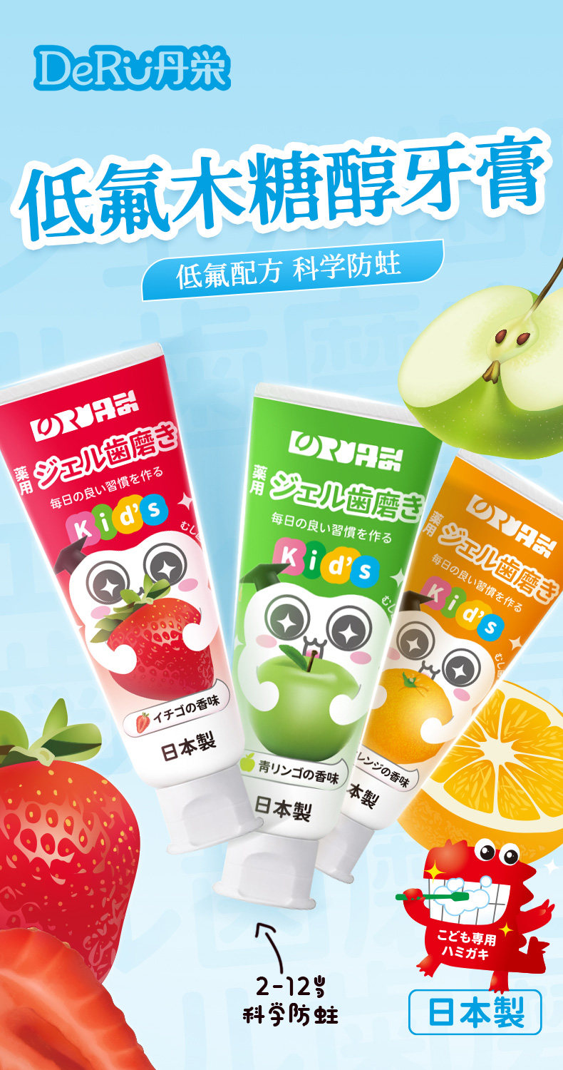 DeRU丹栄 儿童含氟防蛀牙膏50g(青苹果/草莓/香橙味)
