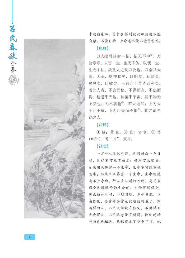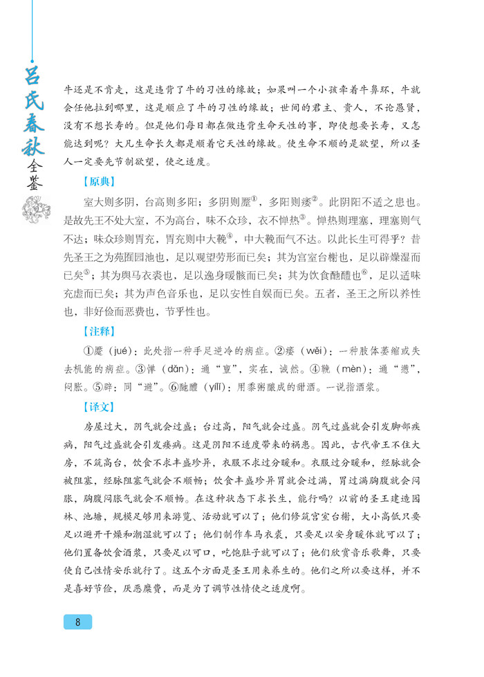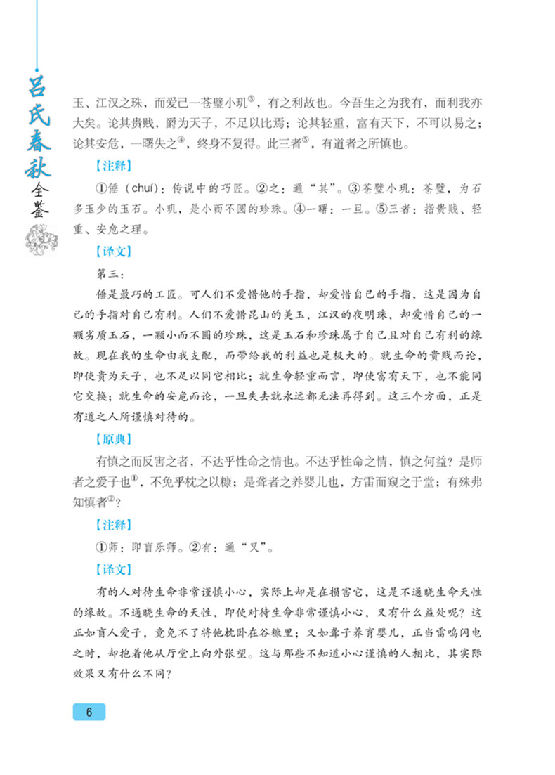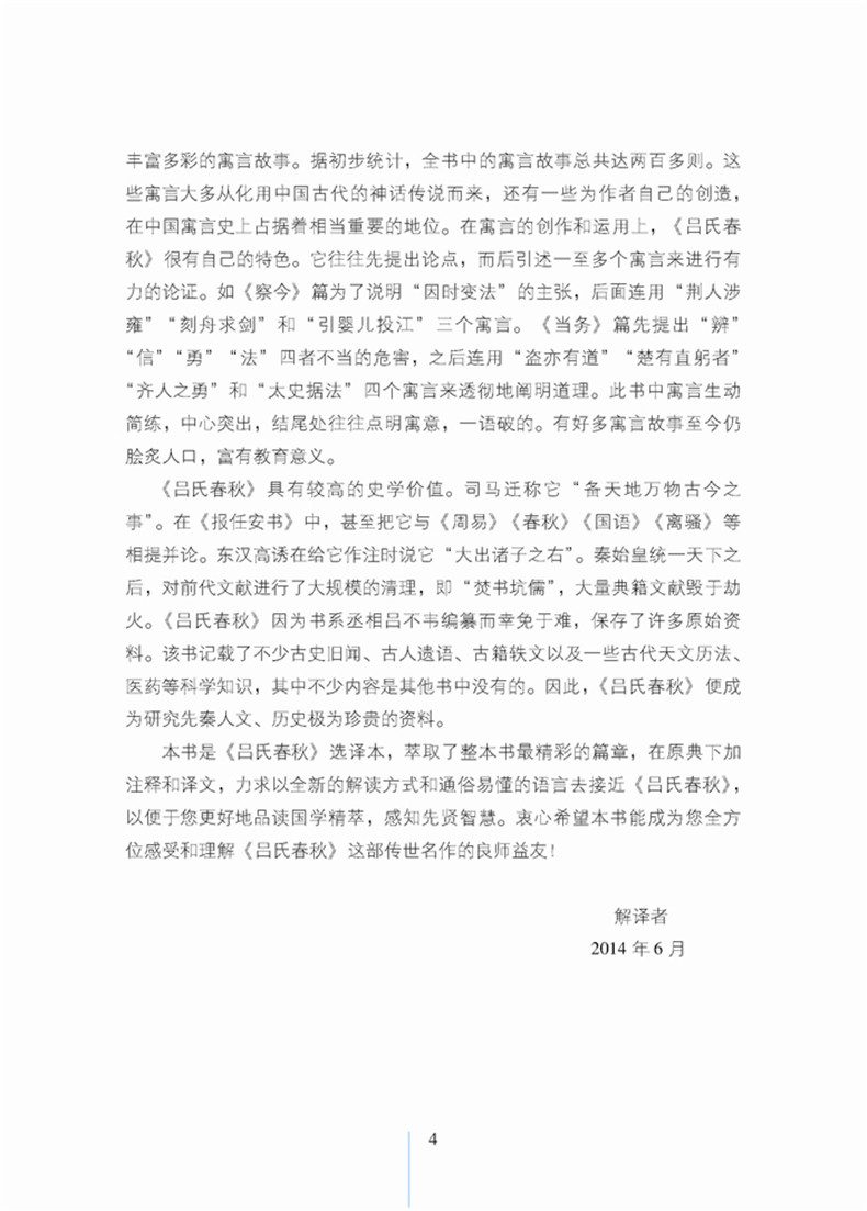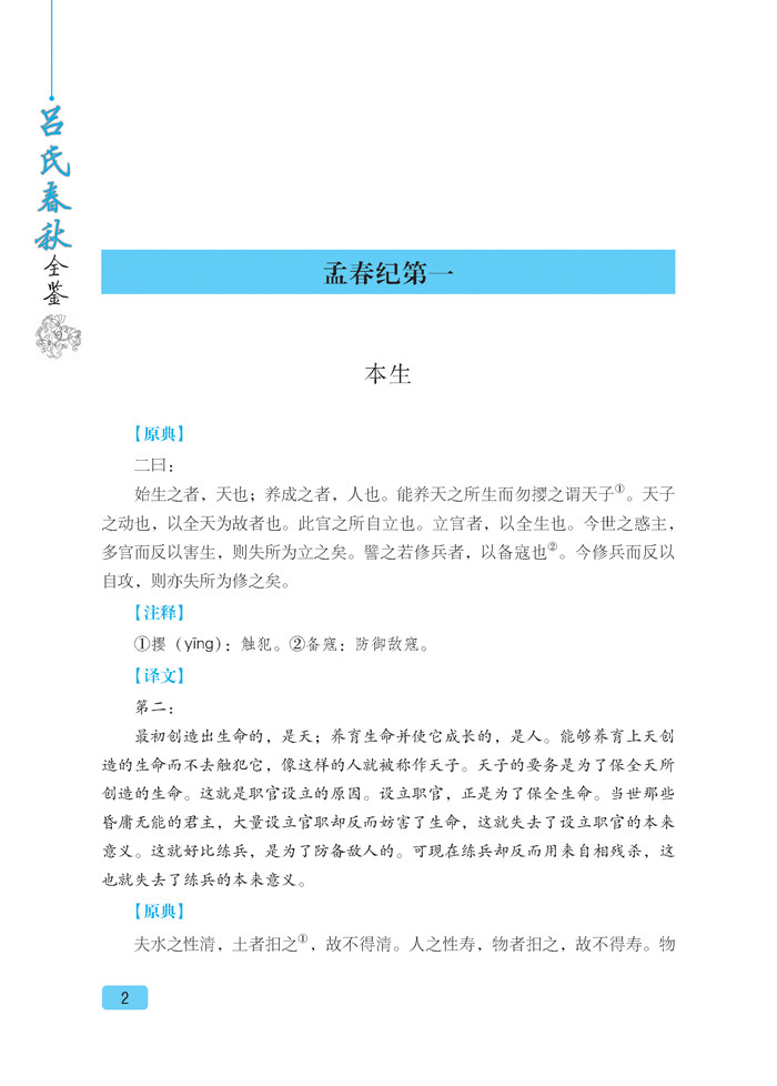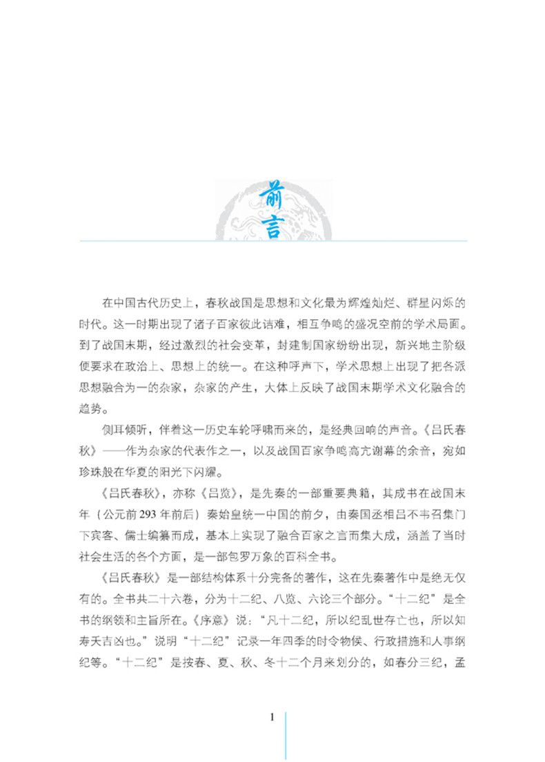 《吕氏春秋》,亦称《吕览》,是先秦的一部重要典籍,融合了儒、道、墨、法、兵、农、纵横、阴阳等各家思想,同时此书还蕴含了丰富的哲学、军事、教育、农业思想等,几乎包含了先秦学术领域的各个侧面,是一部包罗万象的百科全书,对后世产生了极其深远的影响。《吕氏春秋》是一部结构体系十分完备的著作,这在先秦著作中是绝无仅有的。书中记载了不少古史旧闻、古人遗语、古籍轶文以及一些古代天文历法、医疗等科学知识,其中不少内容是其他书中没有的。因此,该书是研究先秦人文与历史的极为珍贵的资料。本书萃取了整本书最精彩的篇章,在原典下加注释和译文,力求以全新的解读方式和通俗易懂的语言去接近《吕氏春秋》,以便于您更好地品读国学精萃,感知先贤智慧。
