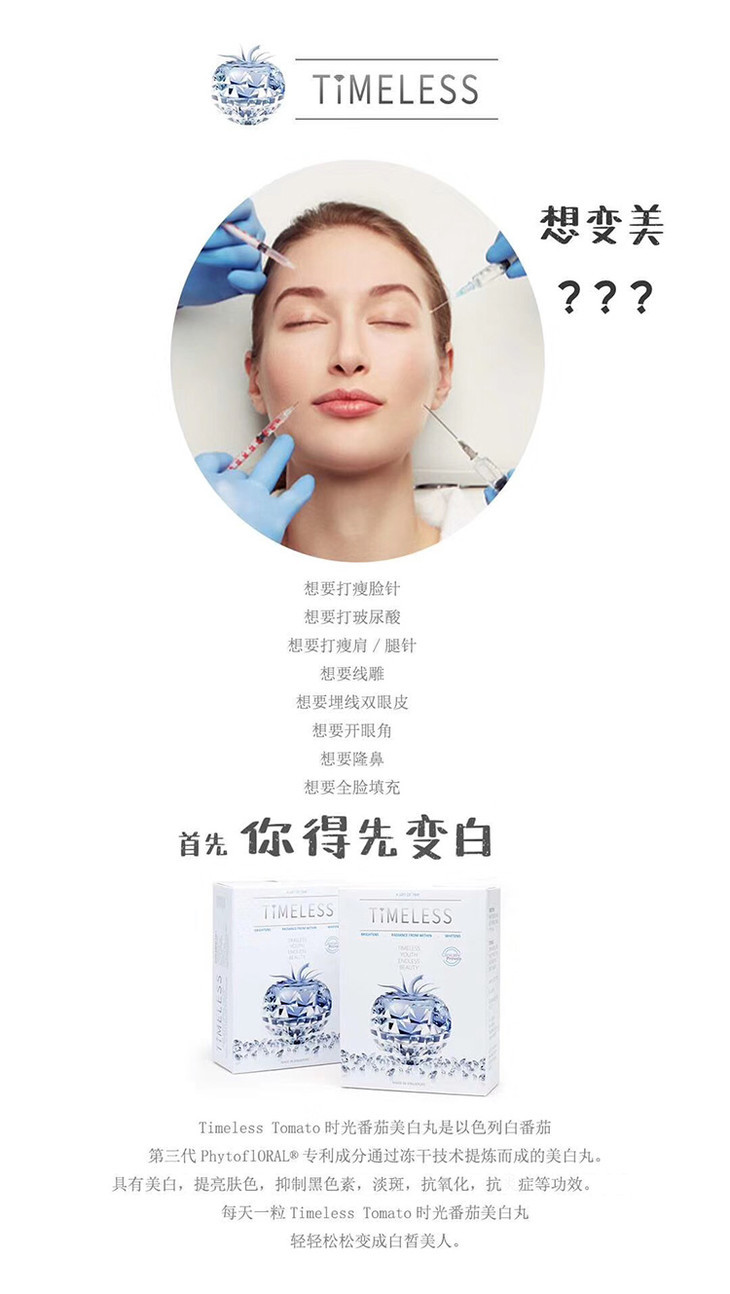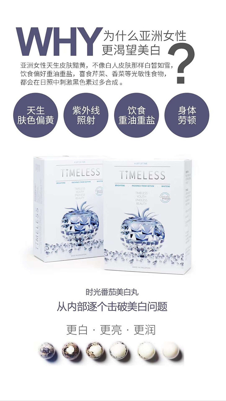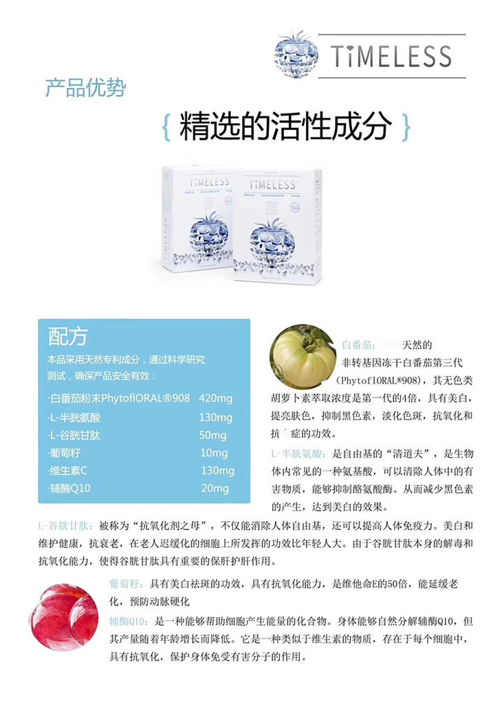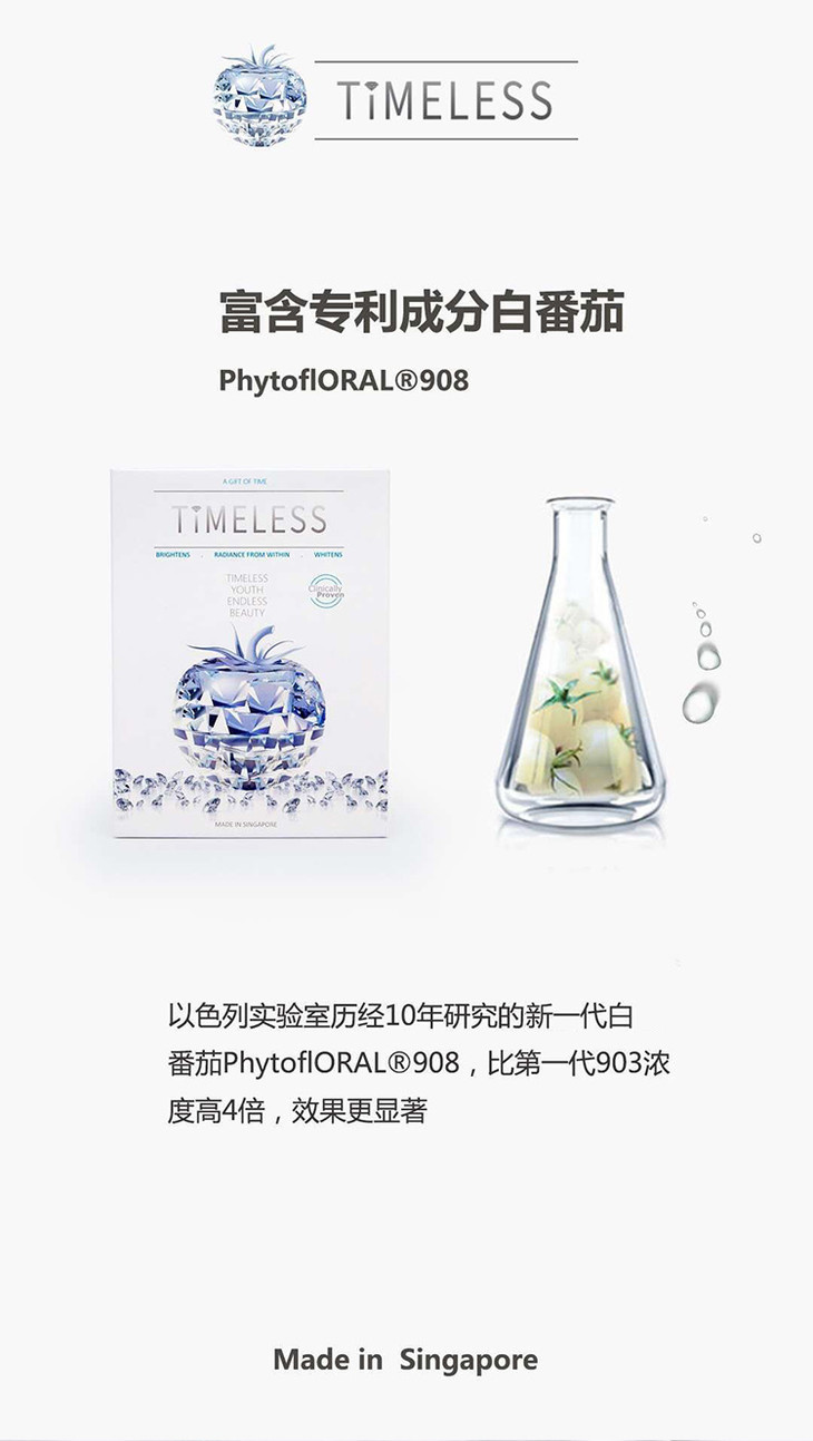 除了天然防晒,TIMELESS TOMATO时光番茄美白丸在美白提亮方面有着显著的功效。其采用了最新型号TP0908型白番茄,有效成分可以达到同类番茄美白丸的4倍,并且因其胶囊状的形态在人体过程中不会有损耗,能够最高效的到达肌肤直接吸收。经临床实验证明,时光番茄美白丸的见效时间可以快至21天,并且可以做到使全身肌肤提亮美白。