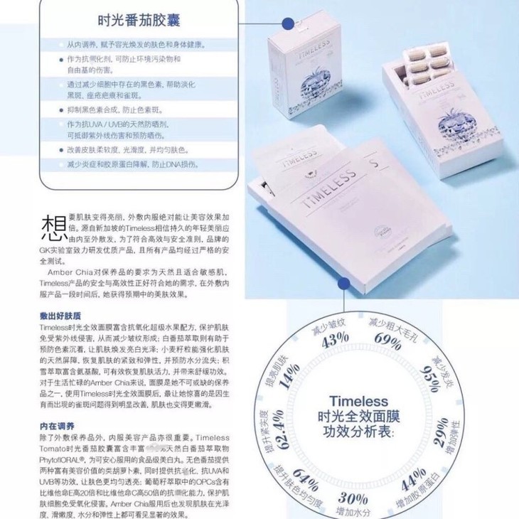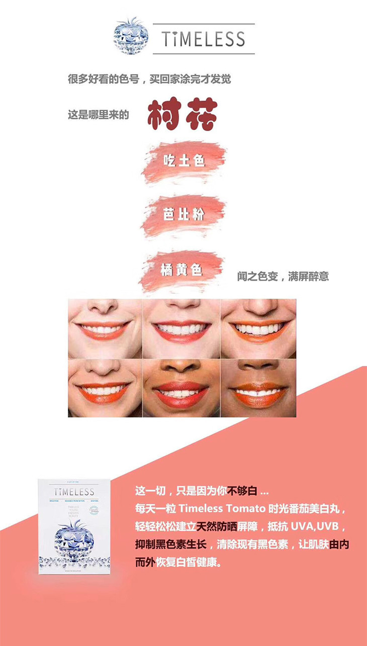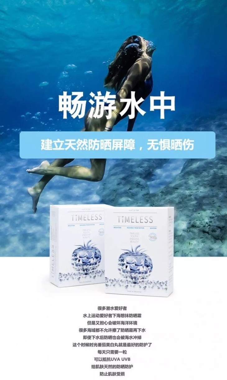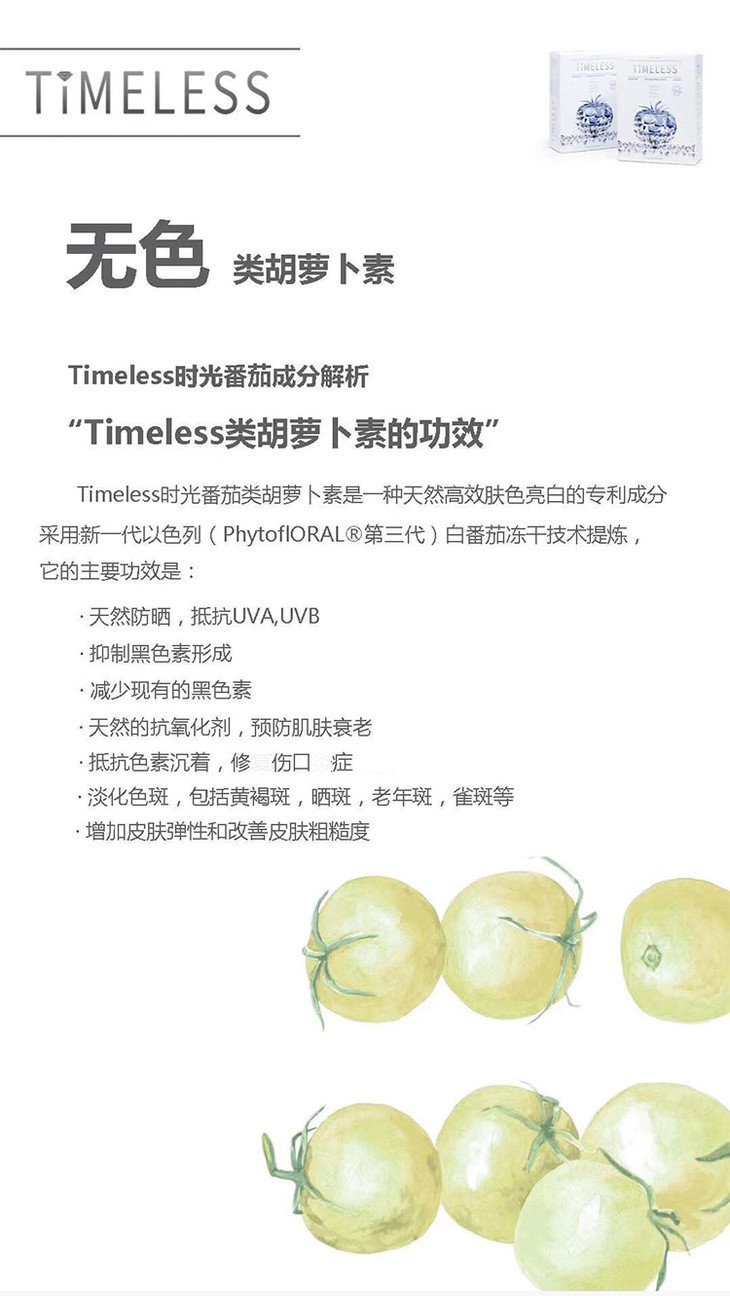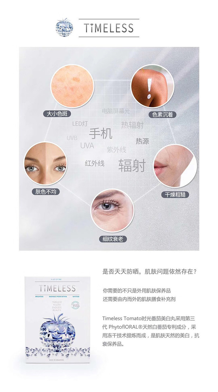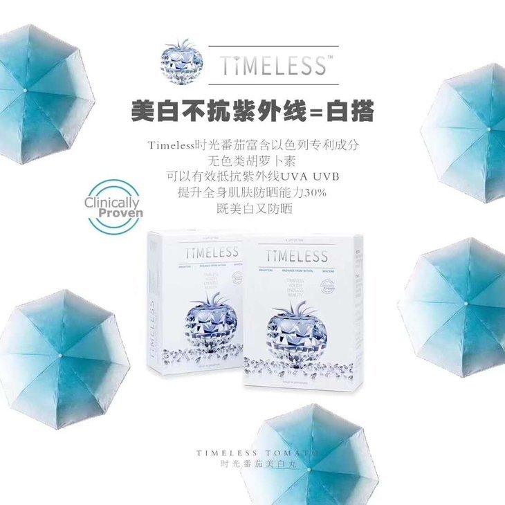 Timeless时光番茄可以抵抗UVA UVB,具有天然防晒的功效,像喜欢旅行,户外运动的小姐姐就可以把它当做日常的防晒,吃了之后自身抵抗日晒的肌肤防御能力上升 30%,很多人吃了也表示去热带旅游也没有晒黑。所以很多人出门上班,旅行,户外都带着它。一天一粒还超级方便的。