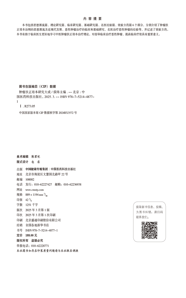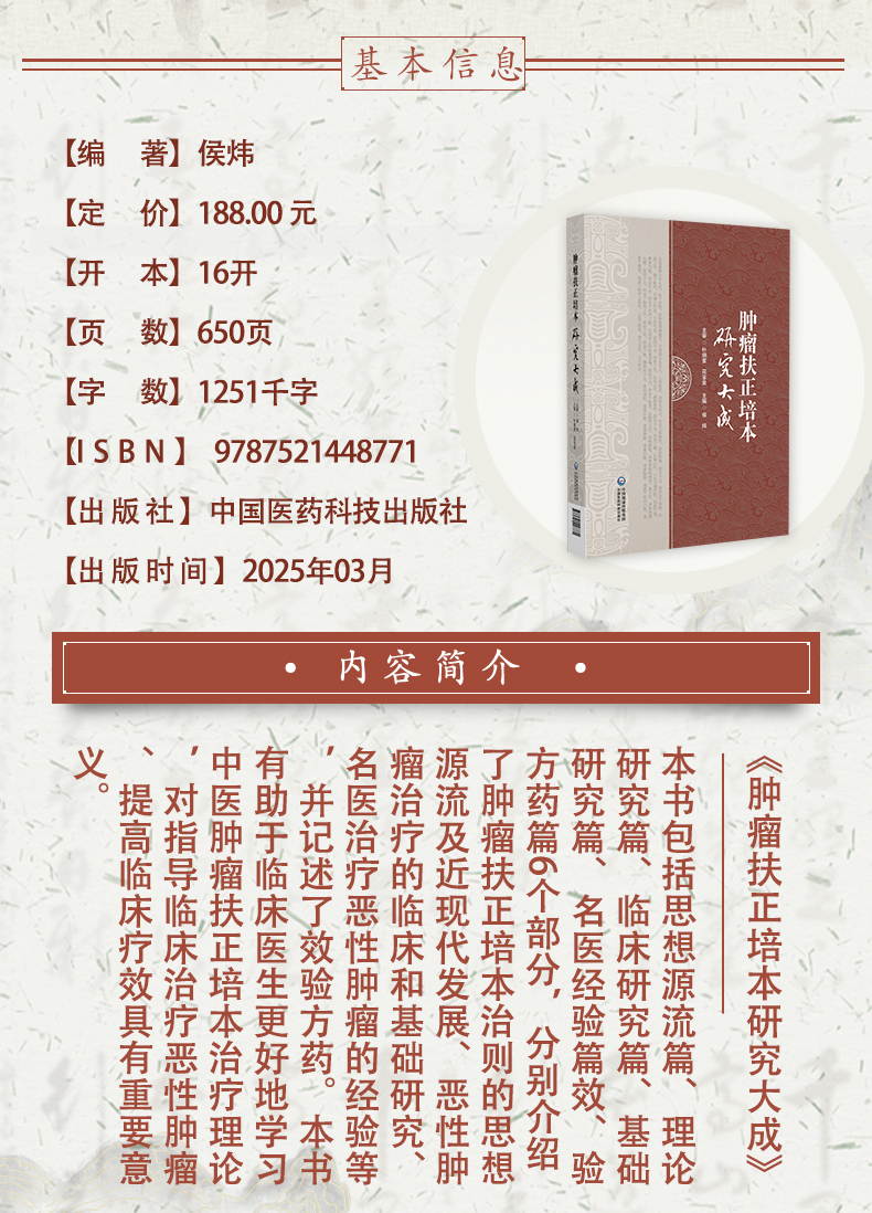 肿瘤扶正培本研究大成 侯炜 本书包括思想源流篇理论研究篇临床研究篇基础研究篇名医经验篇效验方药篇6个部分中国医药科技出版社
