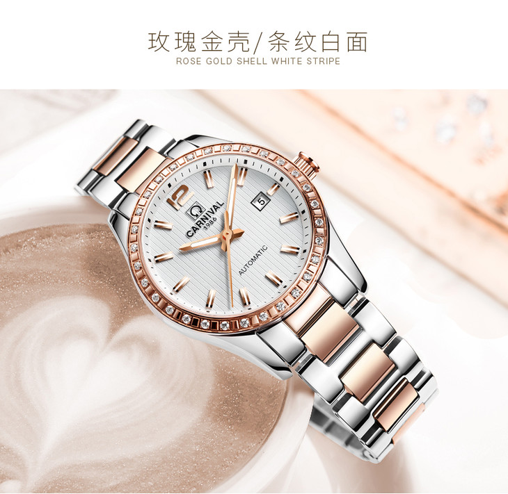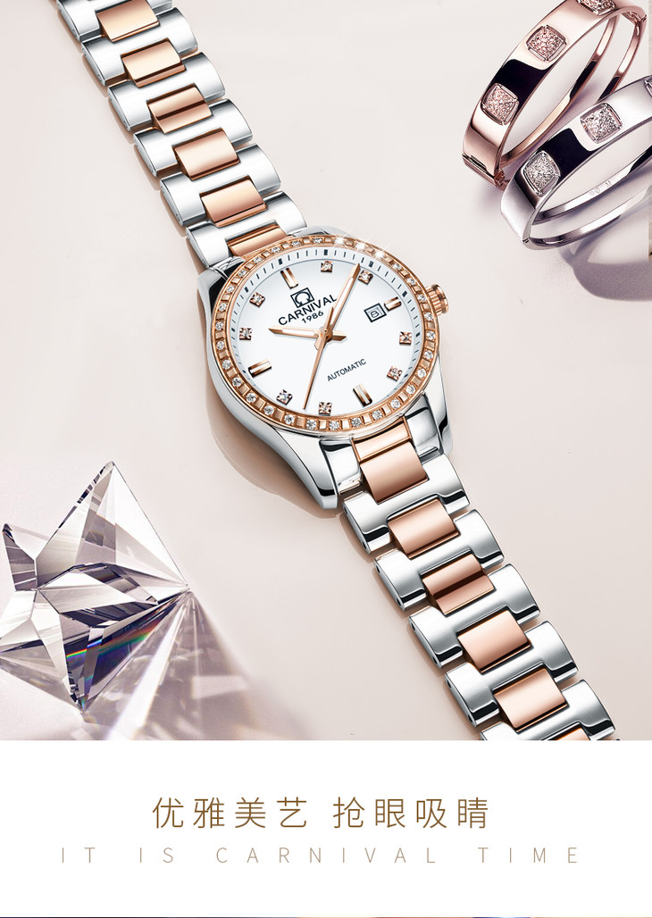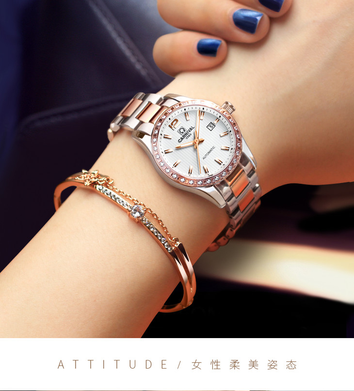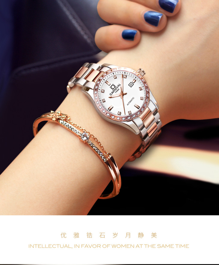 嘉年华(Carnival)手表女士机械表时尚镶钻夜光防水自动机械情侣手表 女士 8685