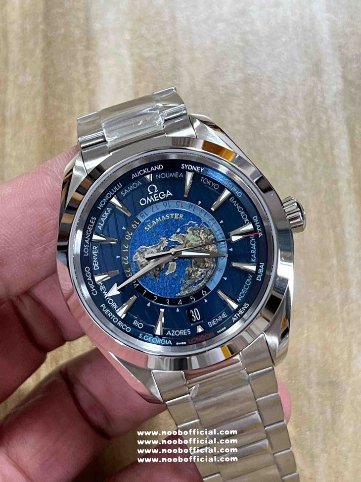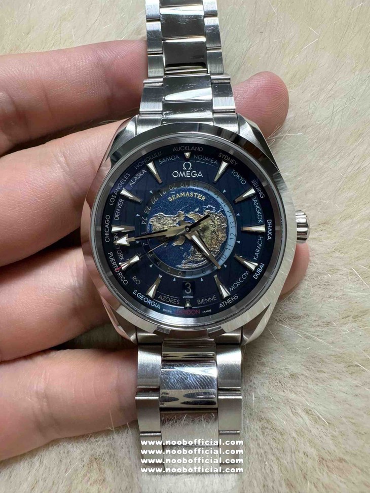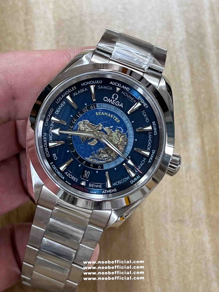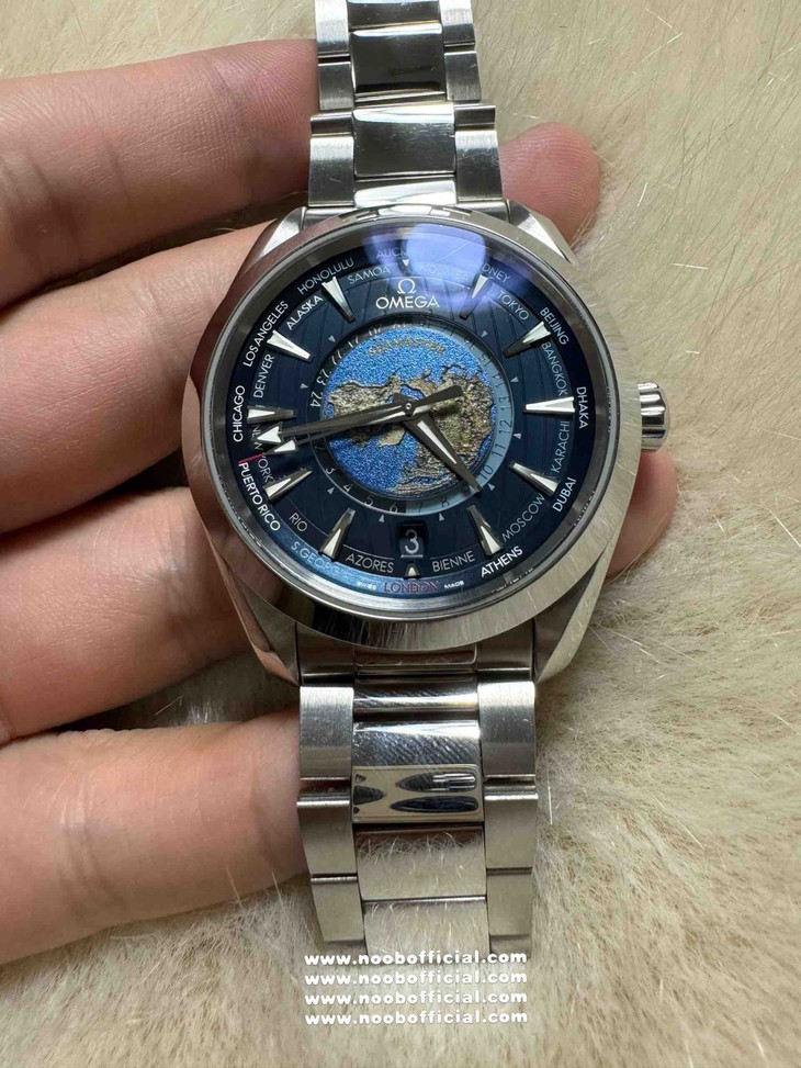 这款VS厂欧米茄世界时复刻表,首先从设计理念上就令人心动不已。它是一款真正意义上的世界时腕表,仿佛是为环游世界的梦想而生。当你第一眼看到表盘,就仿佛开启了一场环球之旅。表盘上通过激光烧蚀技术呈现出蓝色海洋,那深邃而迷人的蓝色,如同真实海洋般神秘莫测,每一道纹理都像是海浪的印记。而陆地则采用浮雕勾勒,细腻的线条和恰到好处的立体感,栩栩如生地展现出世界的轮廓。这种海陆结合的设计,不仅仅是一种装饰,更是对世界的一种艺术化呈现,让佩戴者在方寸之间就能感受到世界的辽阔。