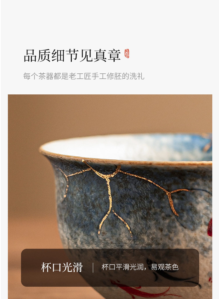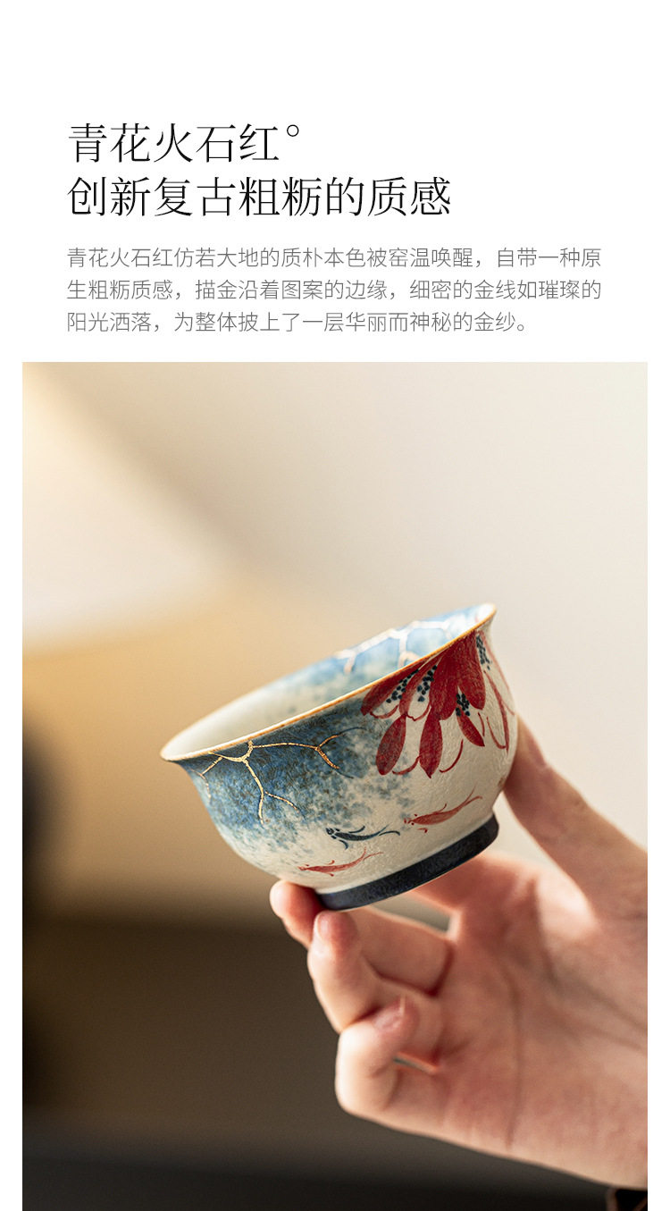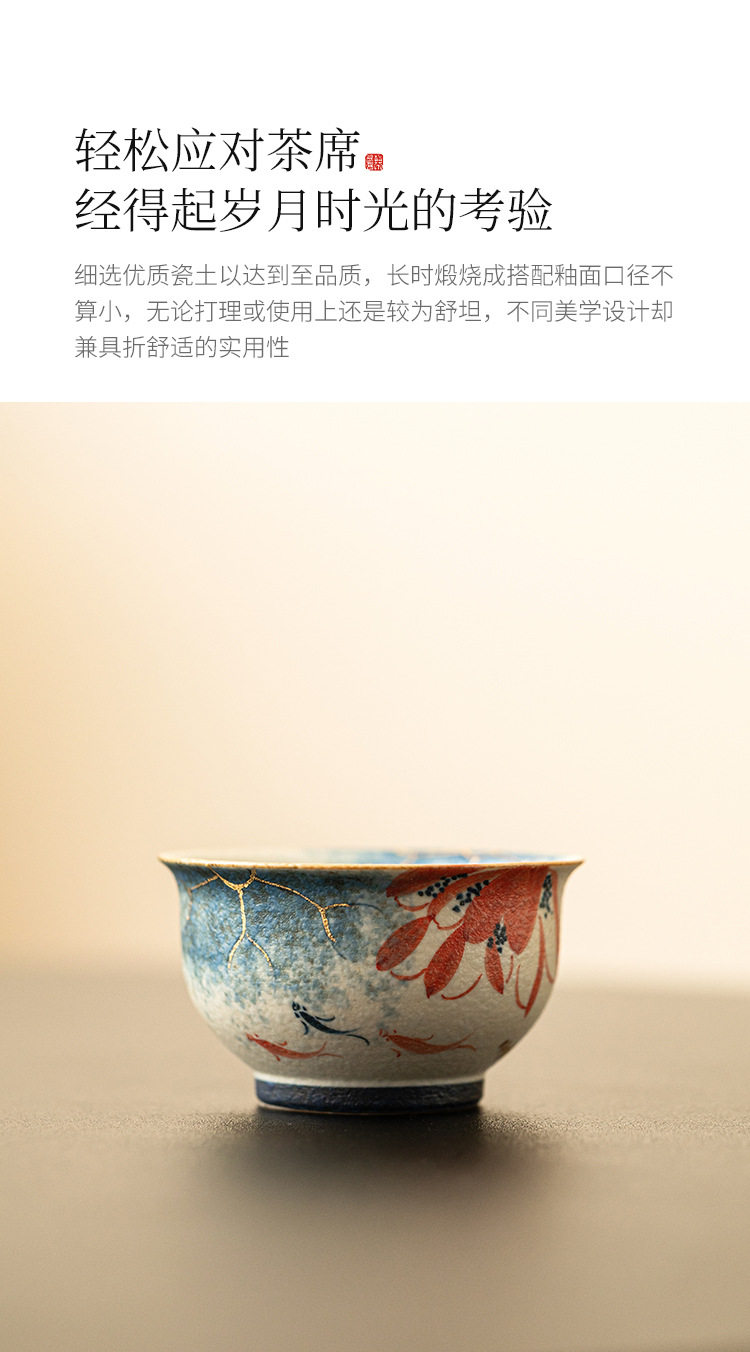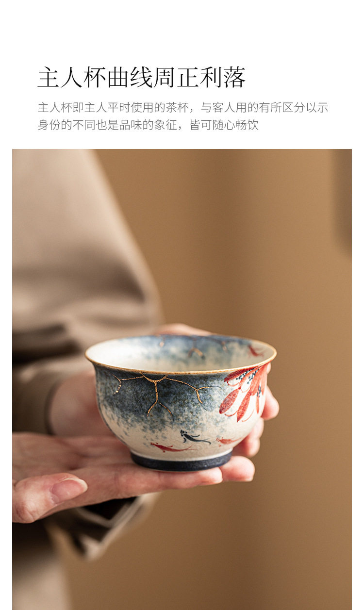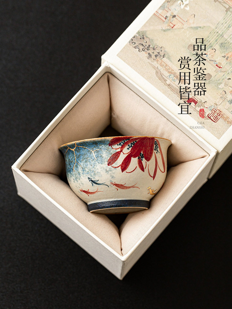 青花茶杯工厂手绘荷韵主人反口火石陶瓷杯红礼盒装描金品茗锦鲤杯