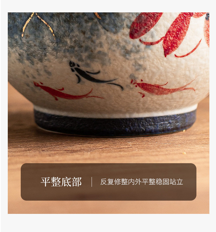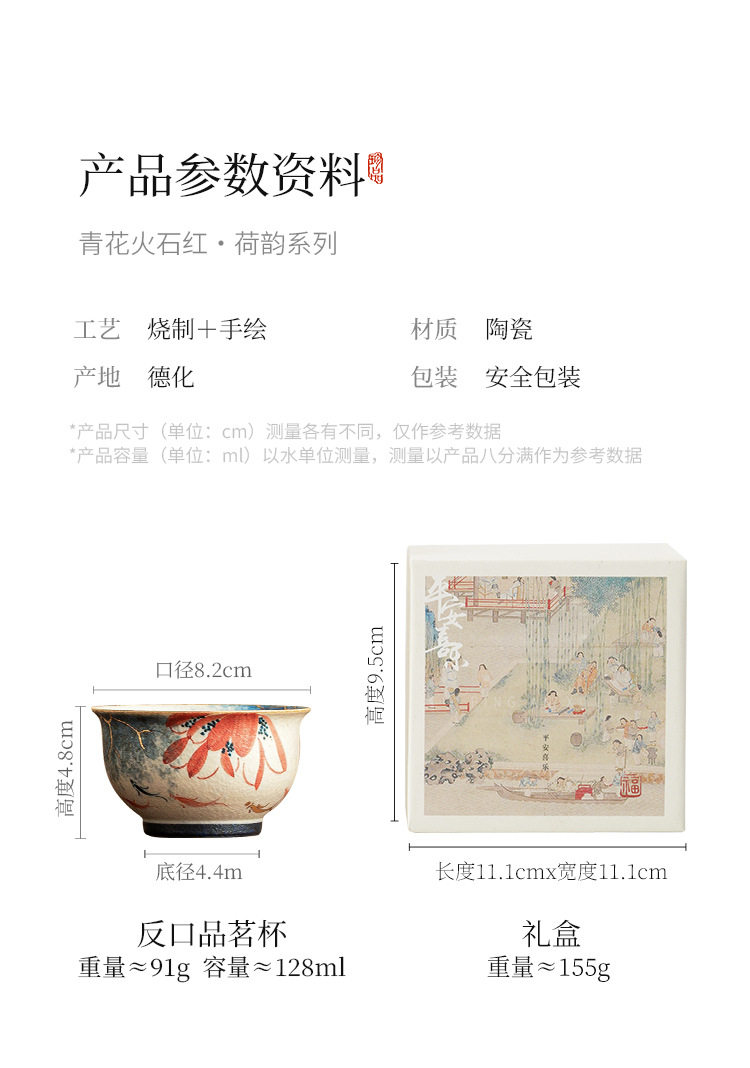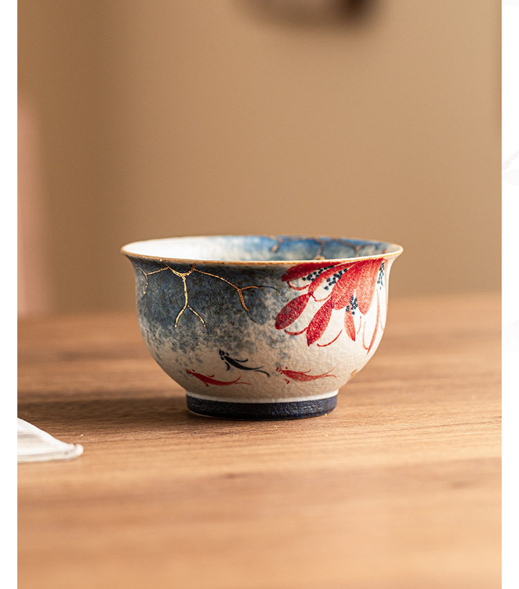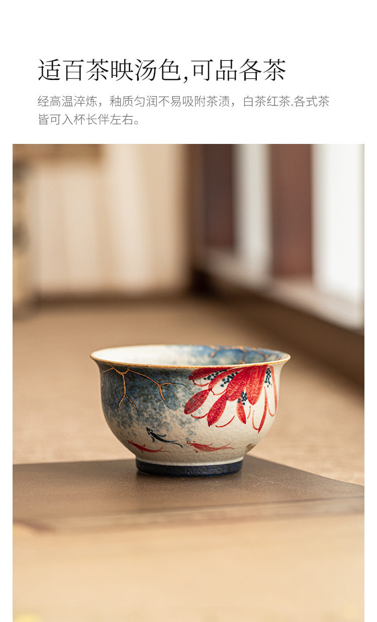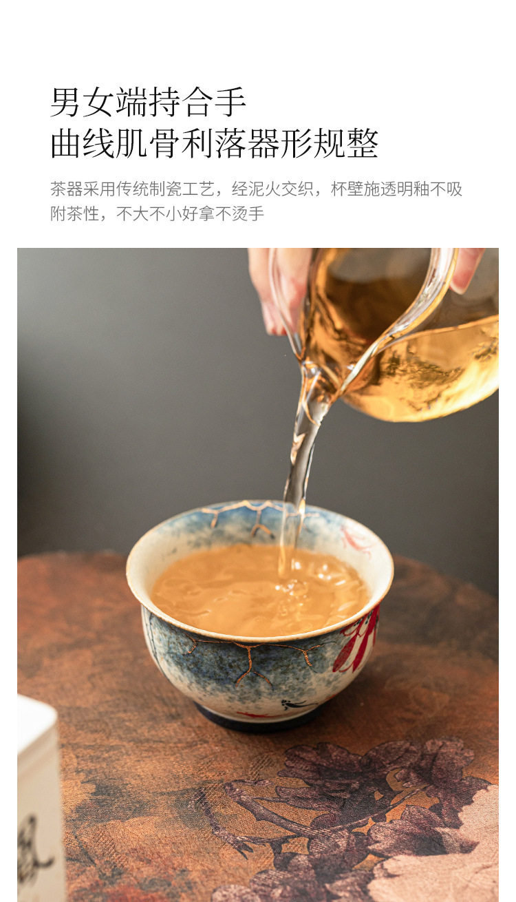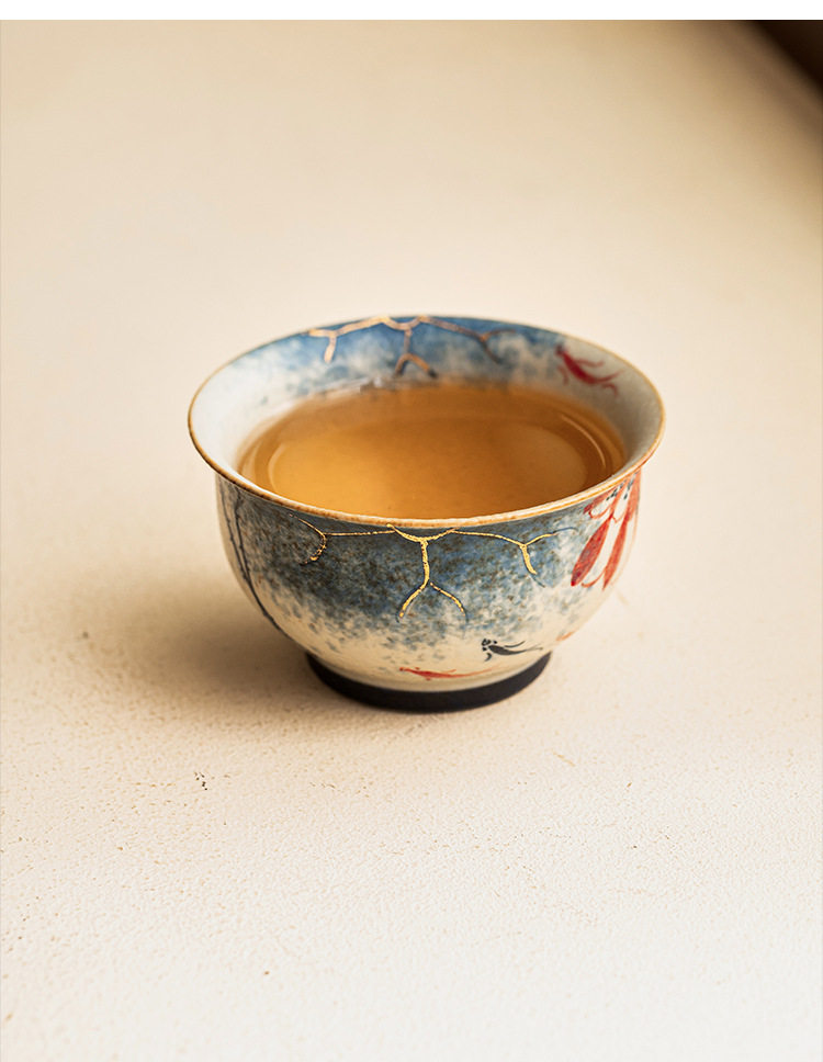 青花茶杯工厂手绘荷韵主人反口火石陶瓷杯红礼盒装描金品茗锦鲤杯