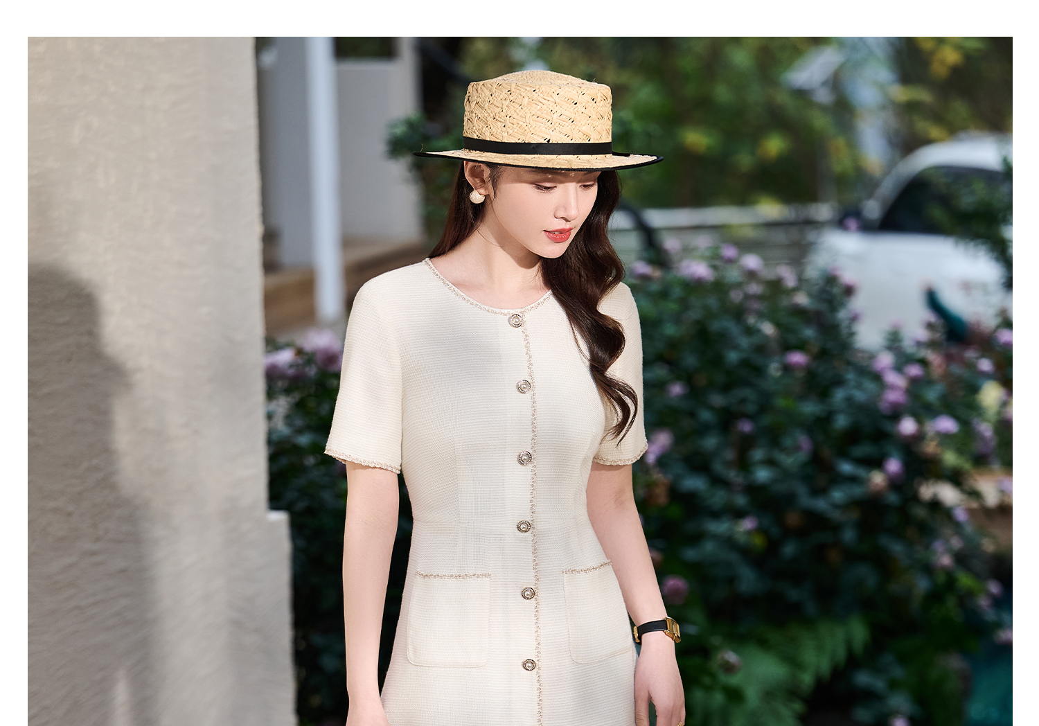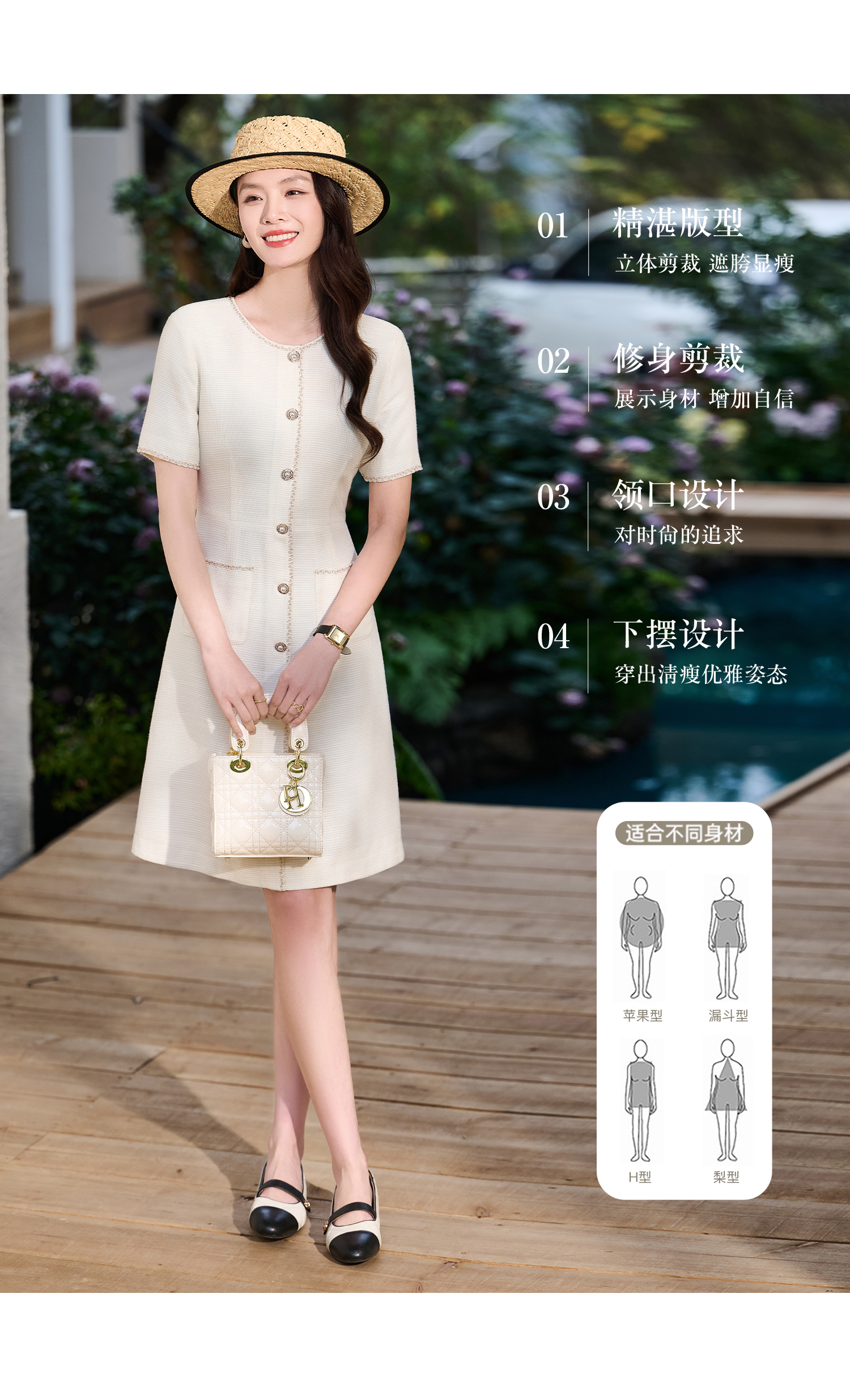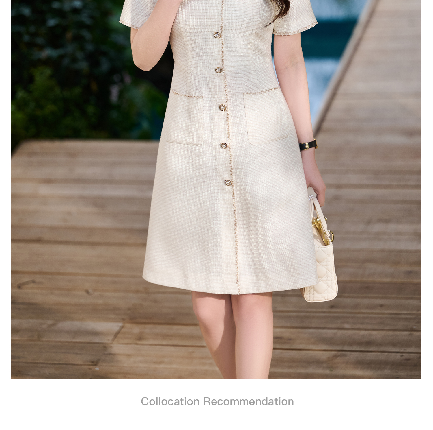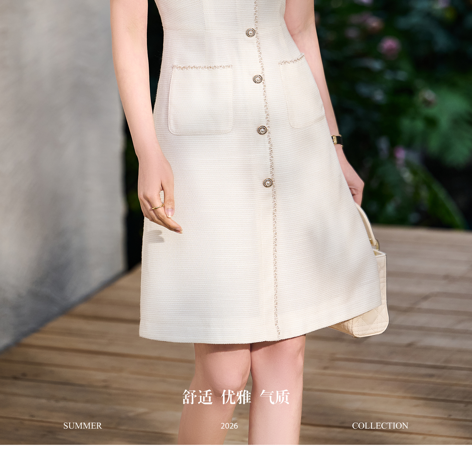米思阳2026春新款知性优雅小香风肌理感修身圆领短袖纽扣A字裙连衣裙女5986