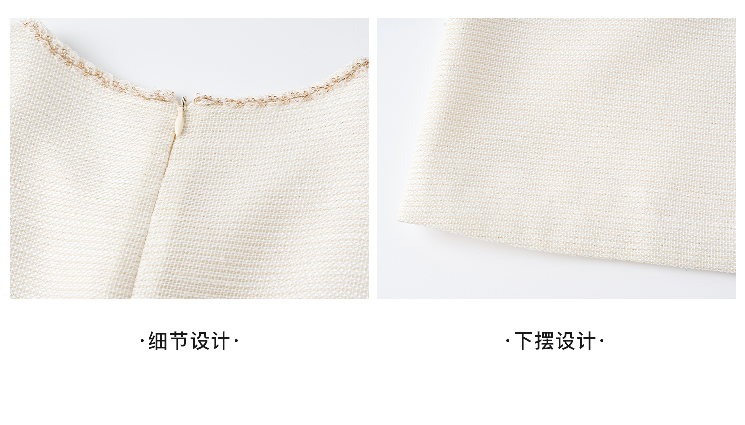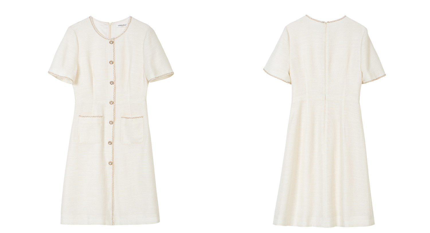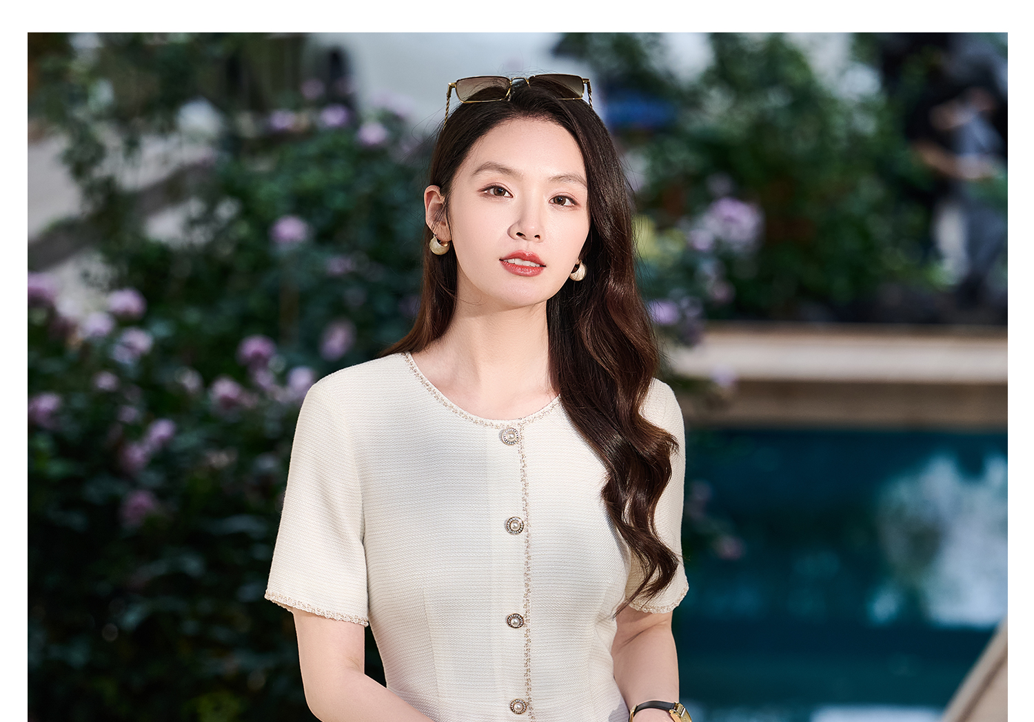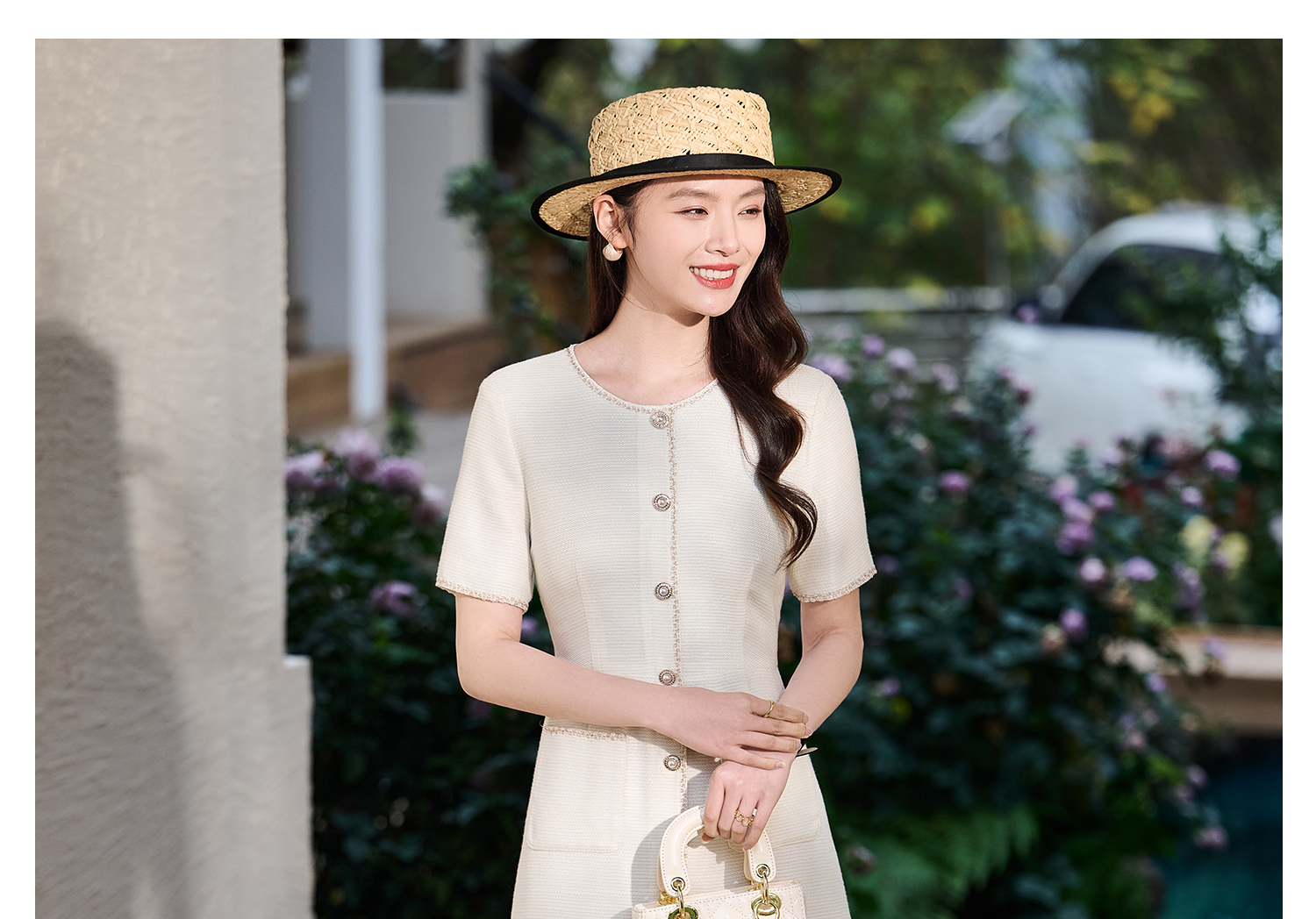 米思阳2026春新款知性优雅小香风肌理感修身圆领短袖纽扣A字裙连衣裙女5986