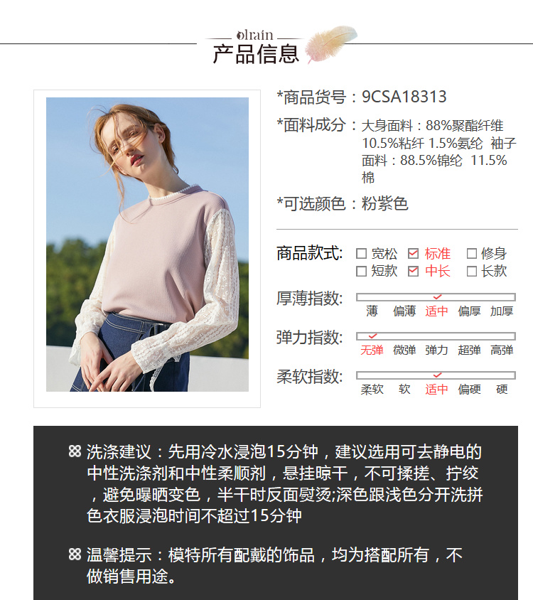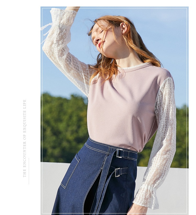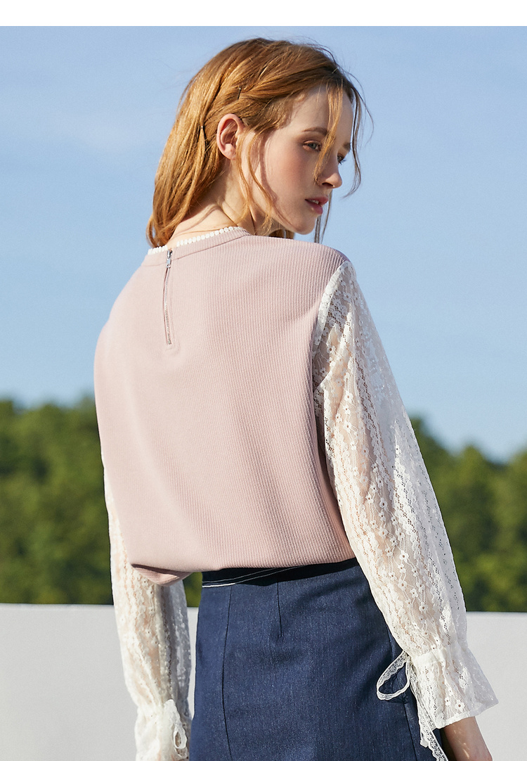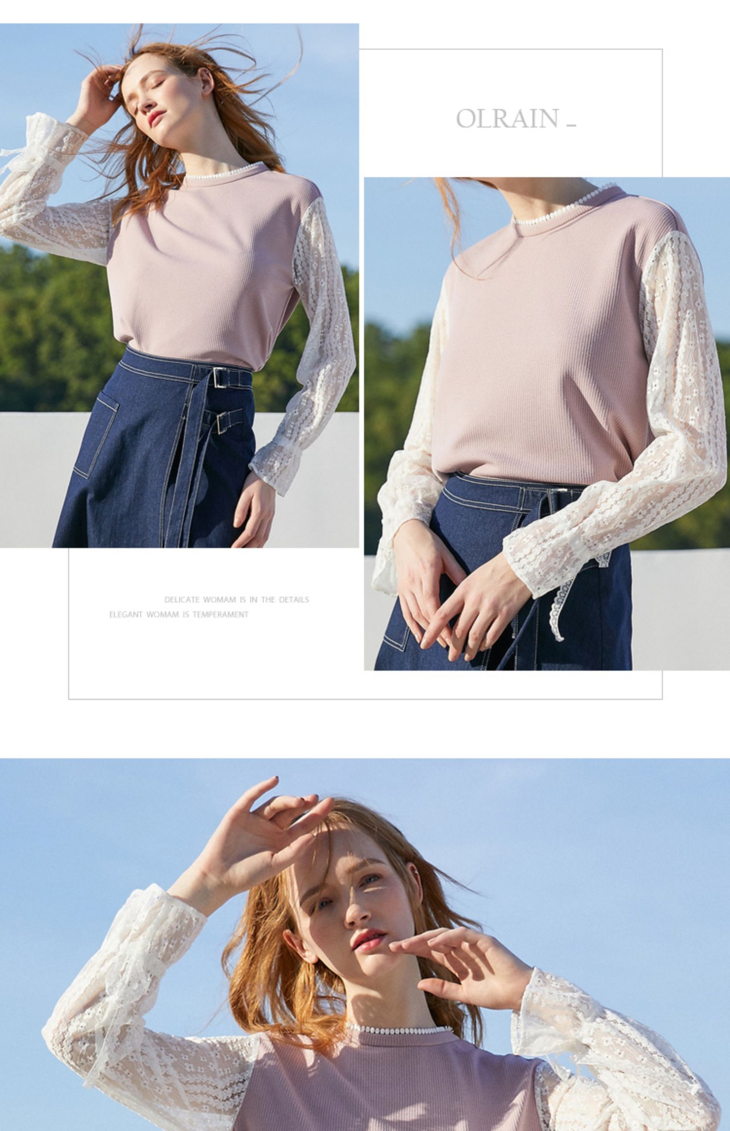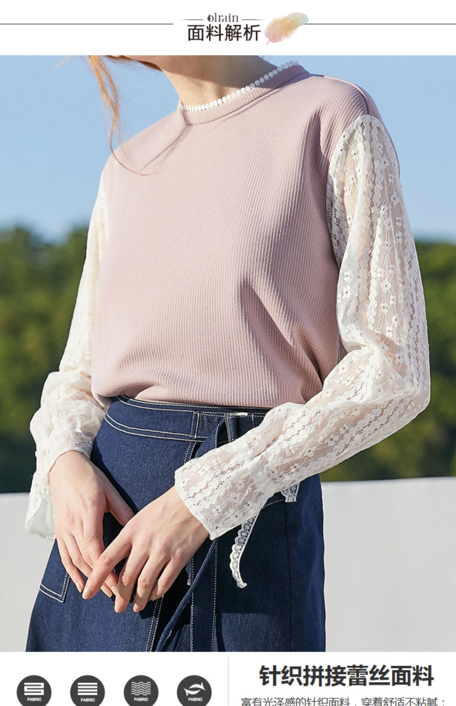 欧芮儿2019新款女装秋装套头圆领宽松粉色蕾丝拼接针织衫上衣打底
