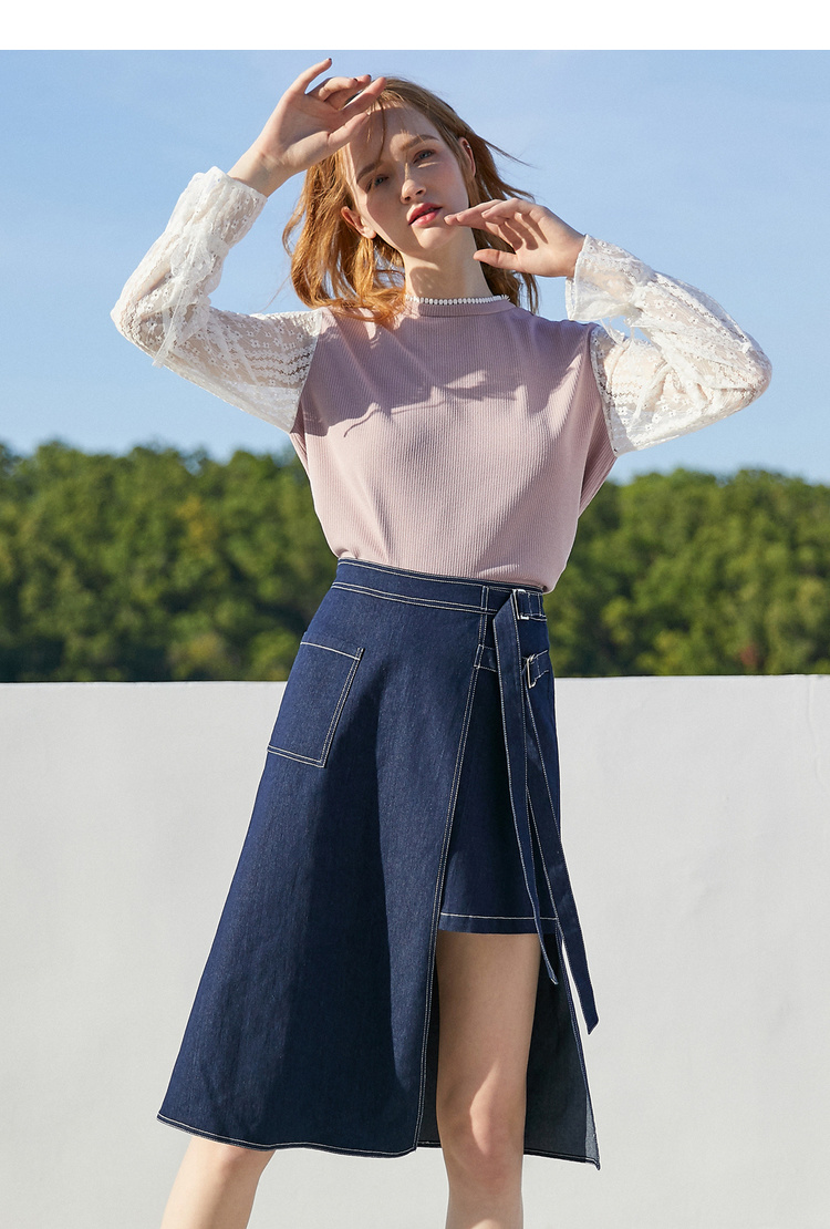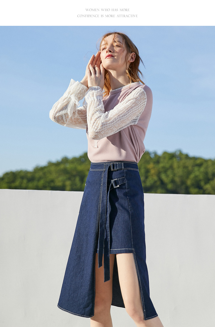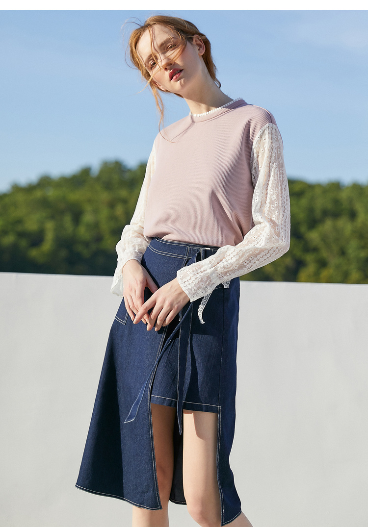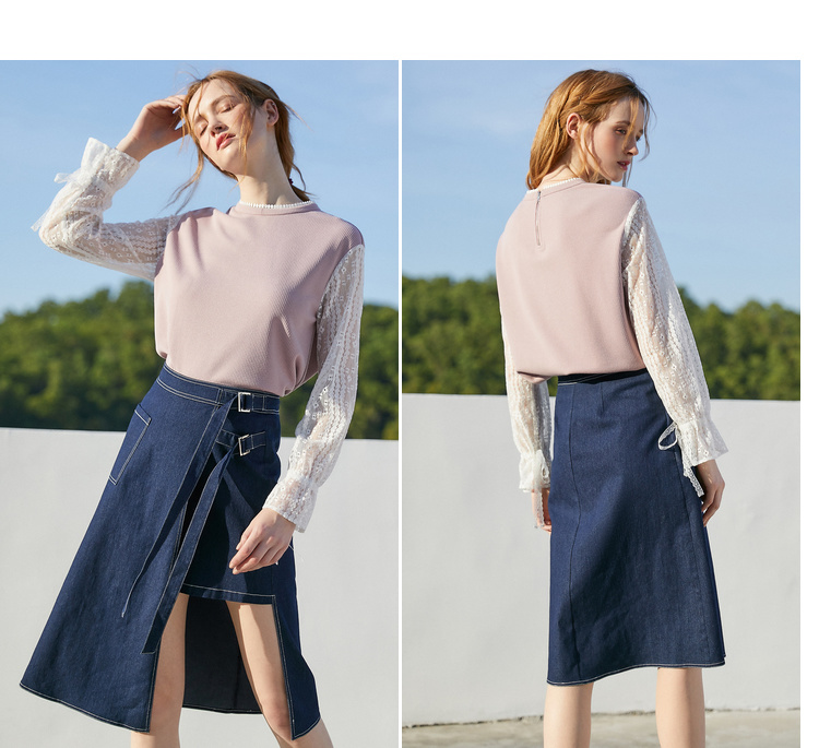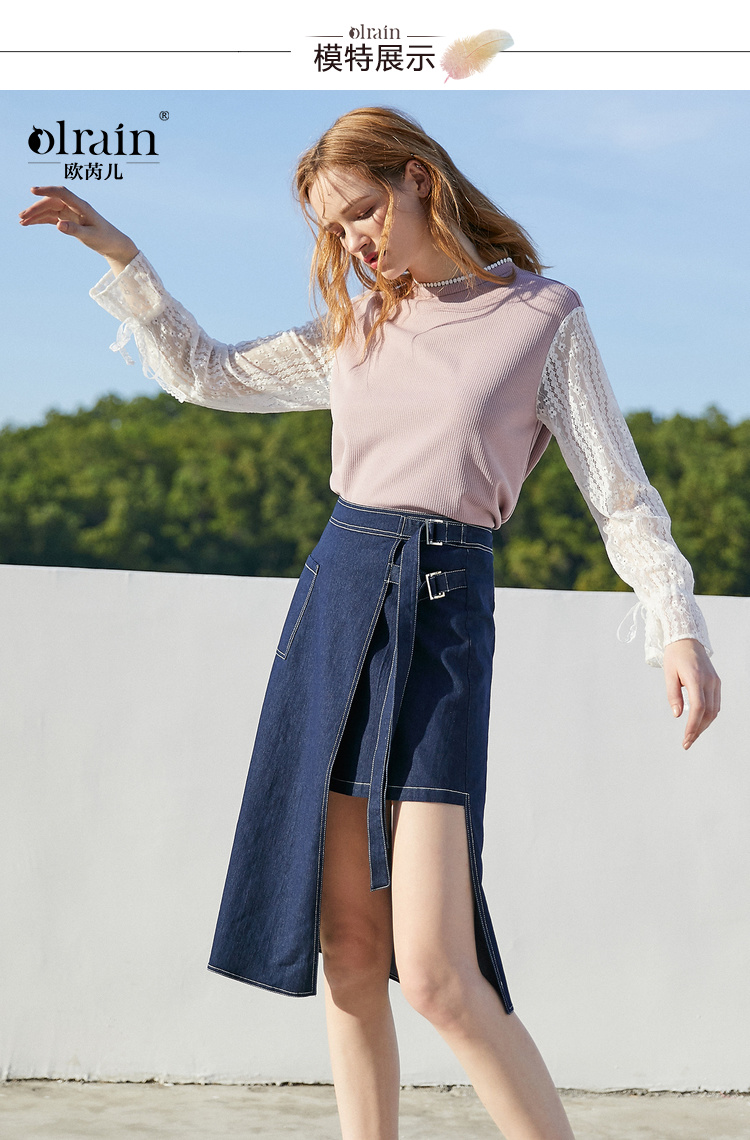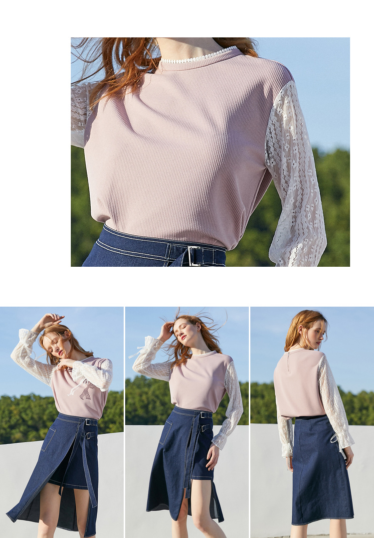 欧芮儿2019新款女装秋装套头圆领宽松粉色蕾丝拼接针织衫上衣打底
